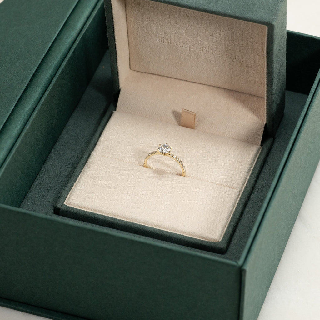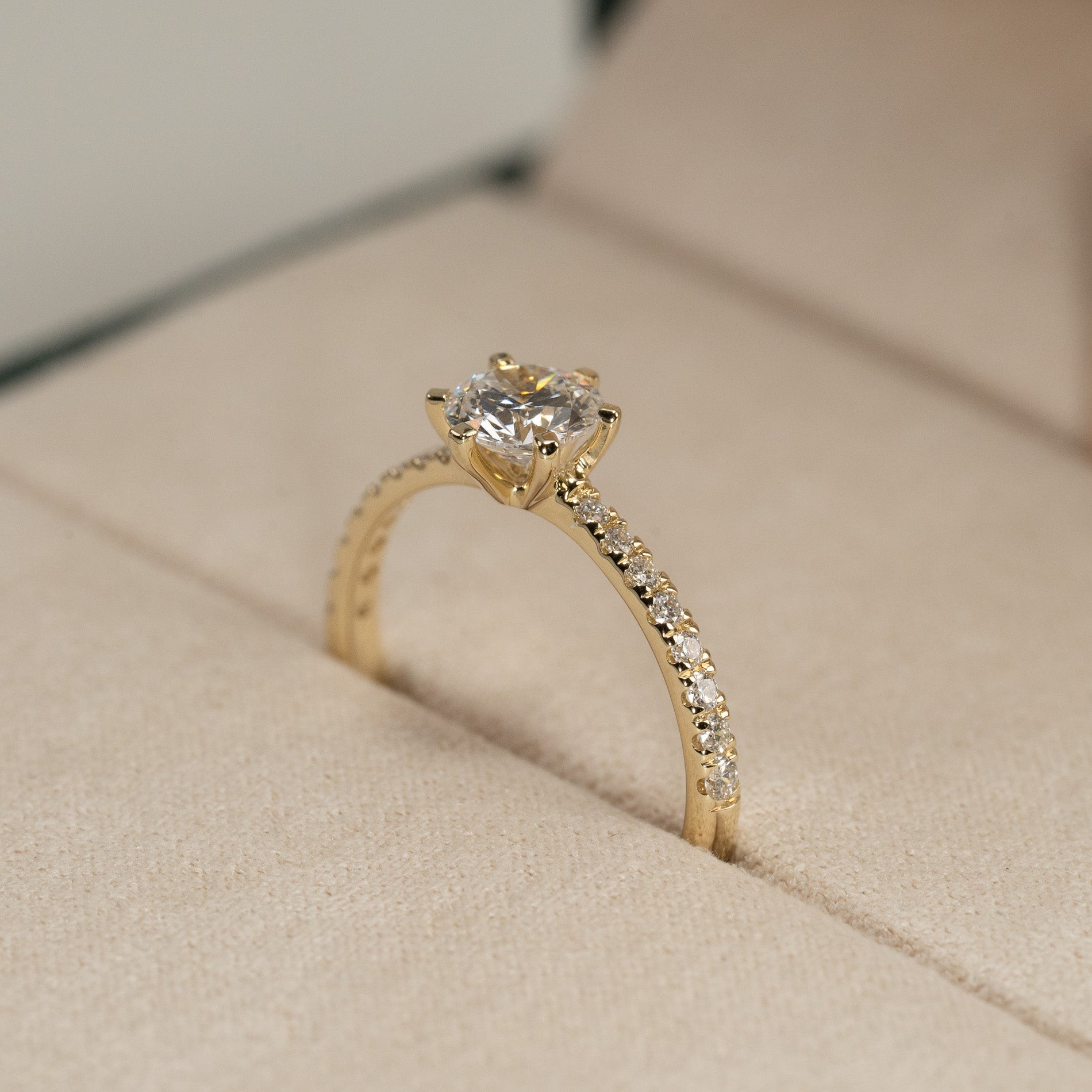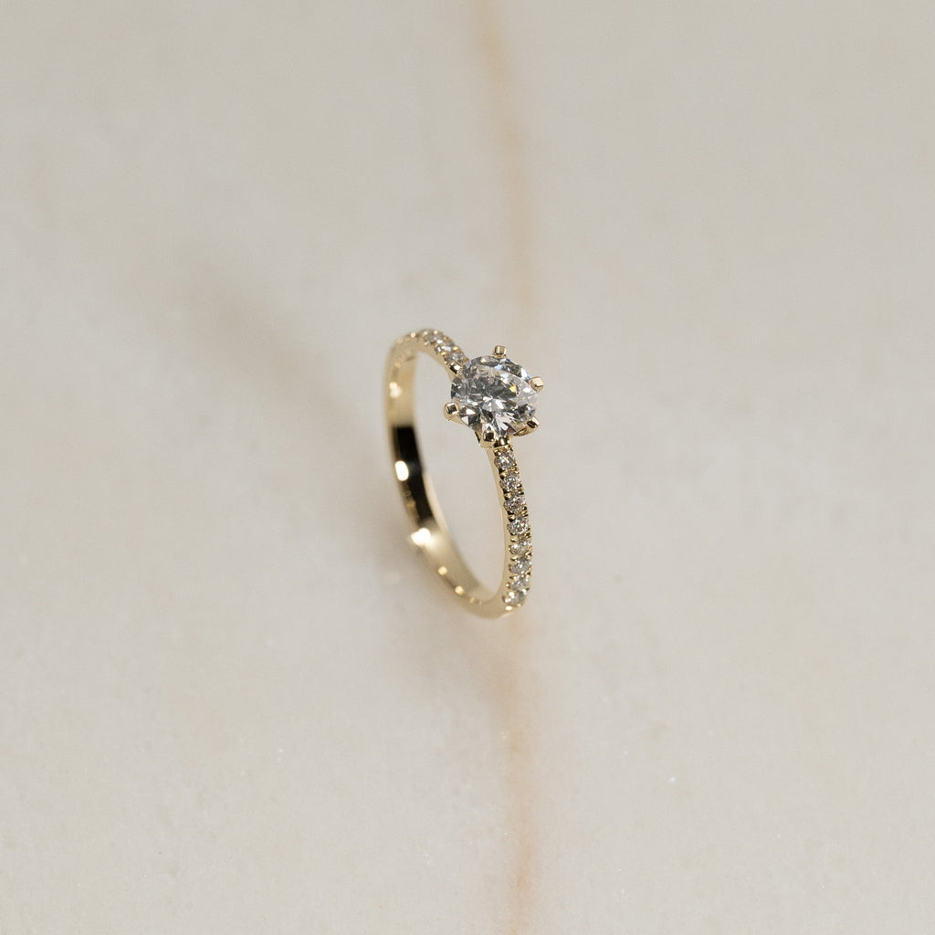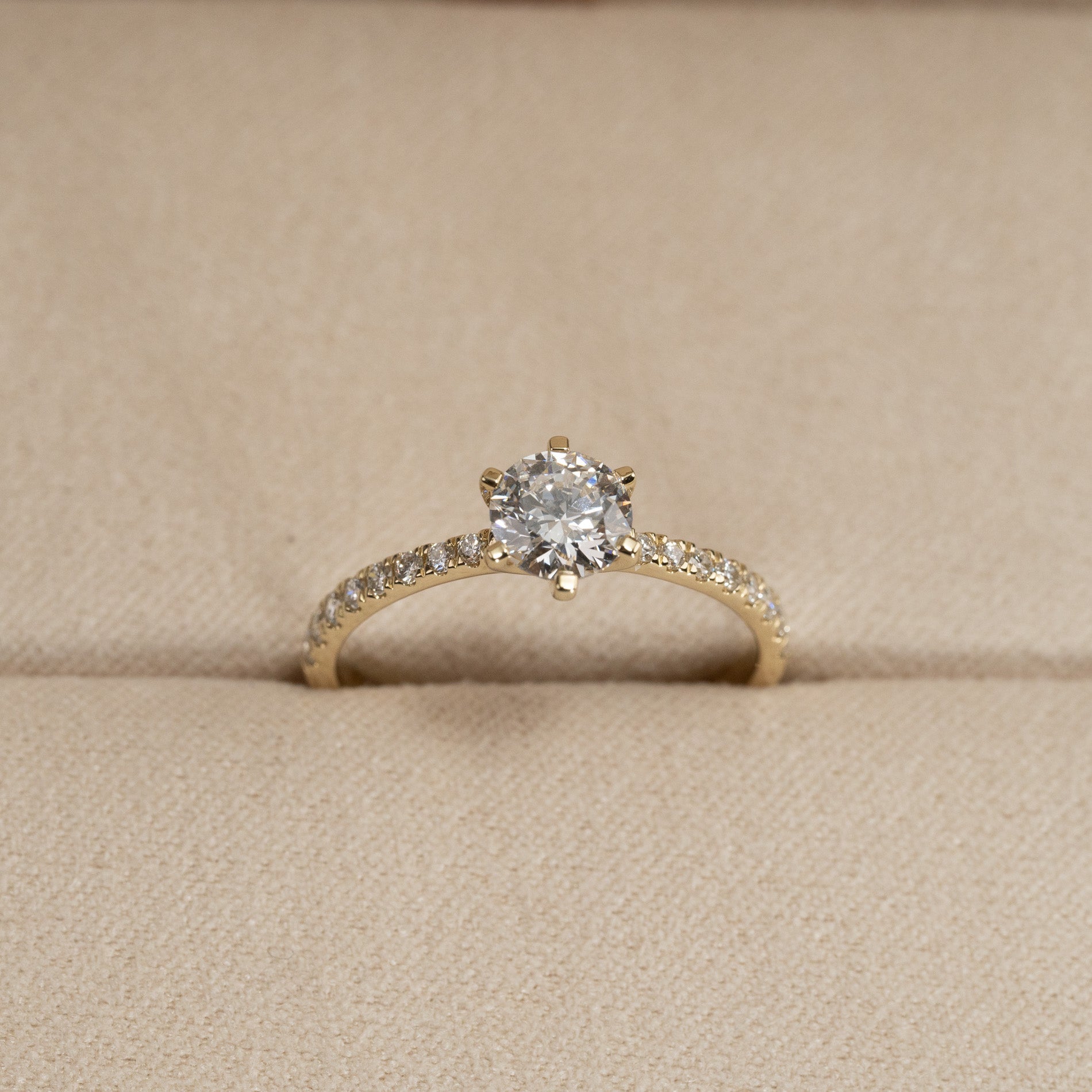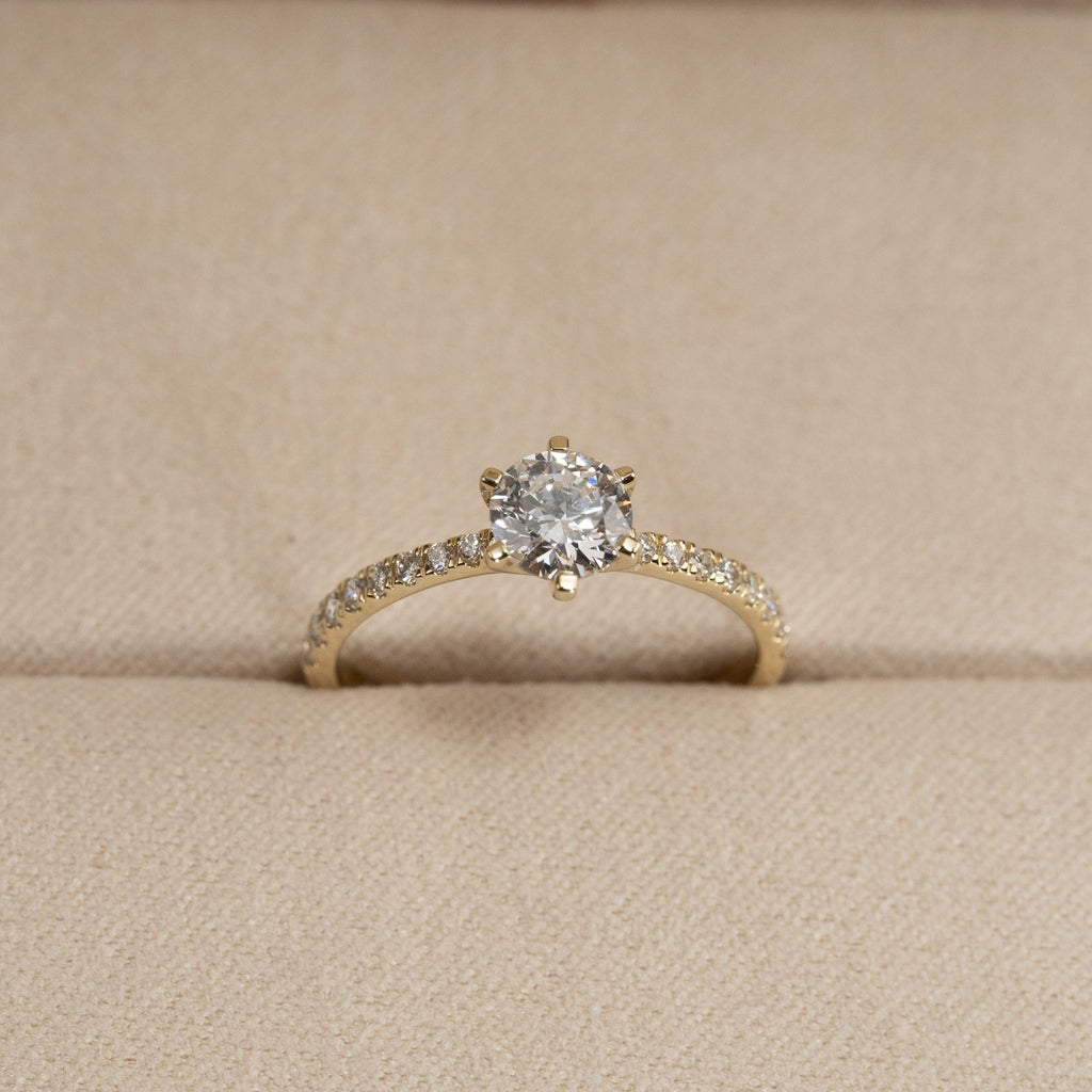 Vakker ring i 14 karat massivt gull med lab-dyrkede diamanter. Ringen består av en sentersten på 0,75 ct. i en omfatning med 6 griper. Den er besatt med diamanter nedover ringskinnen. Ringskinnen er litt tapered - dvs. den er bredere nederst og slankere på toppen av stenen. En fin detalj som gir balanse til ringen og letthet i designet.