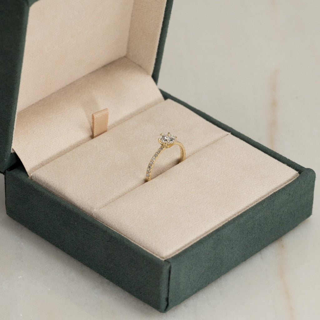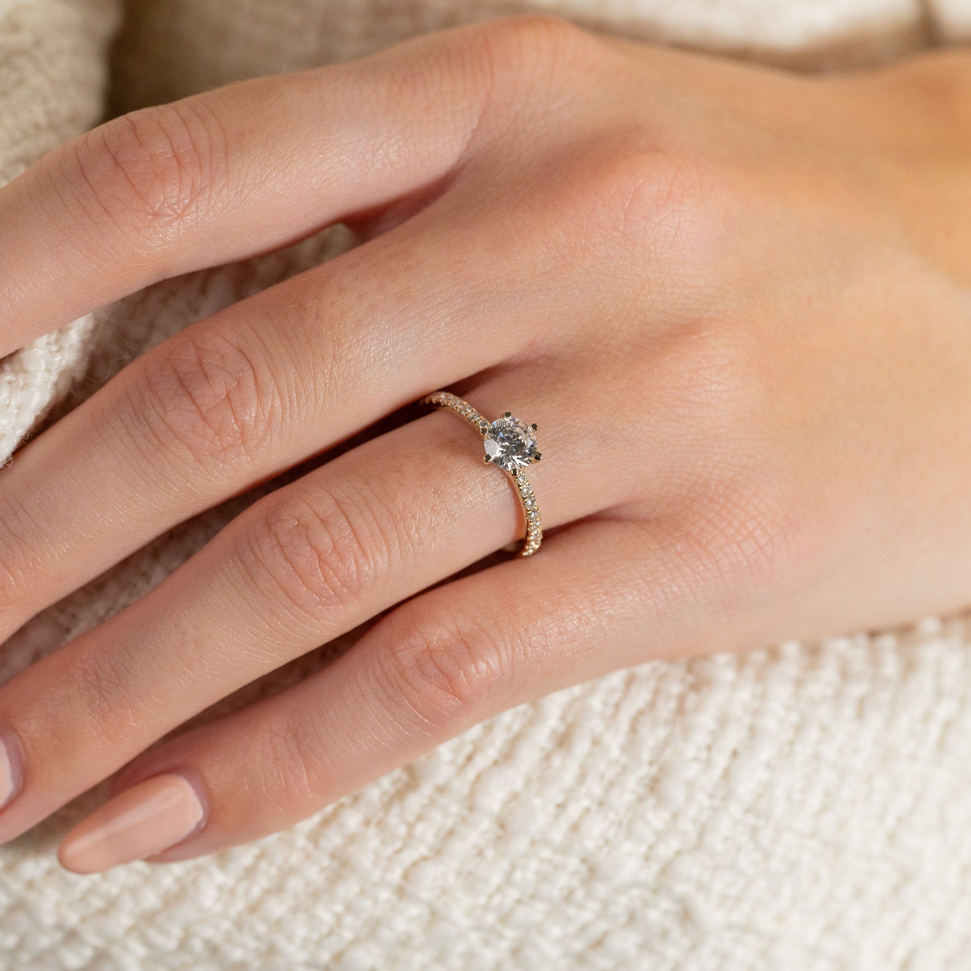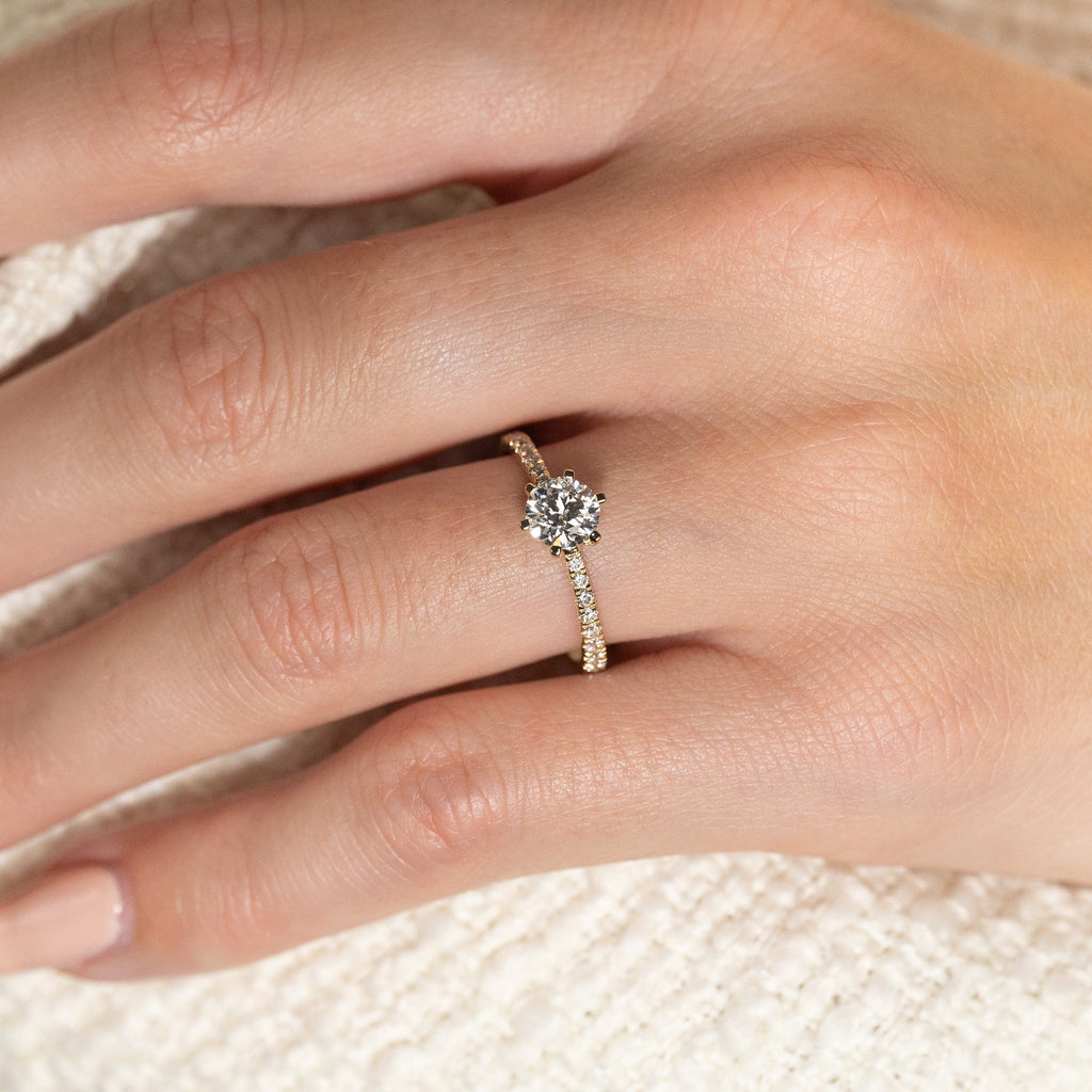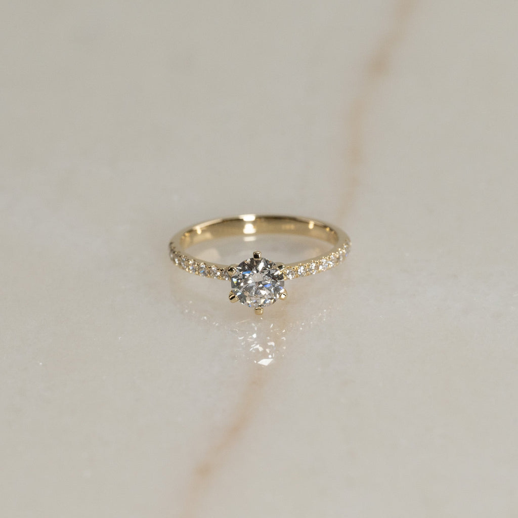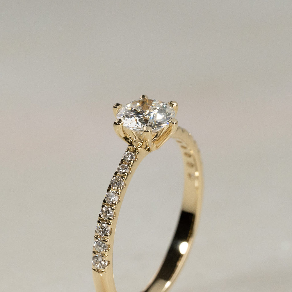Vakker ring i 14 karat massivt gull med lab-dyrkede diamanter. Ringen består av en sentersten på 0,75 ct. i en omfatning med 6 griper. Den er besatt med diamanter nedover ringskinnen. Ringskinnen er litt tapered - dvs. den er bredere nederst og slankere på toppen av stenen. En fin detalj som gir balanse til ringen og letthet i designet.