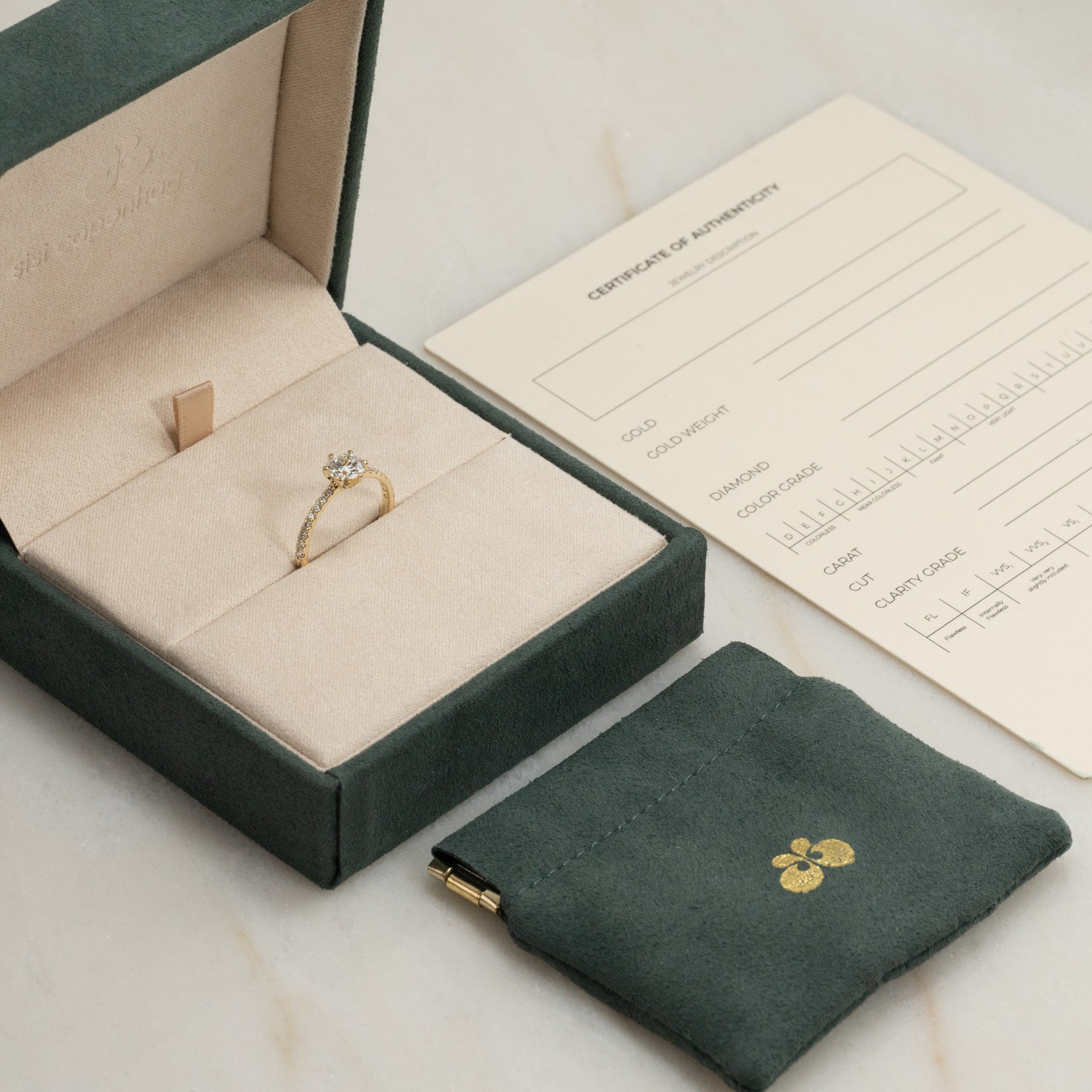 Når du mottar smykket, vil det være i vår gaveeske, bundet med et vakkert matchende silkebånd, klar til å gis som gave. Inne i esken finner du en smykkeboks, en pose og et ekthetsbevis.