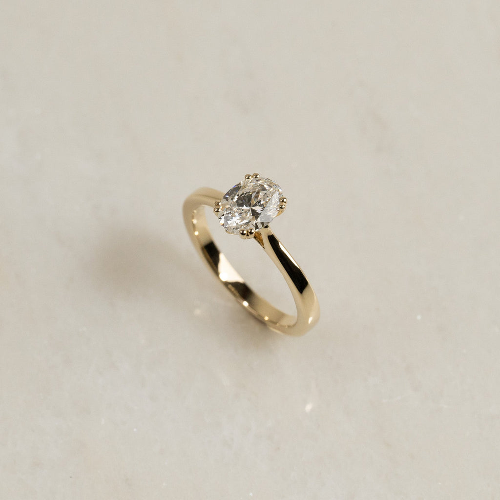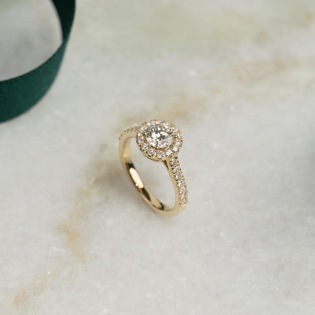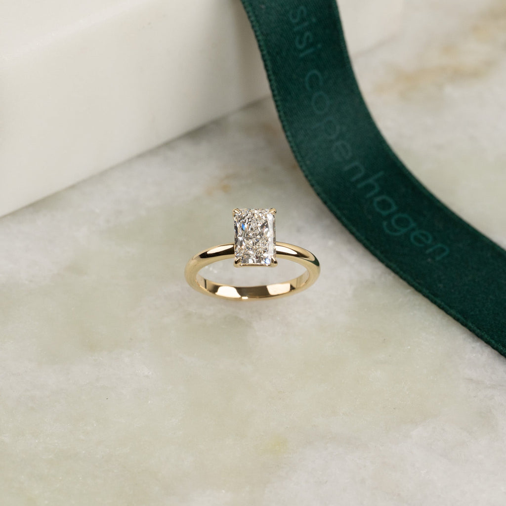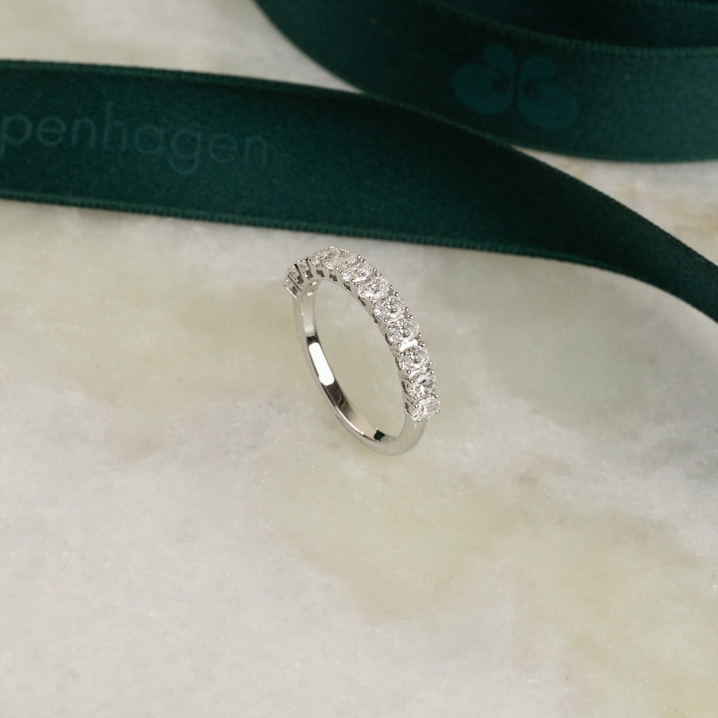 Ringen er i 14 karat massivt gull med etiske laboratoriedyrkede diamanter på totalt 0,9 ct. Diamantene har fargen E/F (River) og klarheten VVS. Smykket er laget med omhu; diamantene er produsert med blant annet solenergi, og gullet er 100% sertifisert resirkulert.