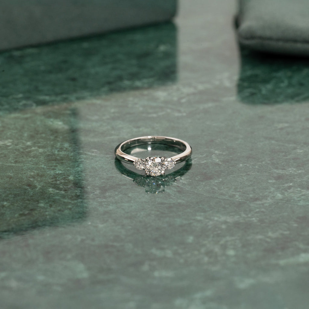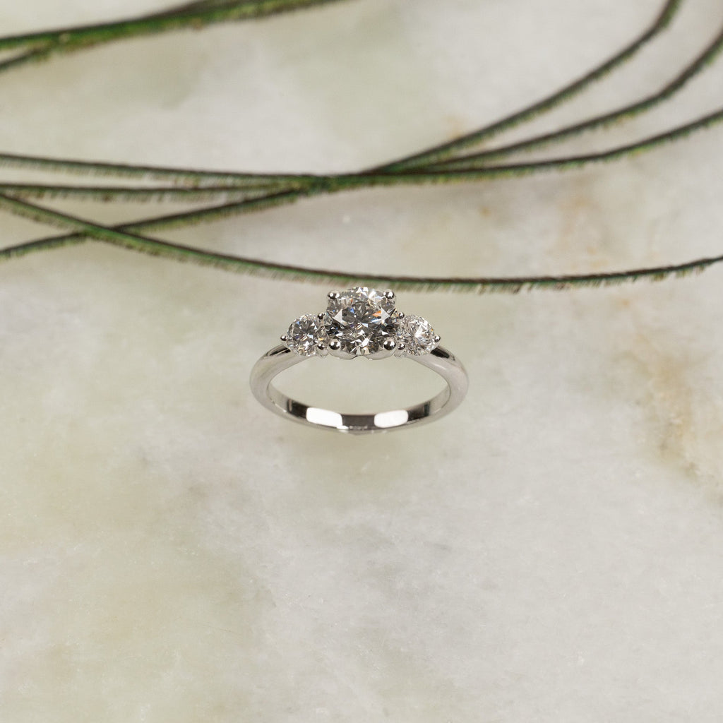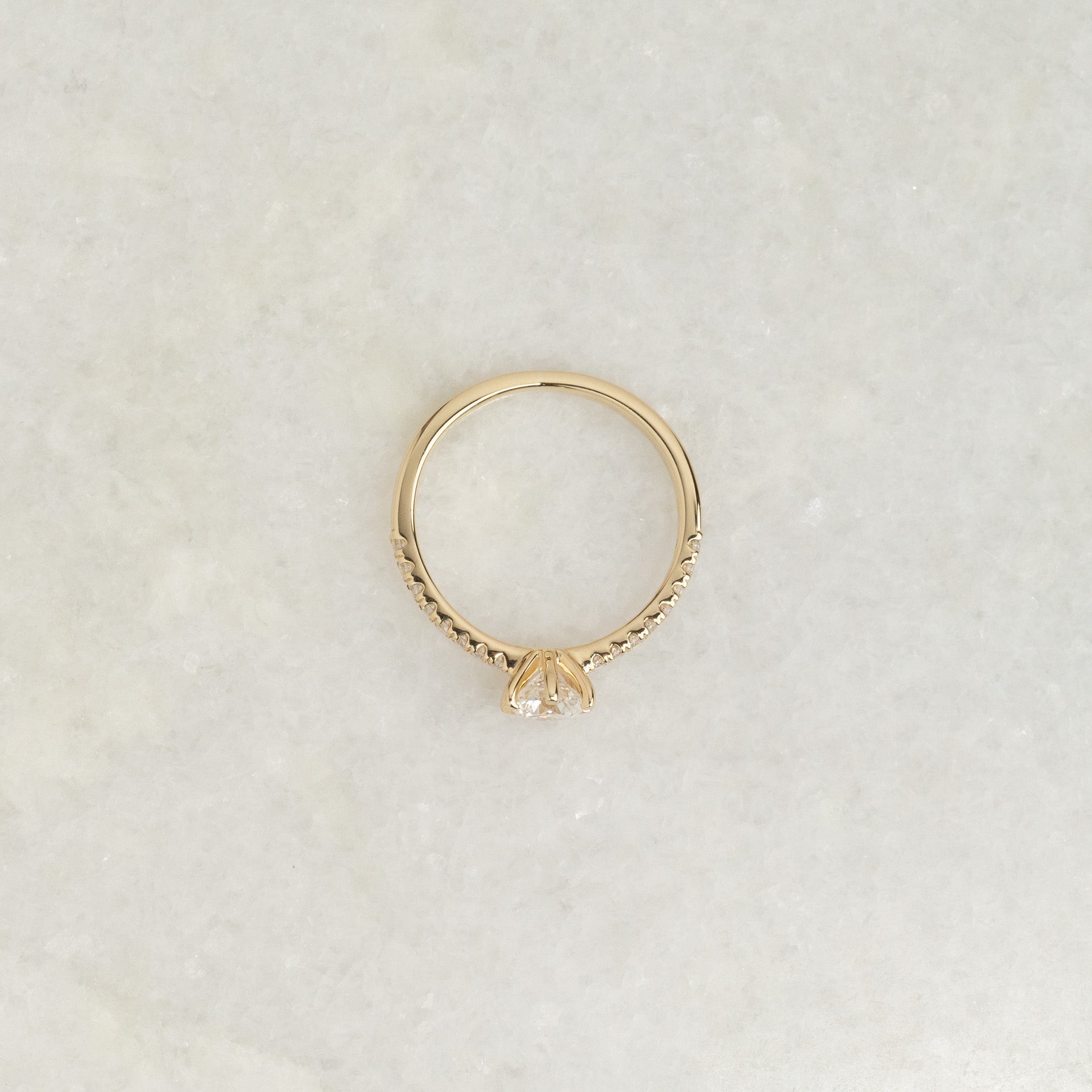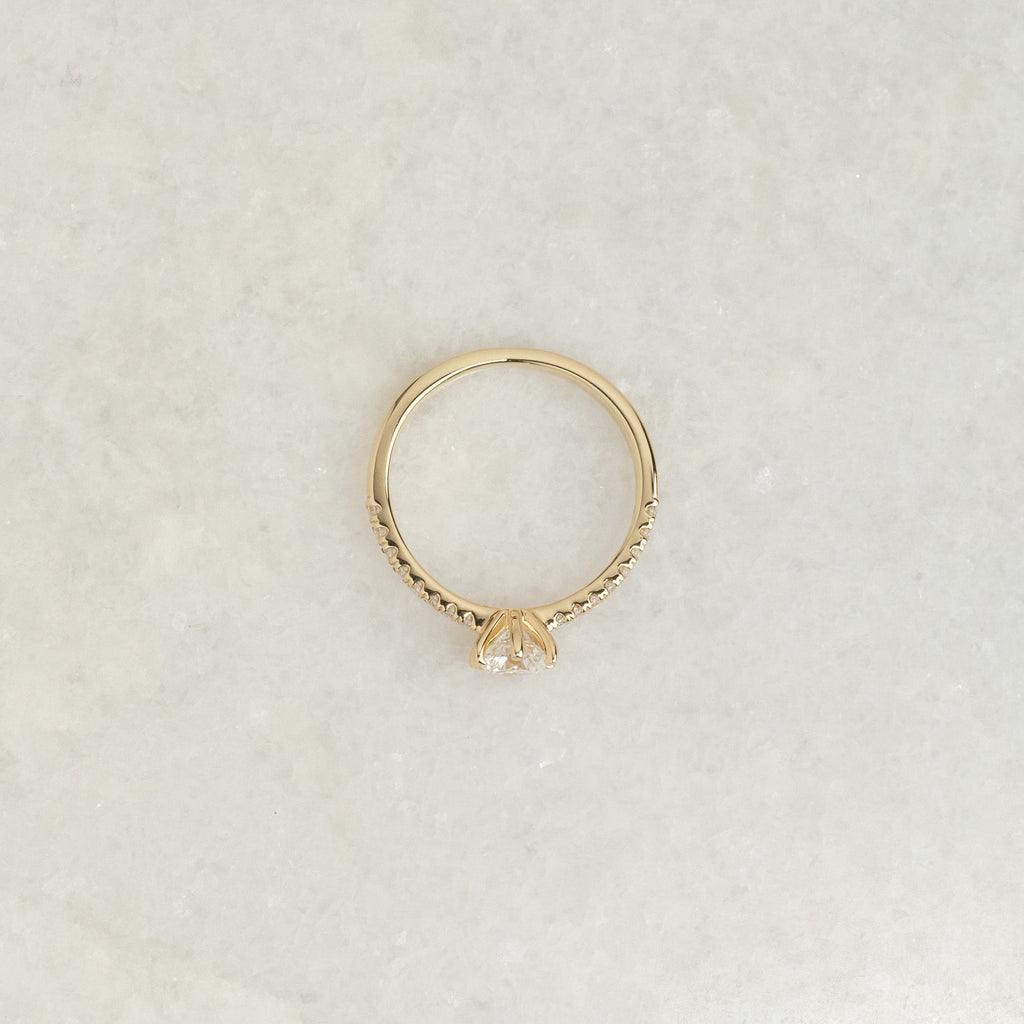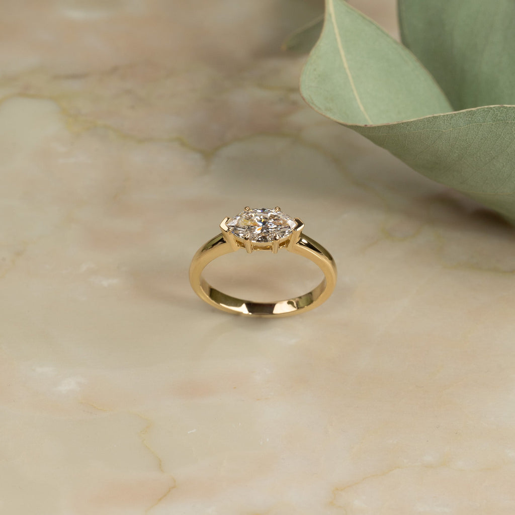 Ringen er i 14 karat massivt gull med etiske laboratoriedyrkede diamanter på totalt 0,9 ct. Diamantene har fargen E/F (River) og klarheten VVS. Smykket er laget med omhu; diamantene er produsert med blant annet solenergi, og gullet er 100% sertifisert resirkulert.