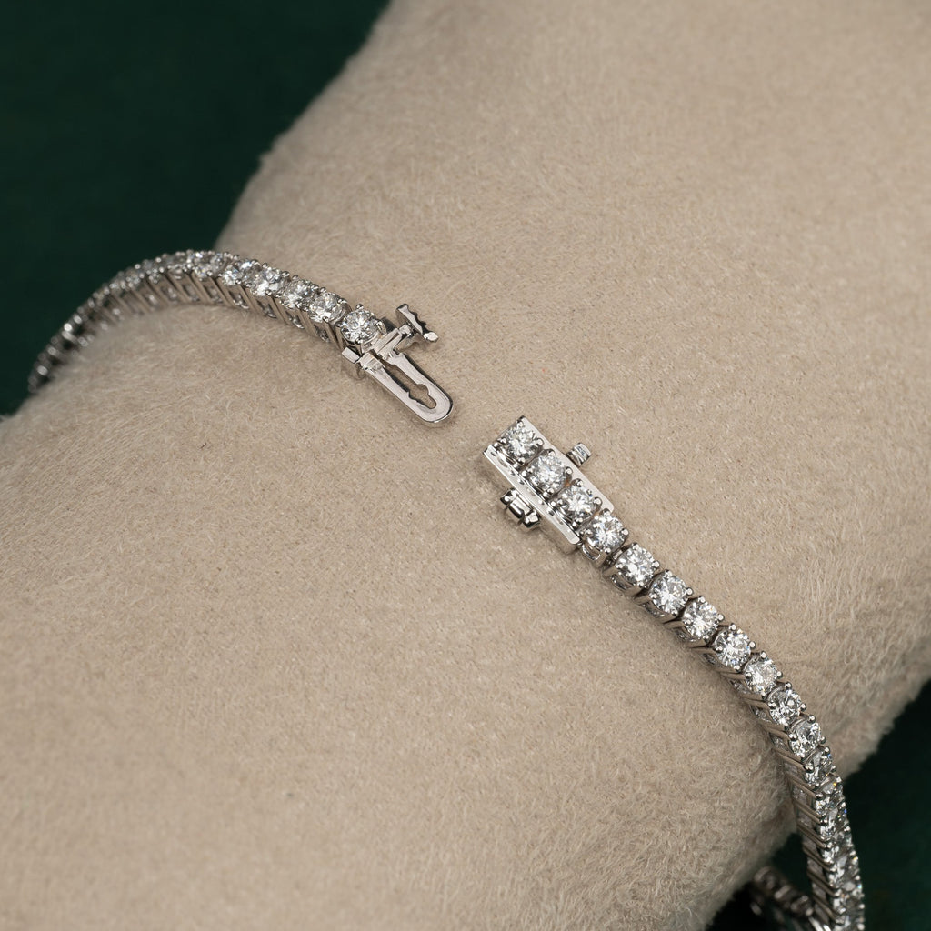 Tennisarmbåndet er satt med diamanter hele veien rundt, inkludert på låsen. Det er et klassisk, elegant og ikonisk smykkedesign, og det perfekte valget hvis du ønsker et feminint og luksuriøst smykke hvor både kvalitet og uttrykk er uten kompromisser. Armbåndet har en moderne lås med en sikkerhetsmekanisme som reduserer risikoen for at armbåndet åpnes og tapes bort.