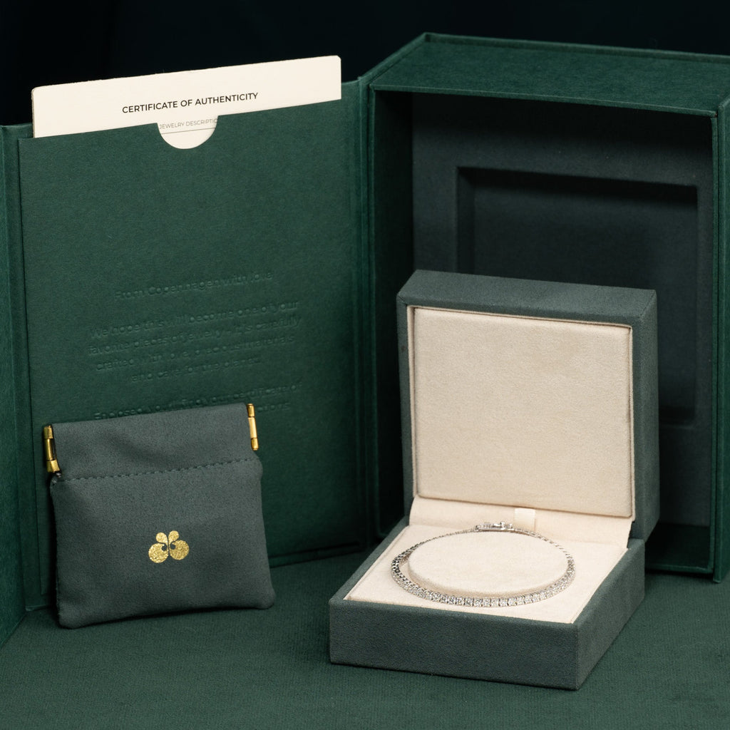 Når du mottar smykket, vil det være i vår gaveeske, bundet med et vakkert matchende silkebånd, klar til å gis som gave. Inne i esken finner du en smykkeboks, en pose og et ekthetsbevis.