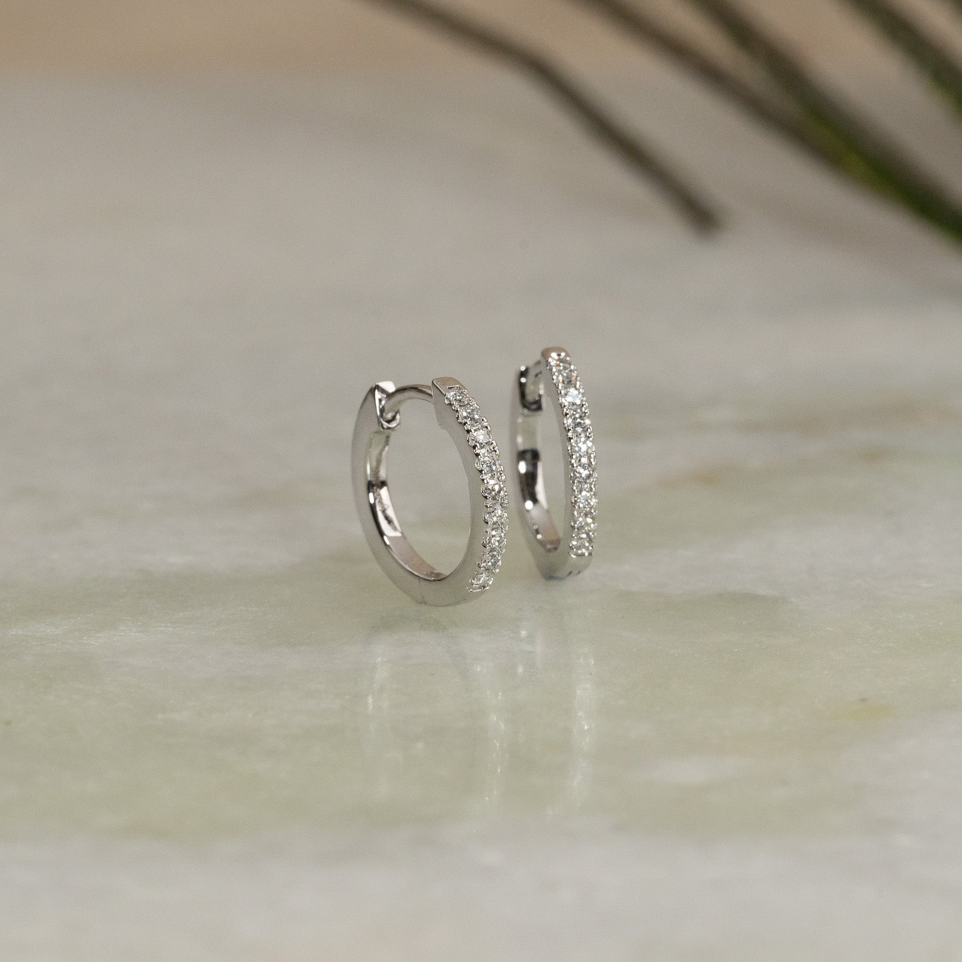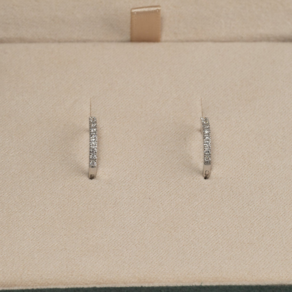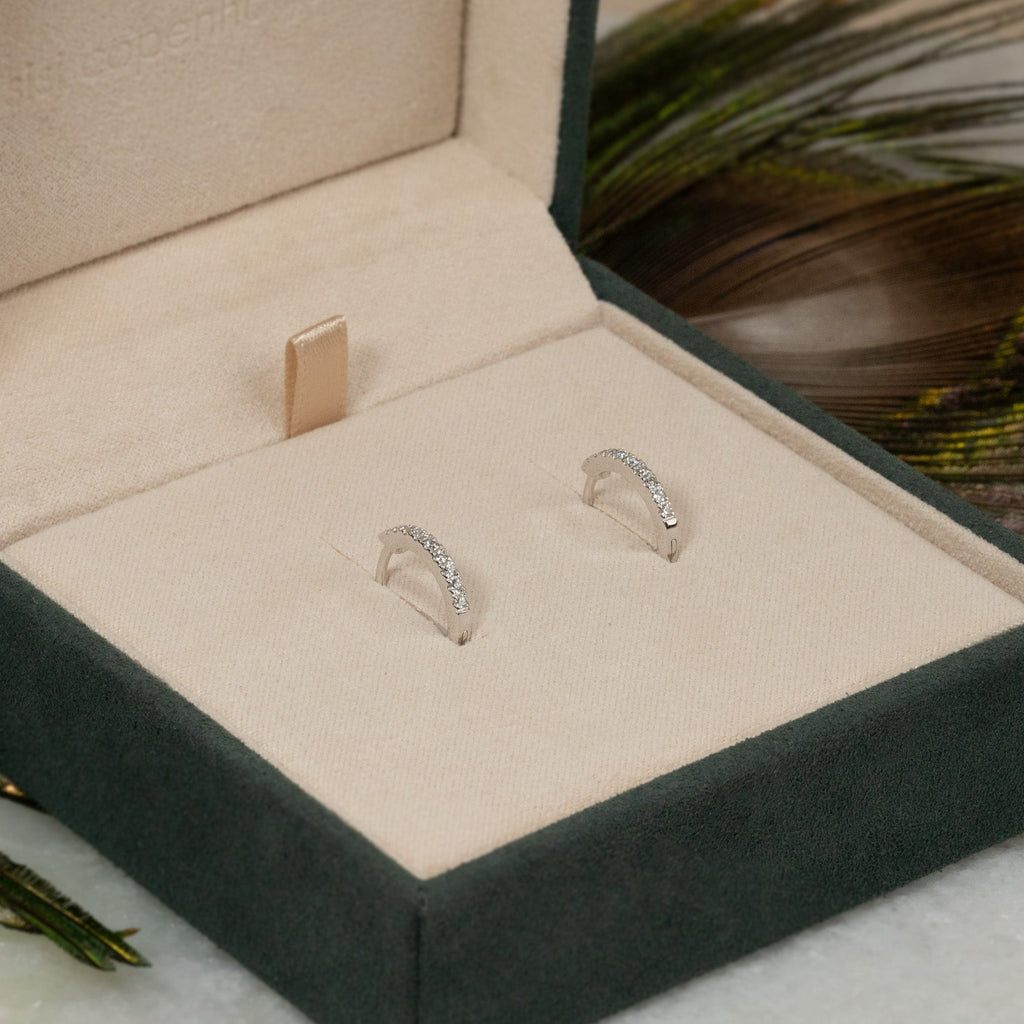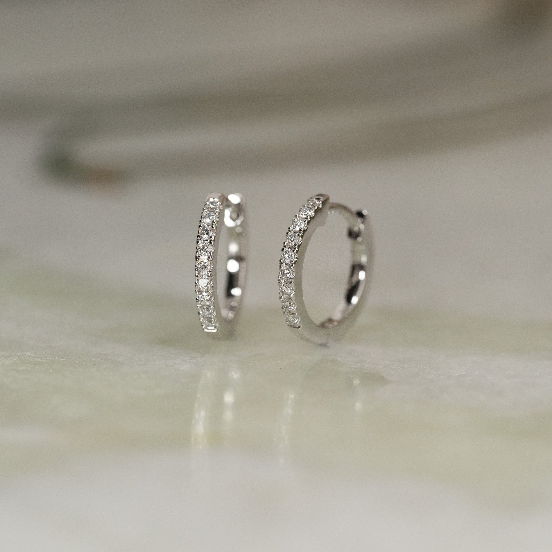 Klassiske diamantcreoler laget i 14 karat massivt hvitt gull med totalt 20 lab-grown diamanter med en vekt på 0,15 ct. Diamantene har fargen E/F (River) og klarheten VVS. Smykket er laget med omhu; diamantene er produsert med blant annet solenergi, og gullet er 100 % sertifisert resirkulert.