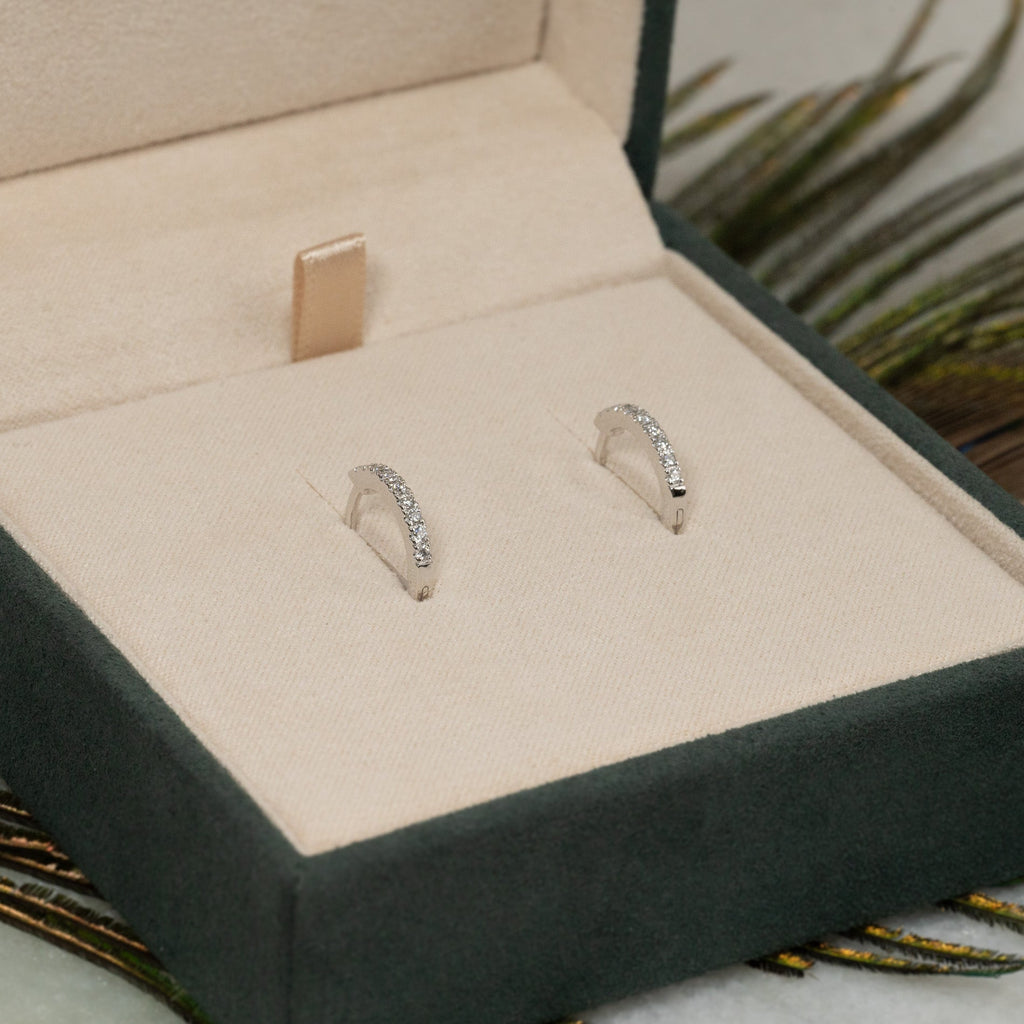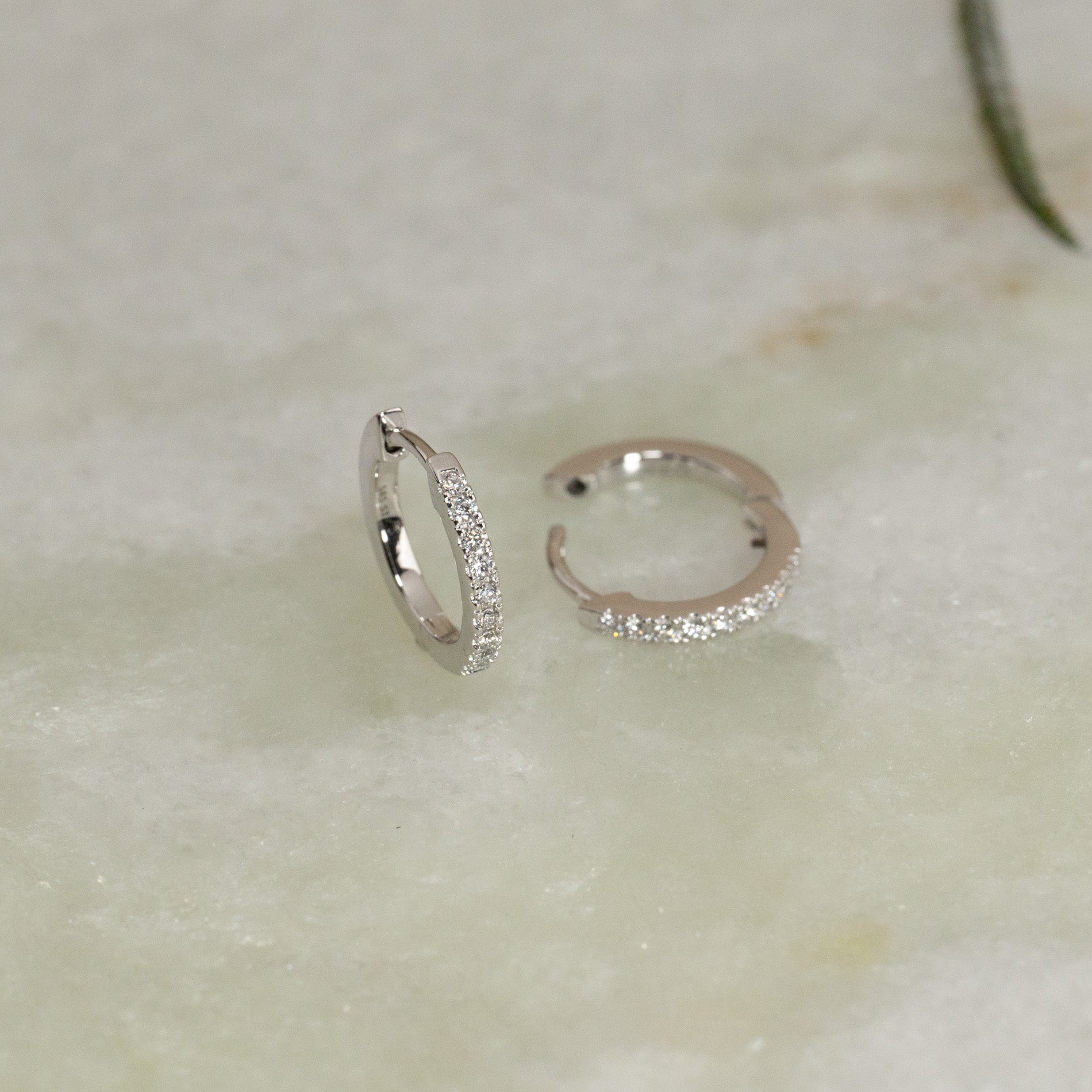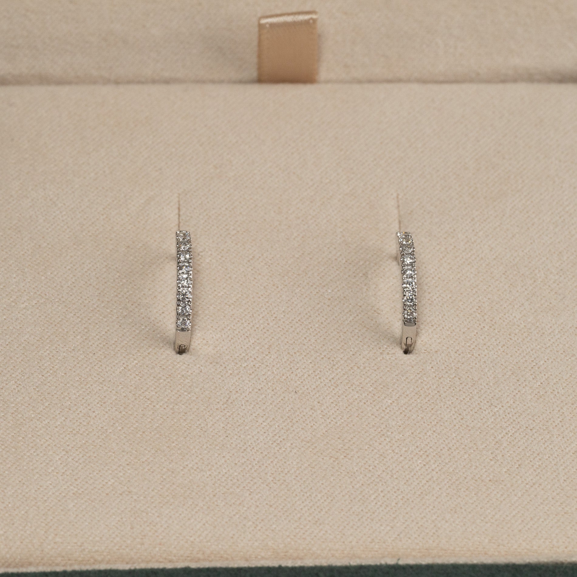 Klassiske diamantcreoler laget i 14 karat massivt hvitt gull med totalt 20 lab-grown diamanter med en vekt på 0,15 ct. Diamantene har fargen E/F (River) og klarheten VVS. Smykket er laget med omhu; diamantene er produsert med blant annet solenergi, og gullet er 100 % sertifisert resirkulert.
