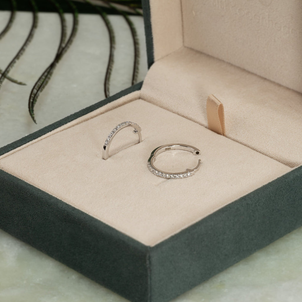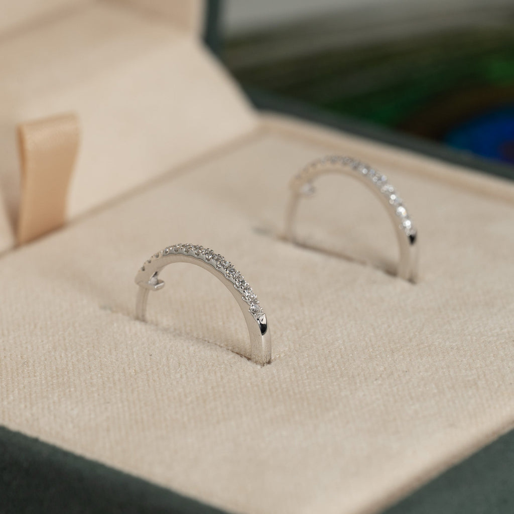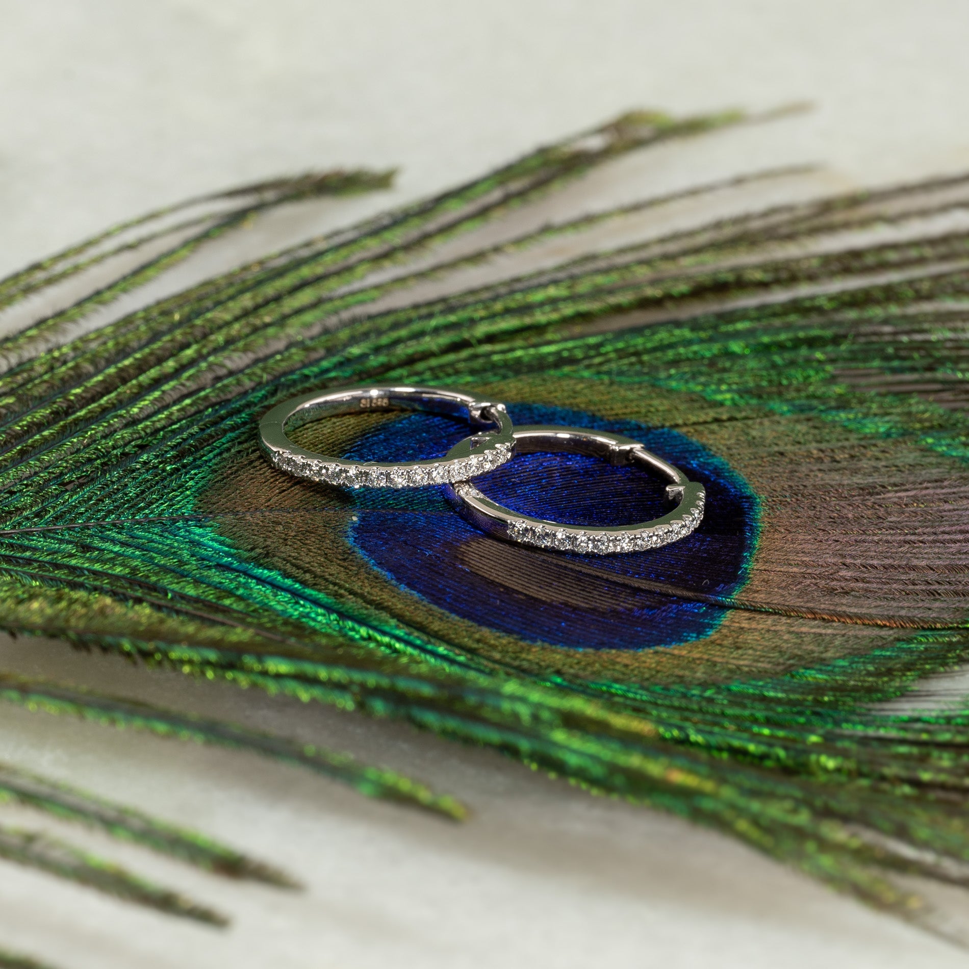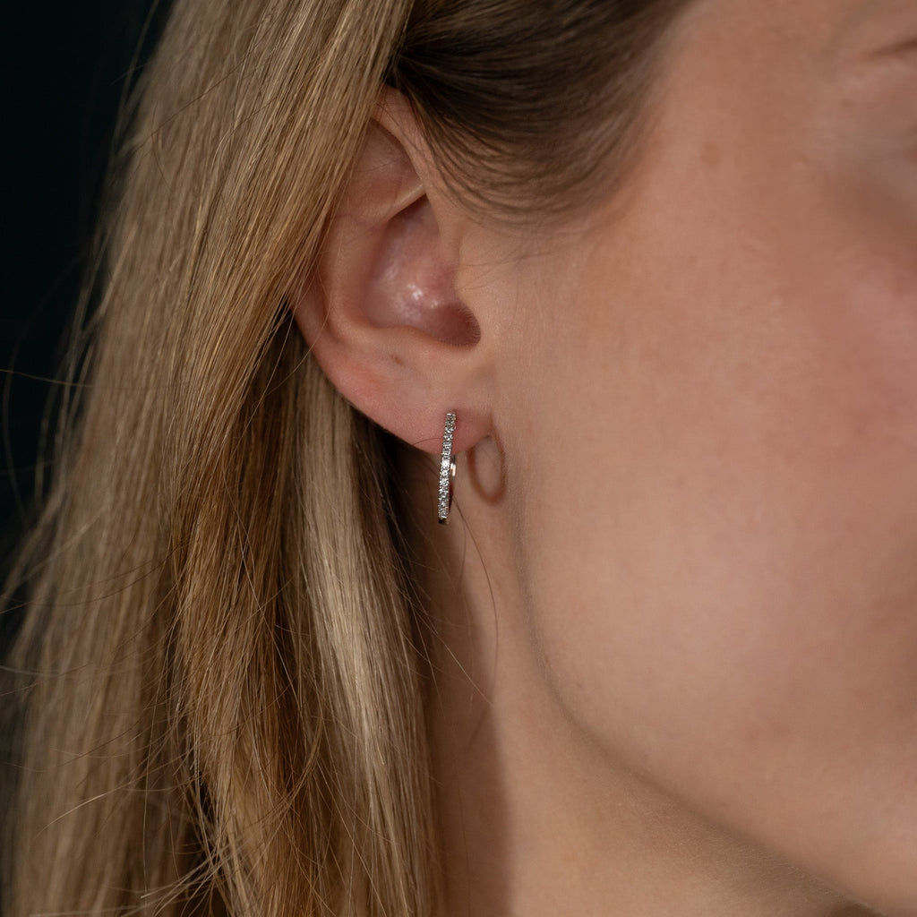 Klassiske diamantcreoler laget i 14 karat massivt hvitt gull med totalt 26 lab-grown diamanter med en vekt på 0,20 ct. Diamantene har fargen E/F (River) og klarhet VVS. Smykket er laget med omtanke; diamantene er produsert med blant annet solenergi, og gullet er 100 % sertifisert resirkulert.