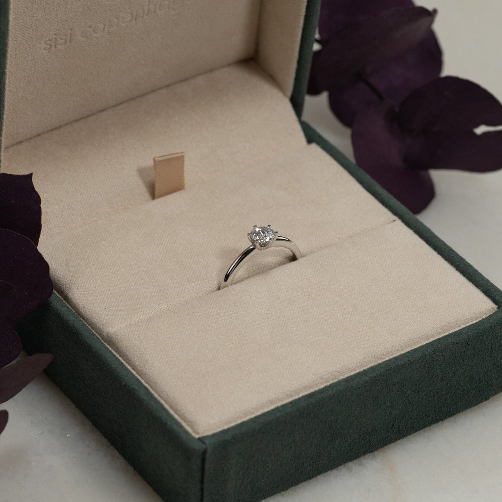 Ringen er laget i 14 karat massivt hvitt gull med en etisk skapt lab-grown diamant som har en vekt på 0,5 ct. Diamanten har fargen E/F (River / Top Wesselton) og klarhet VVS. Utover det er den fremstilt CO2 nøytralt med 100% grønn energi, og guldet er 100% sertifisert resirkulert.