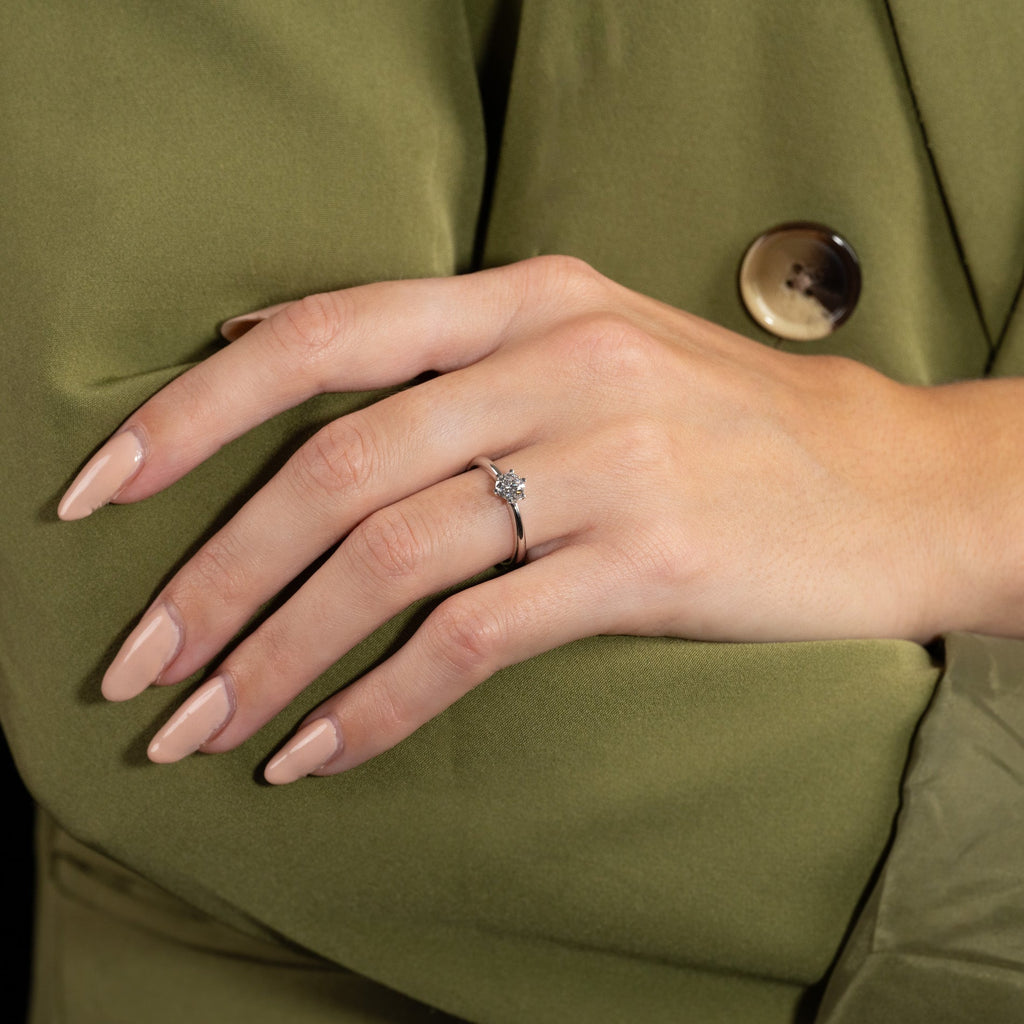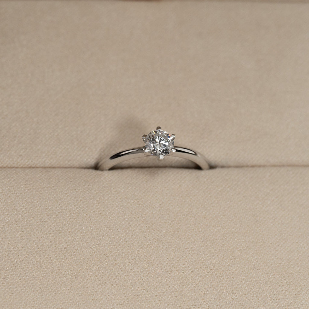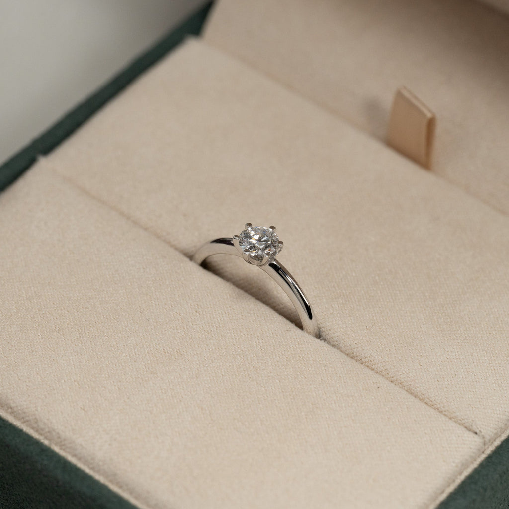 Diamantring i 14 karat hvitt gull med en 0,5 ct. lab-grown briljantslipt diamant. Diamanten er satt i en lav, klassisk innfatning med 6 klør. Ringen er klassisk og elegant, og passer for enhver anledning; den egner seg også utmerket som en forlovelsesring.