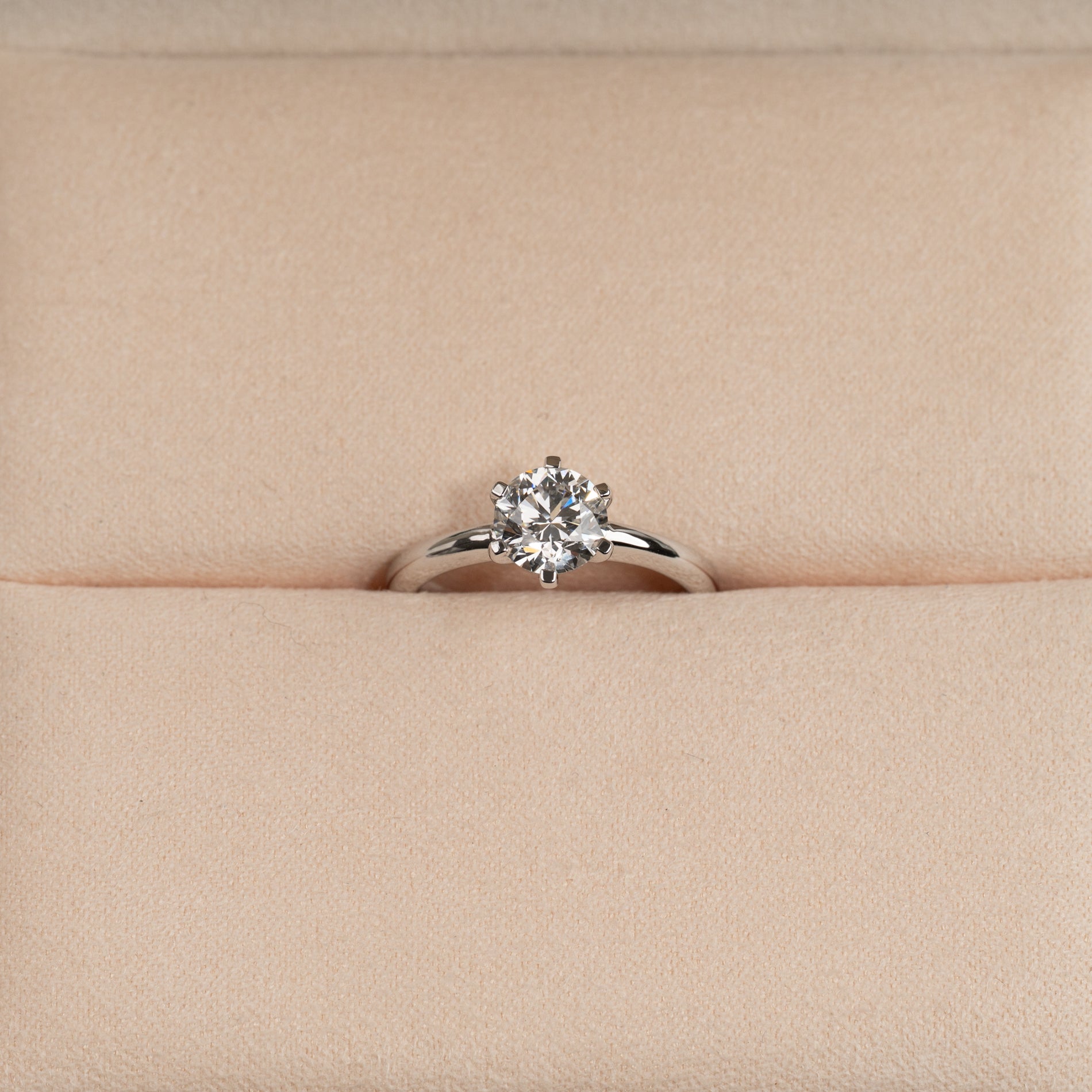 Diamantring i 14 karat hvitt gull med en 1,0 ct. lab-grown briljantslipt diamant. Diamanten er satt i en lav, klassisk innfatning med 6 klør. Ringen er klassisk og elegant, og passer for enhver anledning; den egner seg også utmerket som en forlovelsesring.