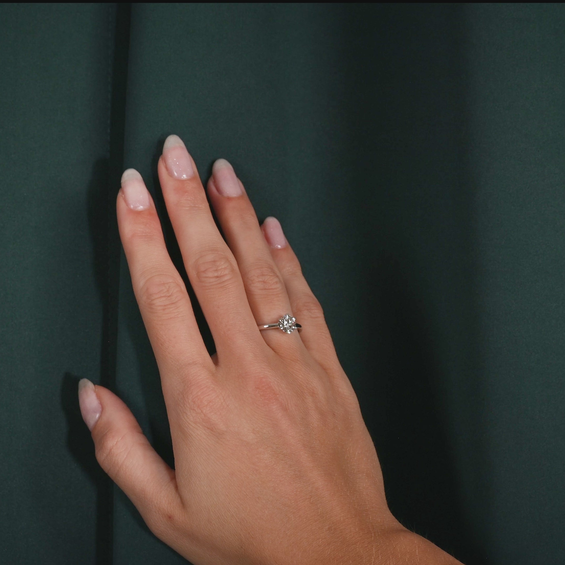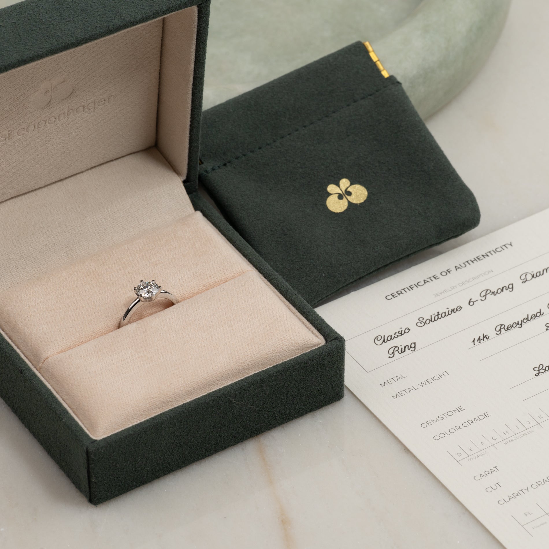 Ringen er laget i 14 karat massivt hvitt gull med en lab-grown diamant som har en vekt på 1,0 ct. Diamanten har fargen E/F (River) og klarhet VVS. Smykket er laget med omhu; diamantene er blant annet produsert ved hjelp av solenergi, og gullet er 100% sertifisert resirkulert.