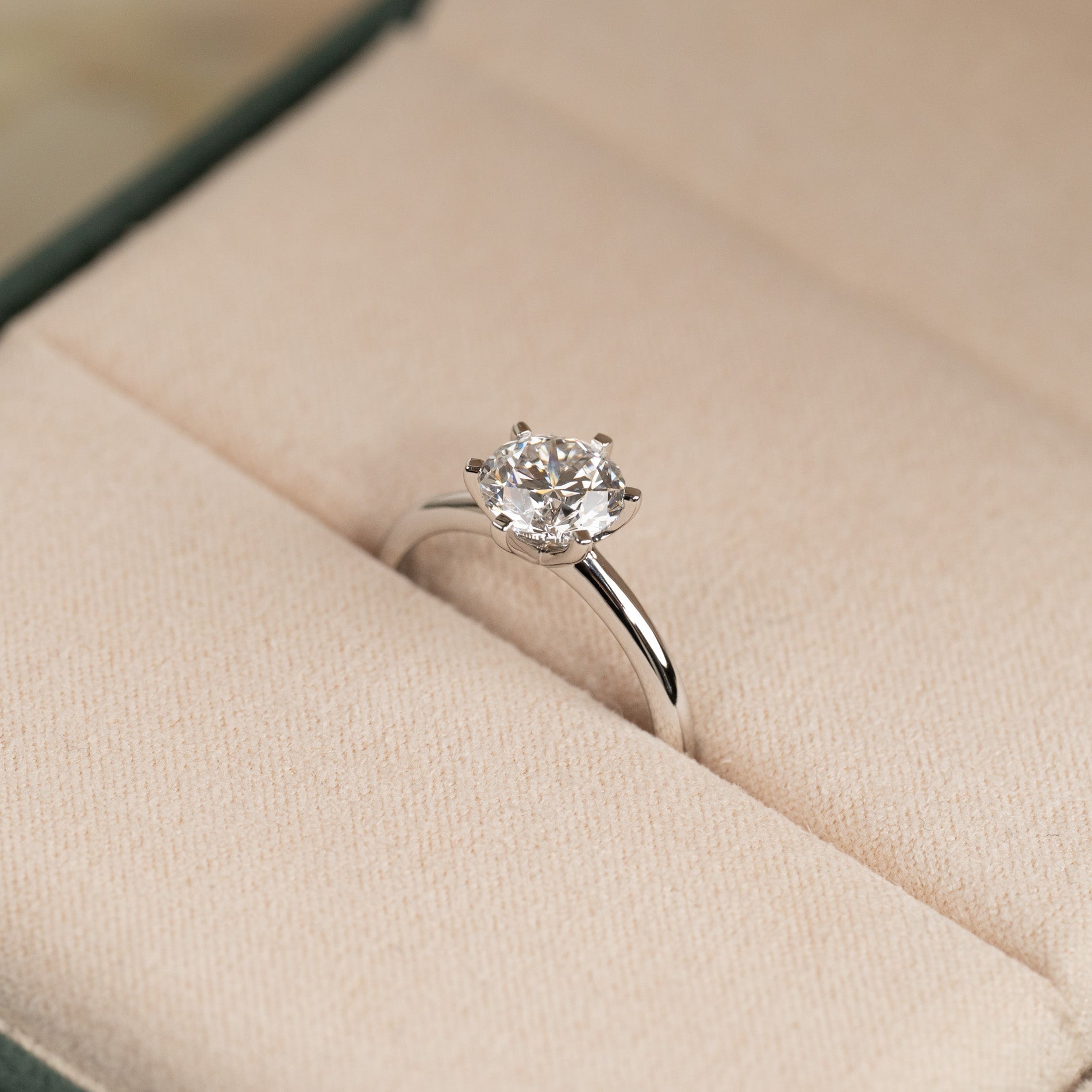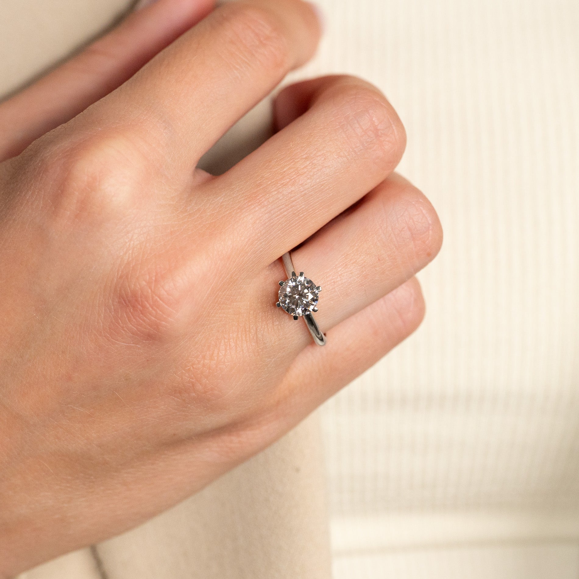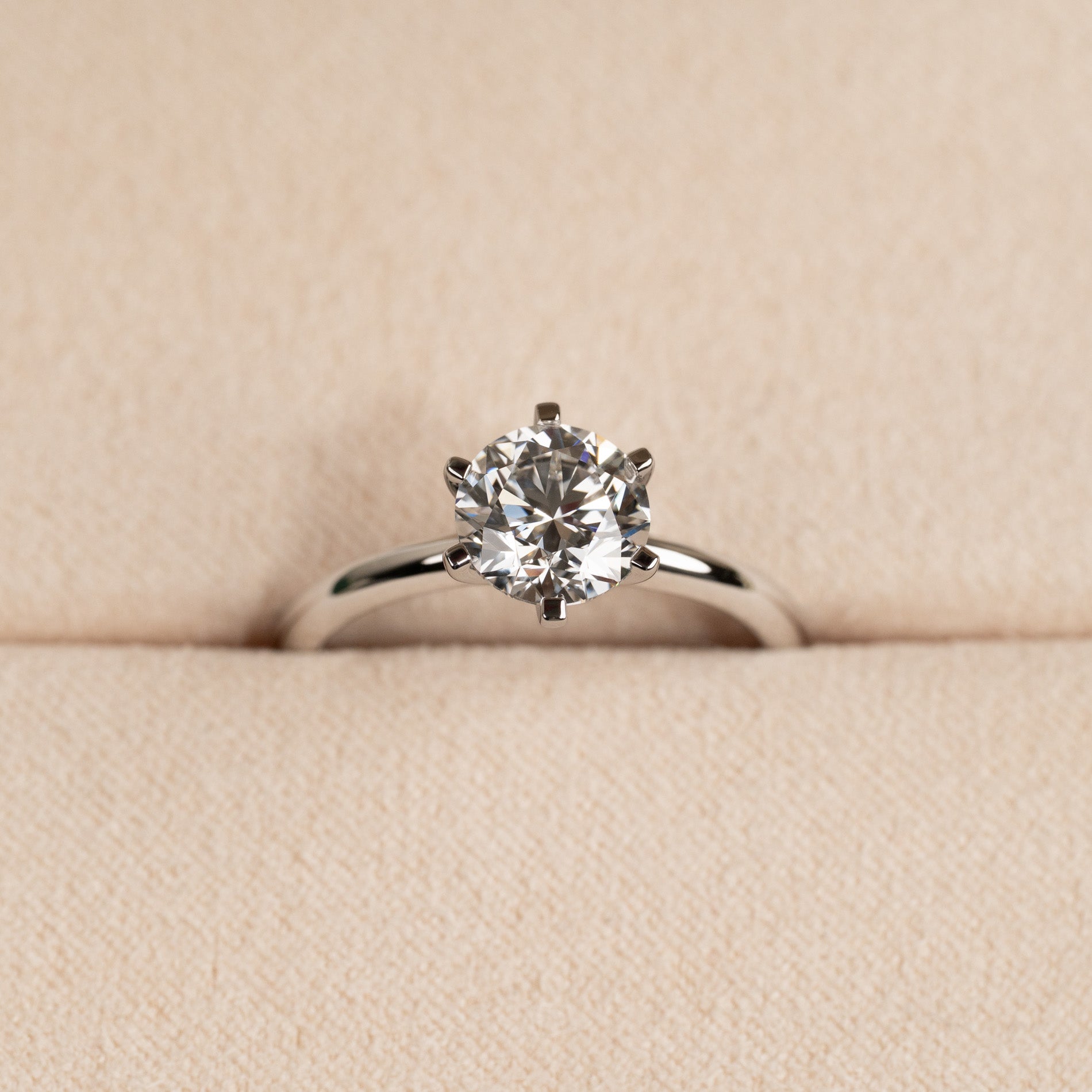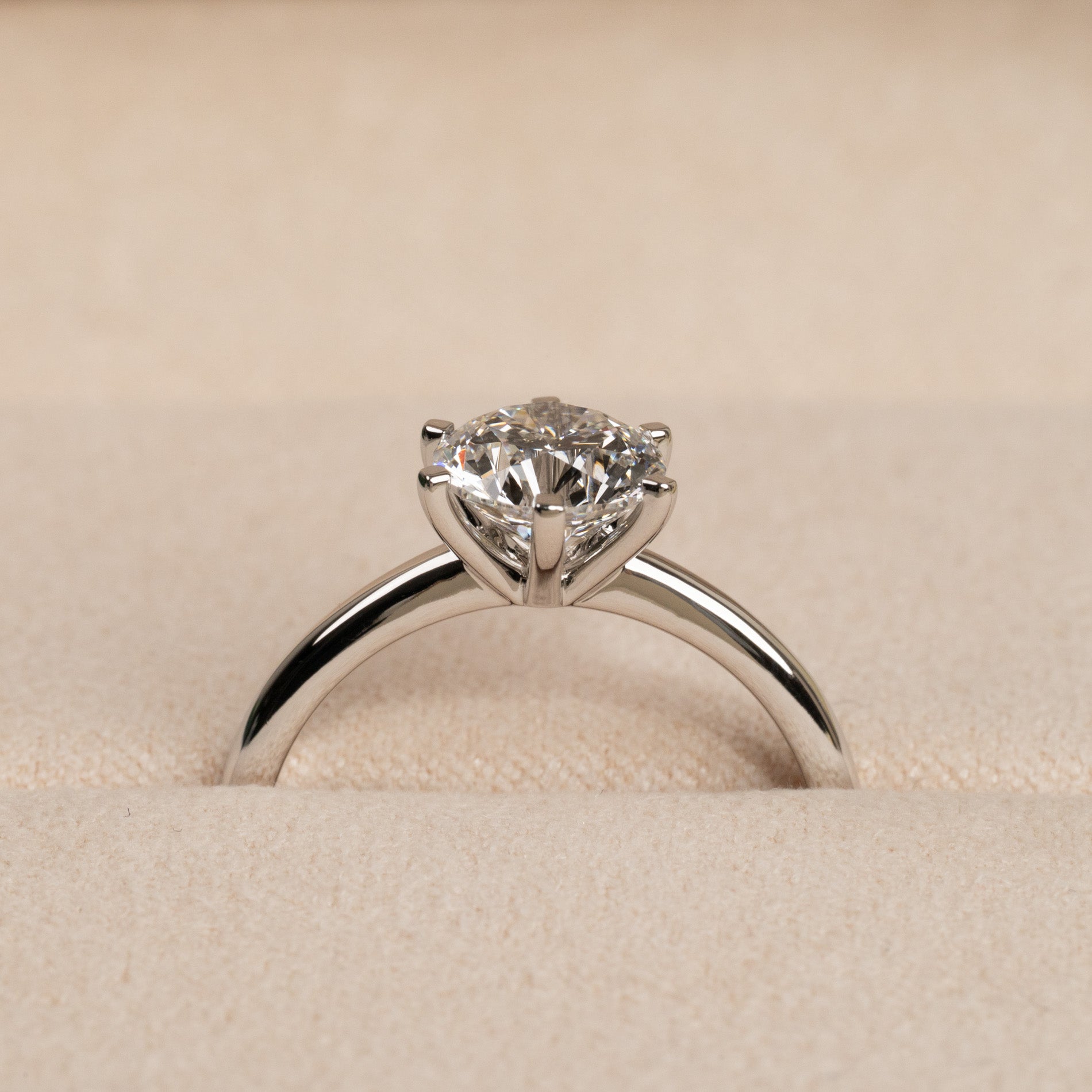 Diamantring i 14 karat hvitt gull med en 1,5 ct. labgrodd briljantslipt diamant. Diamanten er innfattet i en lav, klassisk innfatning med seks tapper. Ringen er et klassisk og elegant smykke som passer til enhver anledning. Ringen egner seg også godt som forlovelsesring.