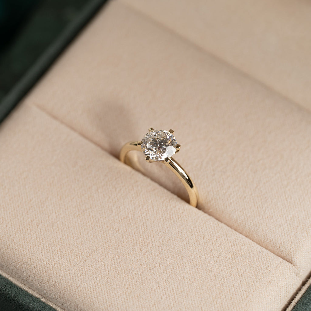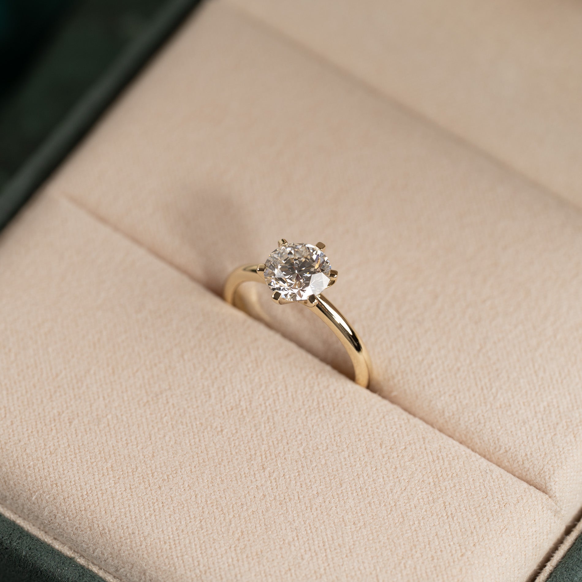 Diamantring i 14 karat gull med en 1,5 ct. labgrodd briljantslipt diamant. Diamanten er innfattet i en lav, klassisk innfatning med seks tapper. Ringen er et klassisk og elegant smykke som passer til enhver anledning. Ringen egner seg også godt som forlovelsesring.