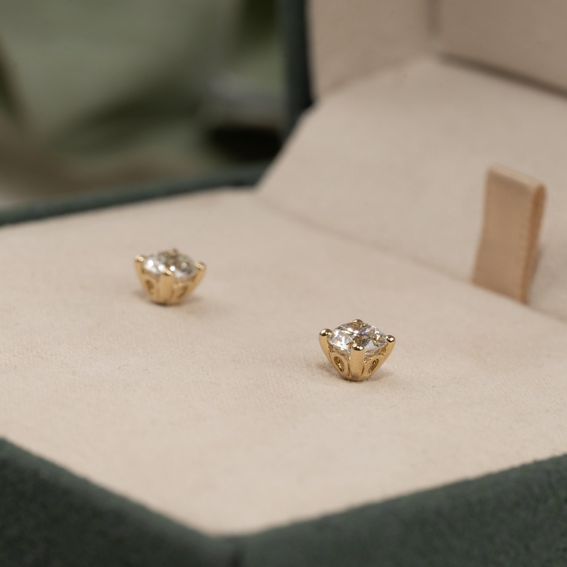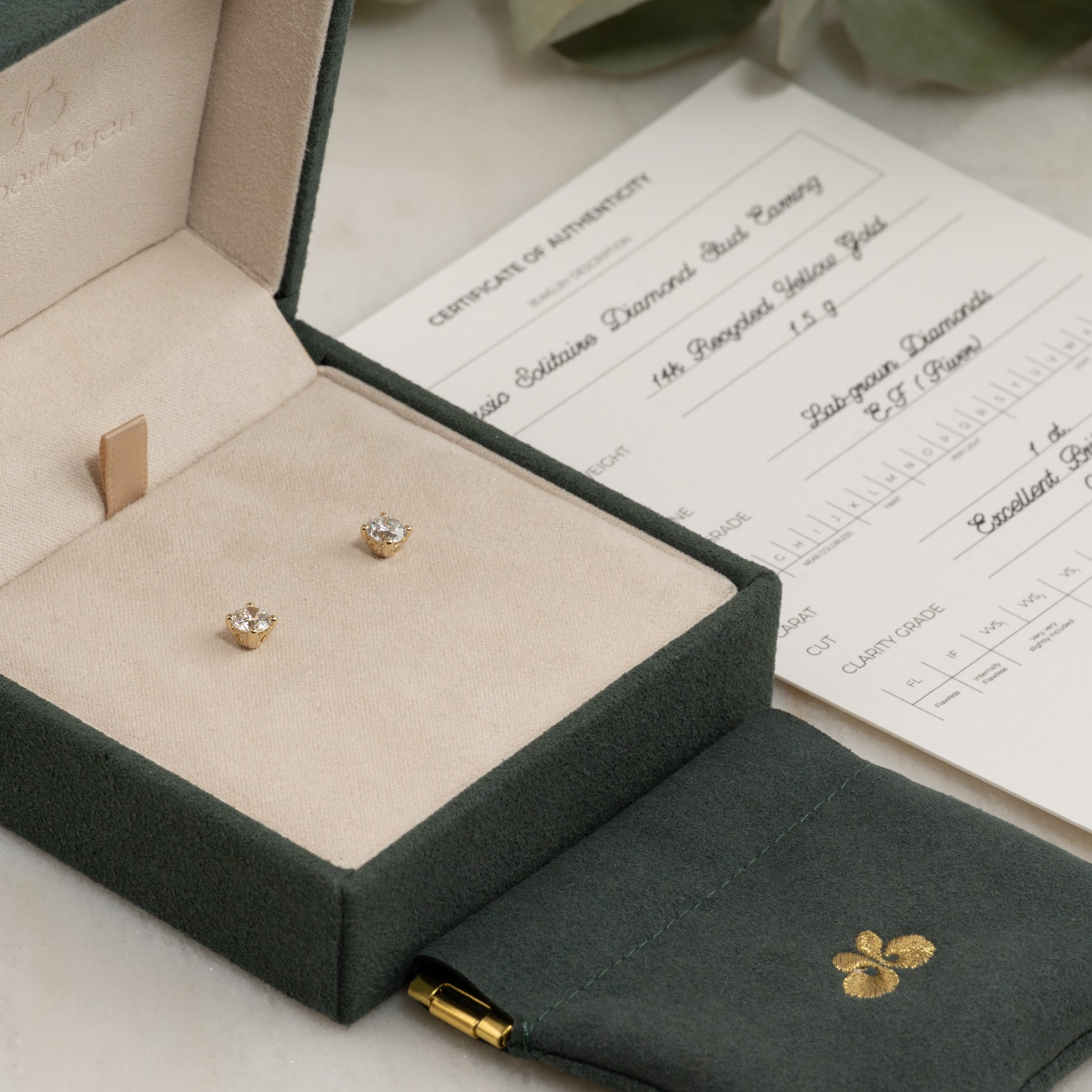 Våre Solitaire diamanterøredobber er laget i 14 karat gull med lab-dyrkede diamanter på 0,5 ct. hver. - men en totalvekt på 1,0 ct. De har fargen E/F (River) og klarheten VVS. Smykket er laget med omtanke; diamantene er produsert med blant annet solenergi, og gullet er 100% sertifisert resirkulert.