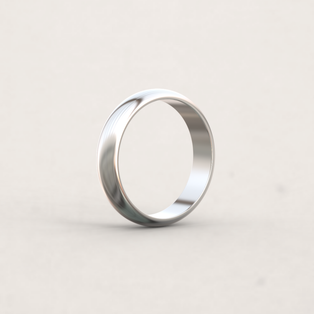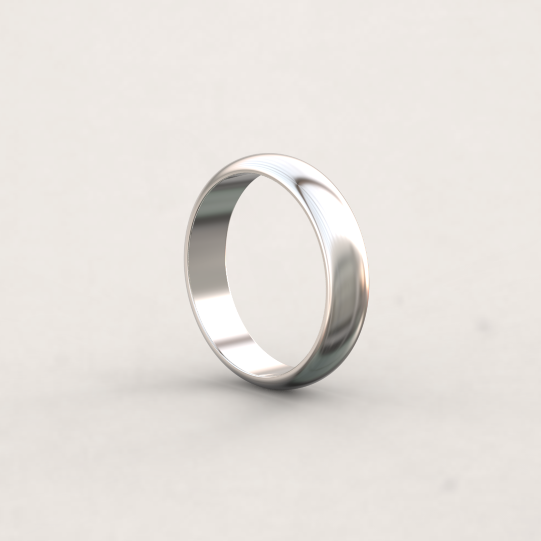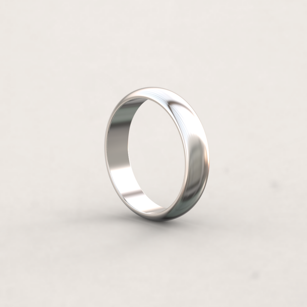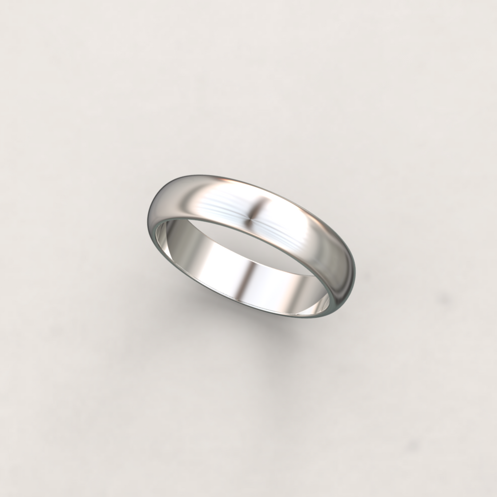 Giftering i 14 karat hvitt gull i en klassisk D-profil på 4,5 mm. D-profilen er kjennetegnet ved en flat innside og en buet utside, slik at tverrsnittet av ringen har en ‘D’-form.