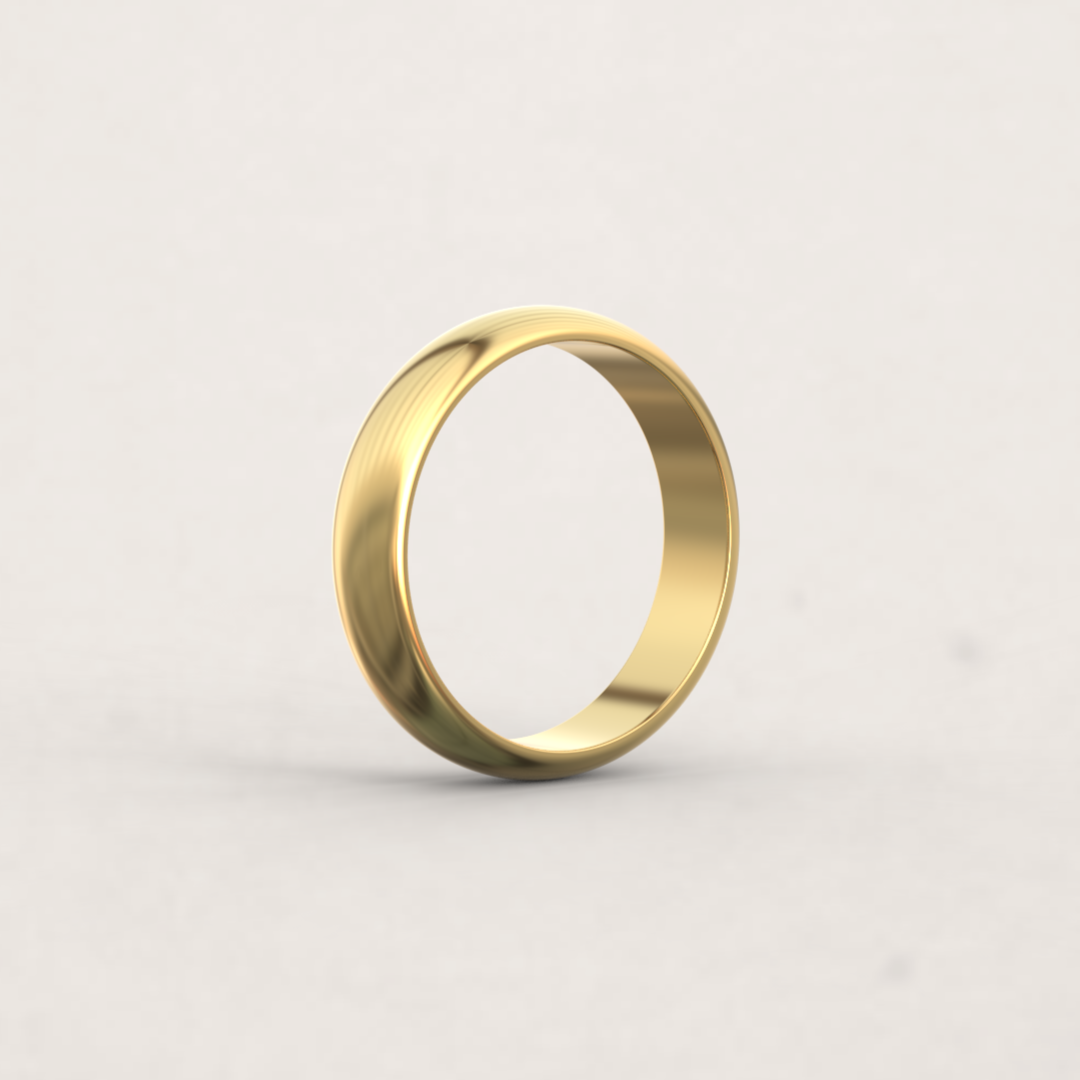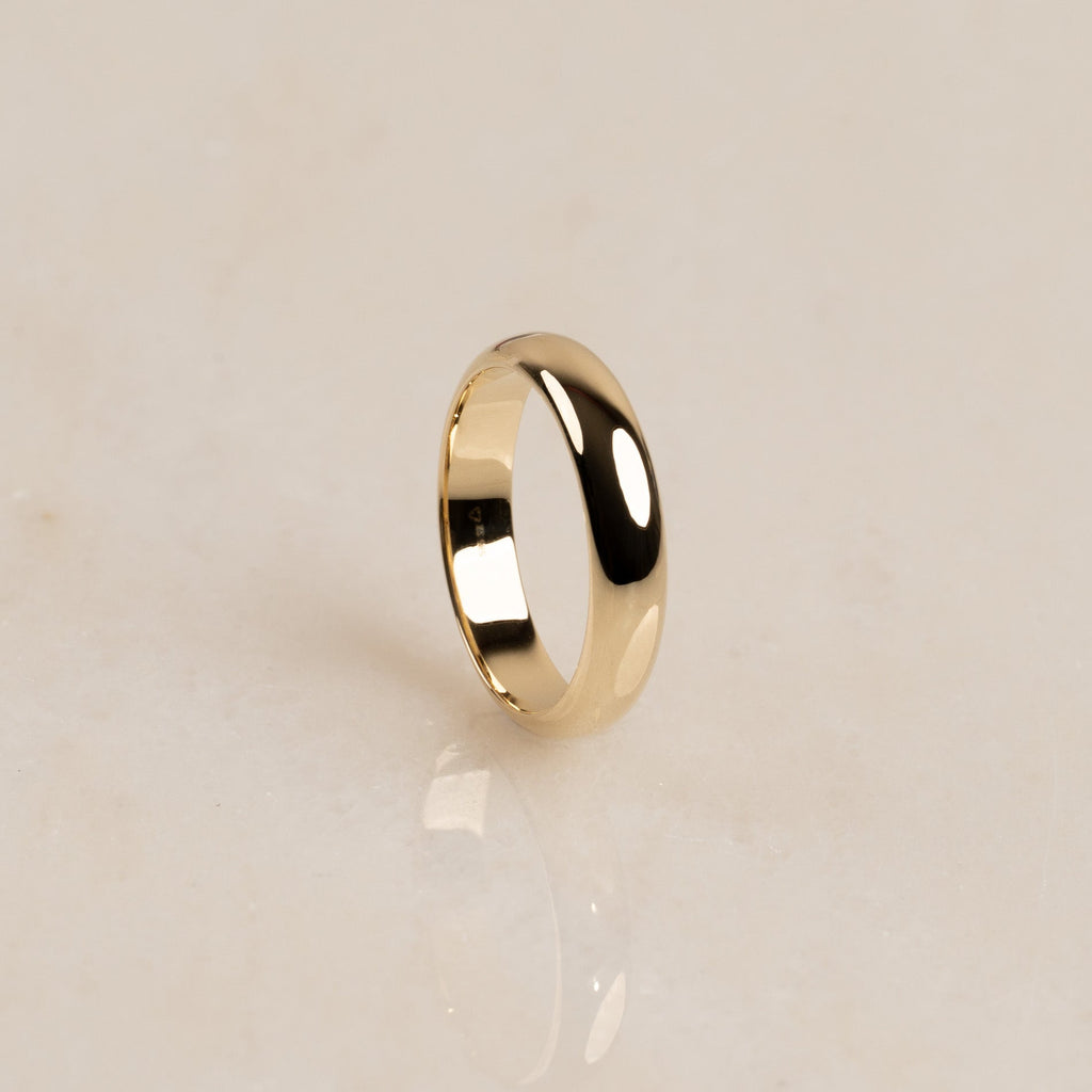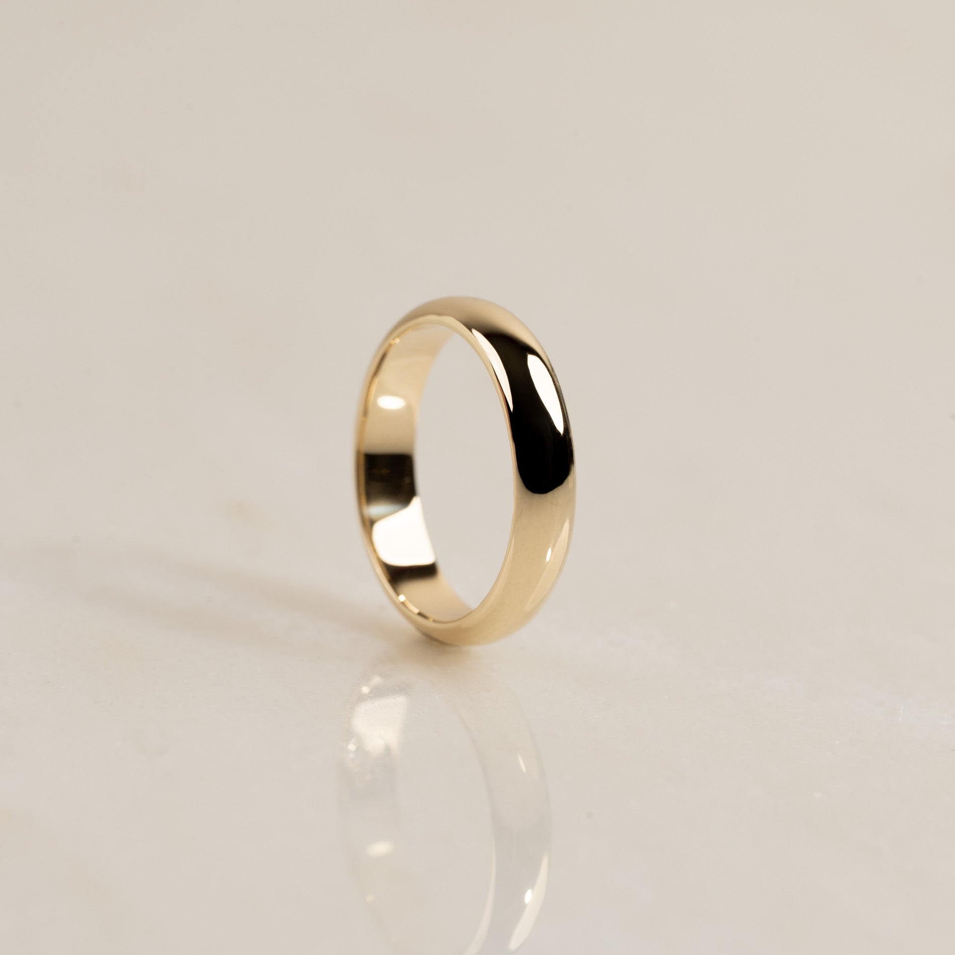 Giftering i 14 karat gull i en klassisk D-profil i 4,5 mm. D-profilen er kjennetegnet ved en flat innside og en buet utside, slik at tverrsnittet av ringen har en ‘D’-form.