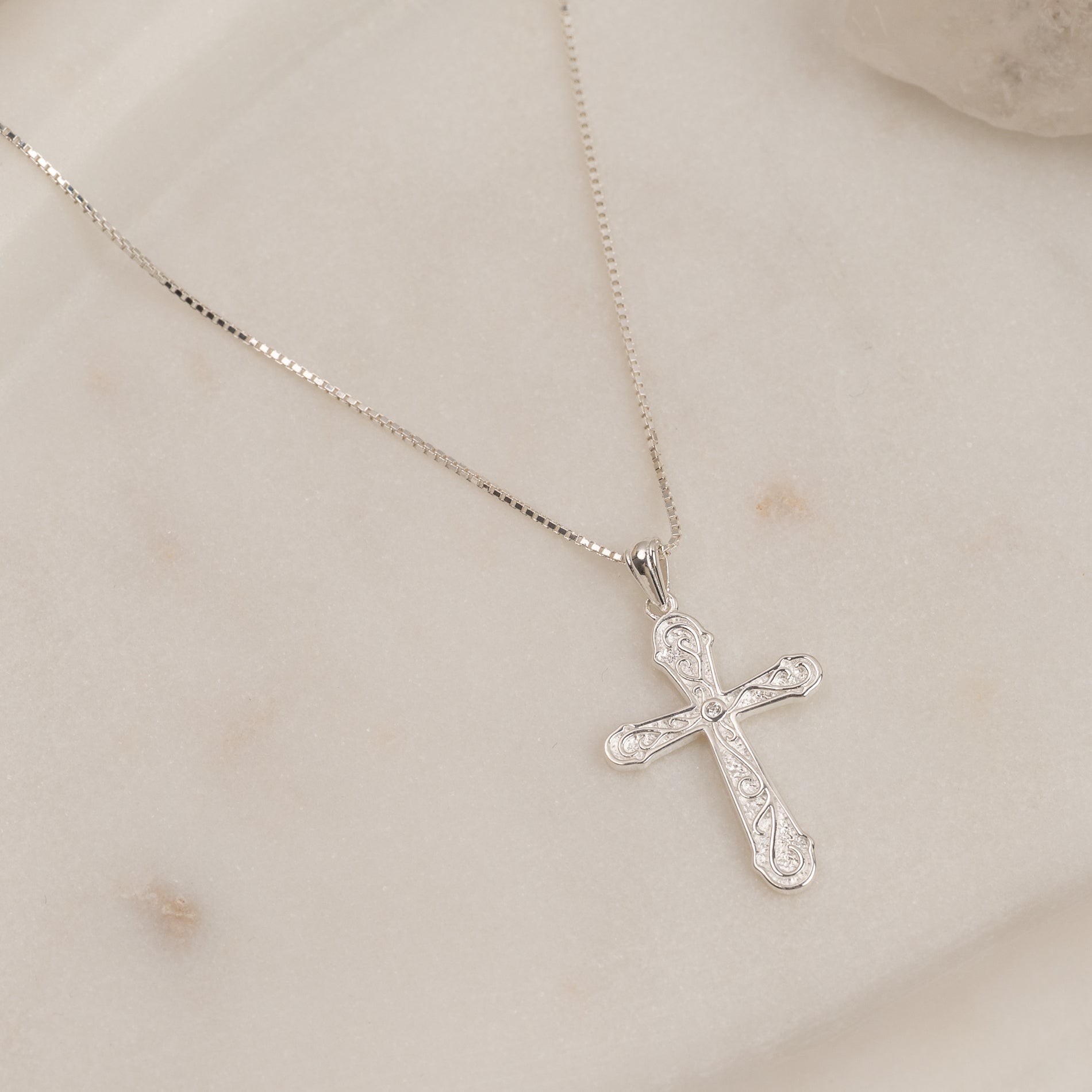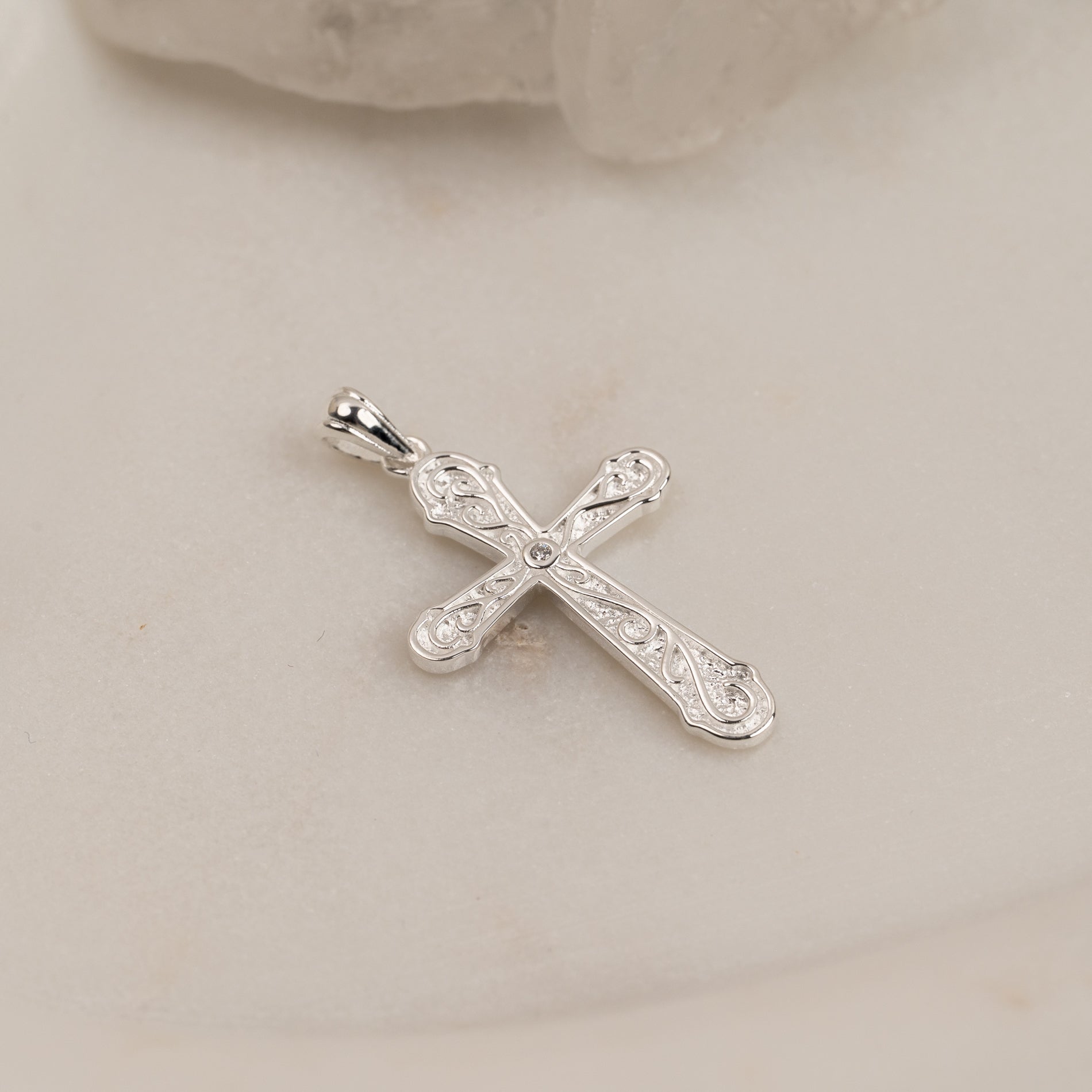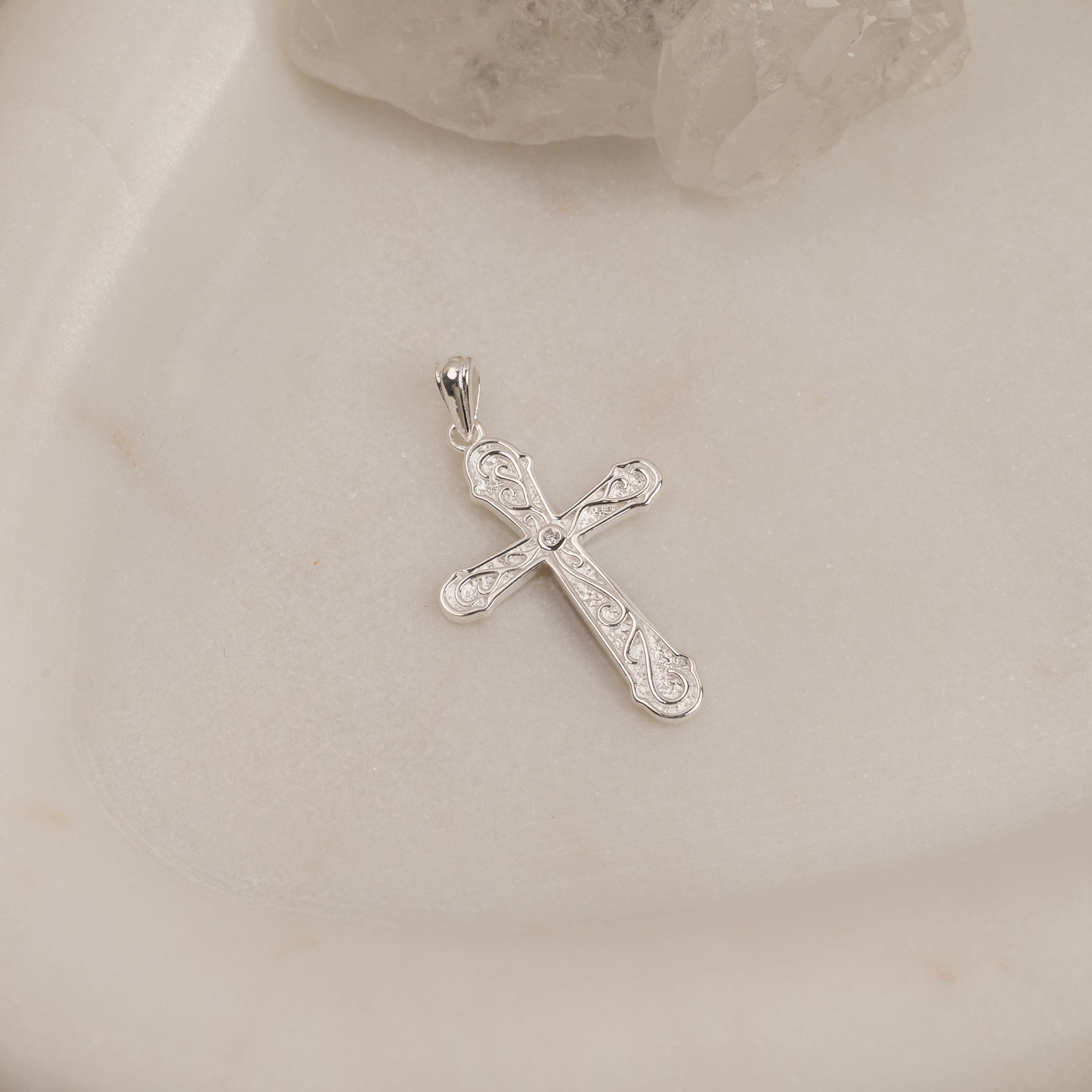 Korsanheng i 100 % resirkulert 925 sterlingsølv med en klar kubisk zirkonia i midten.