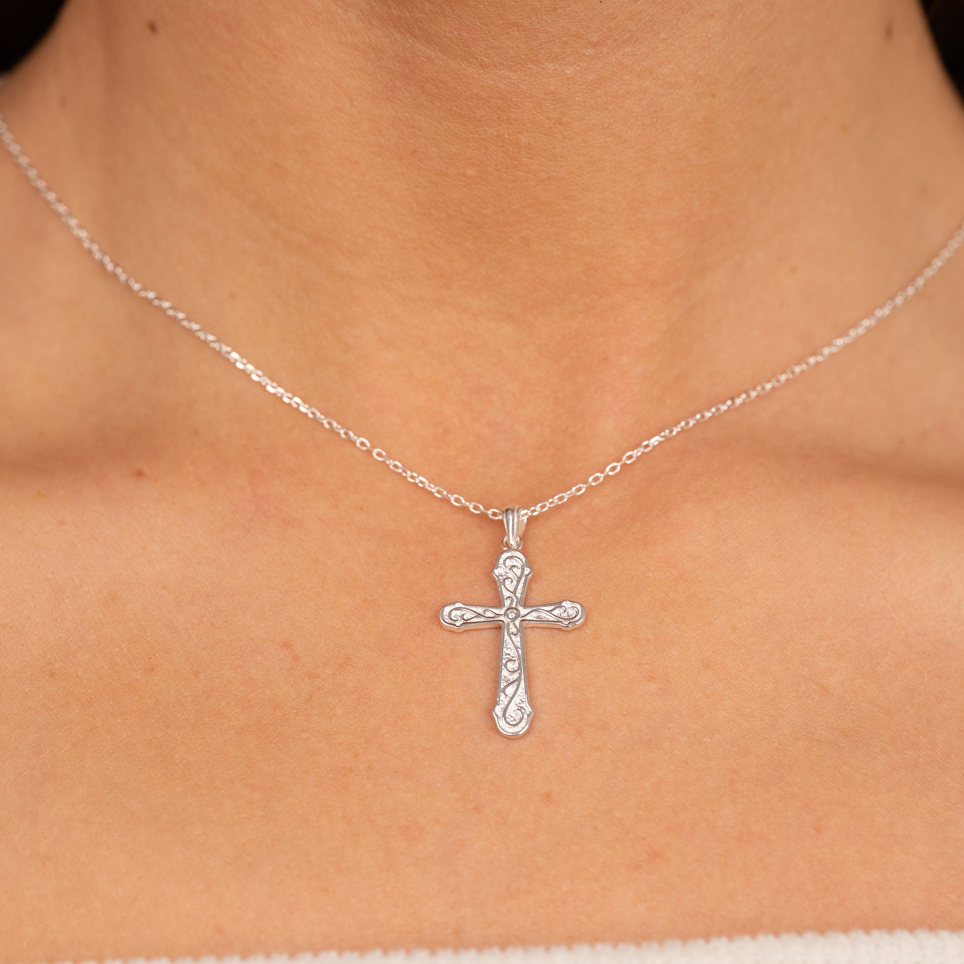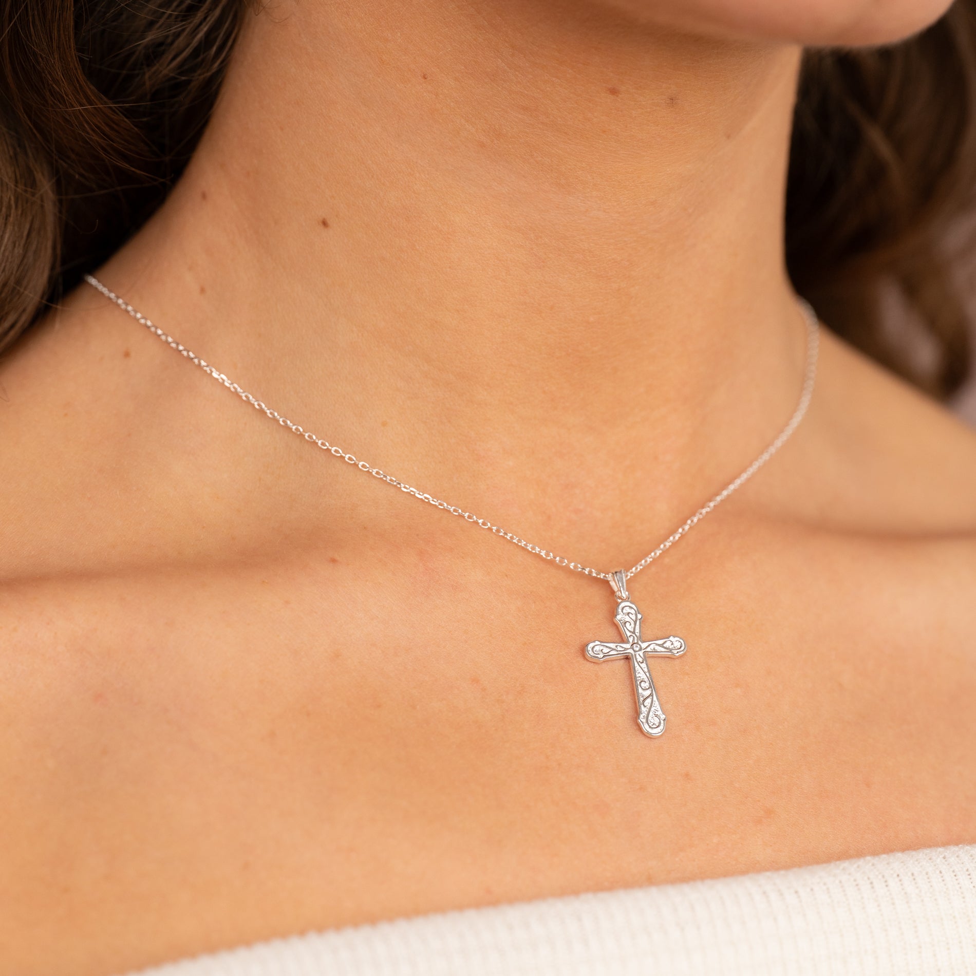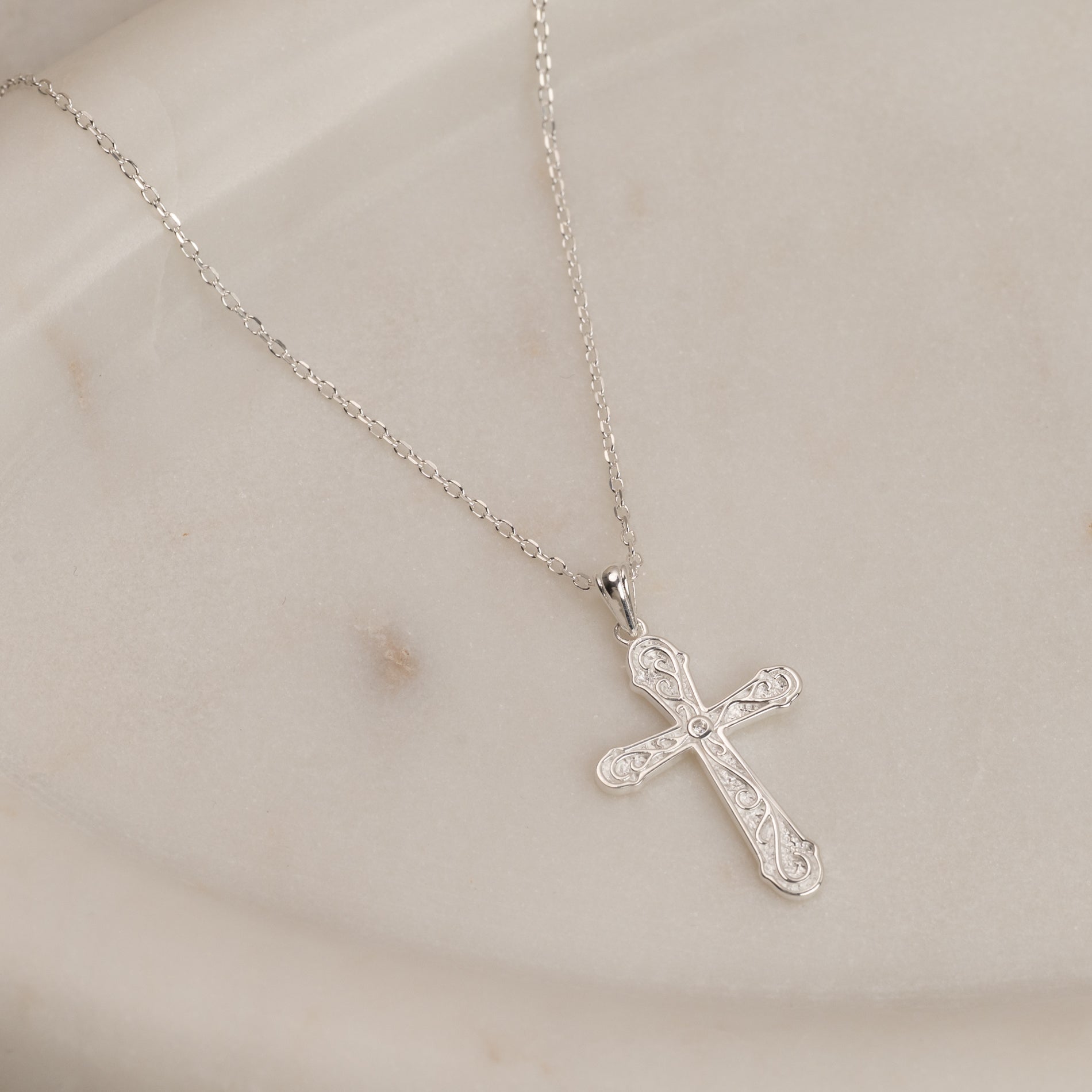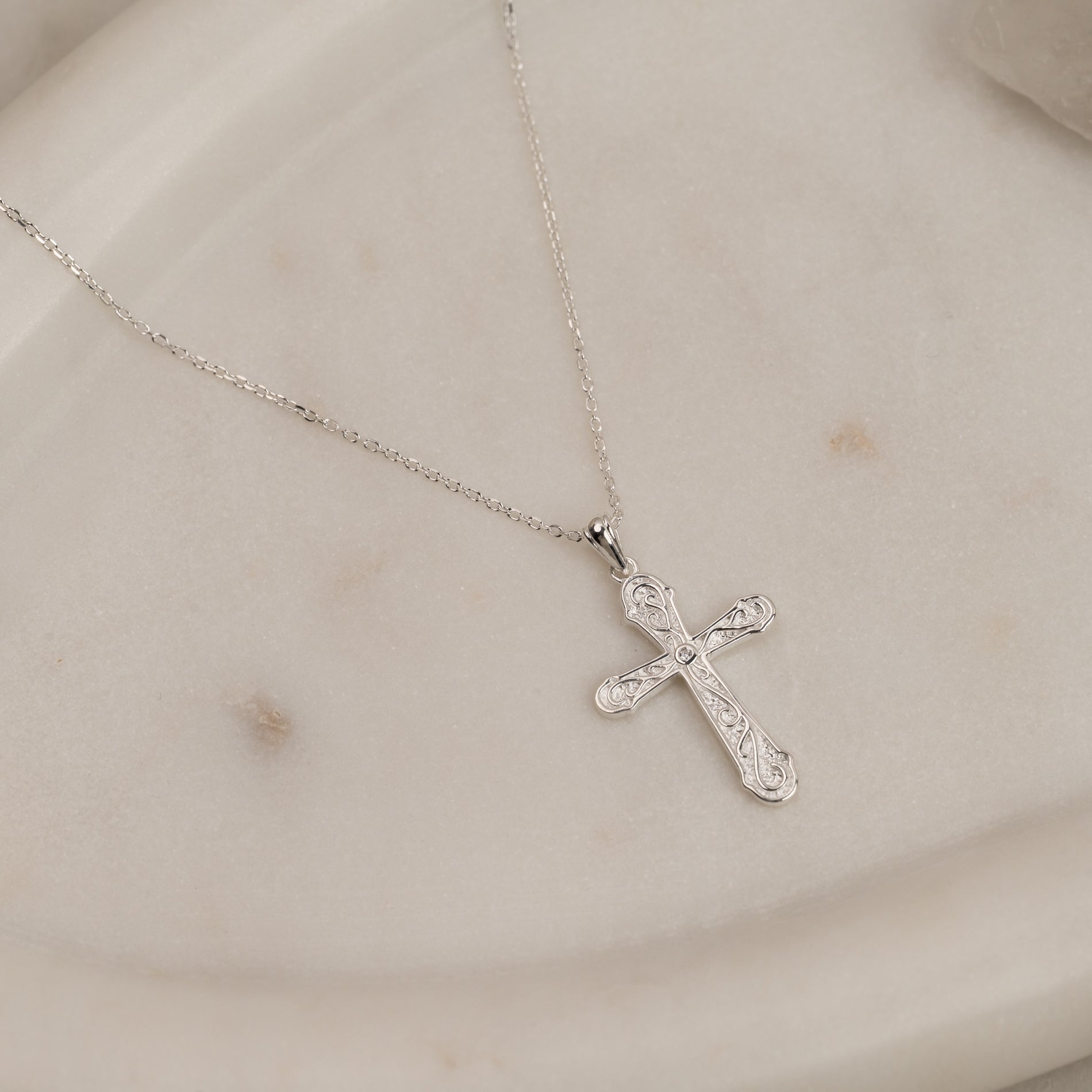 Korsanheng i 100 % resirkulert 925 sterlingsølv med en klar kubisk zirkonia i midten.