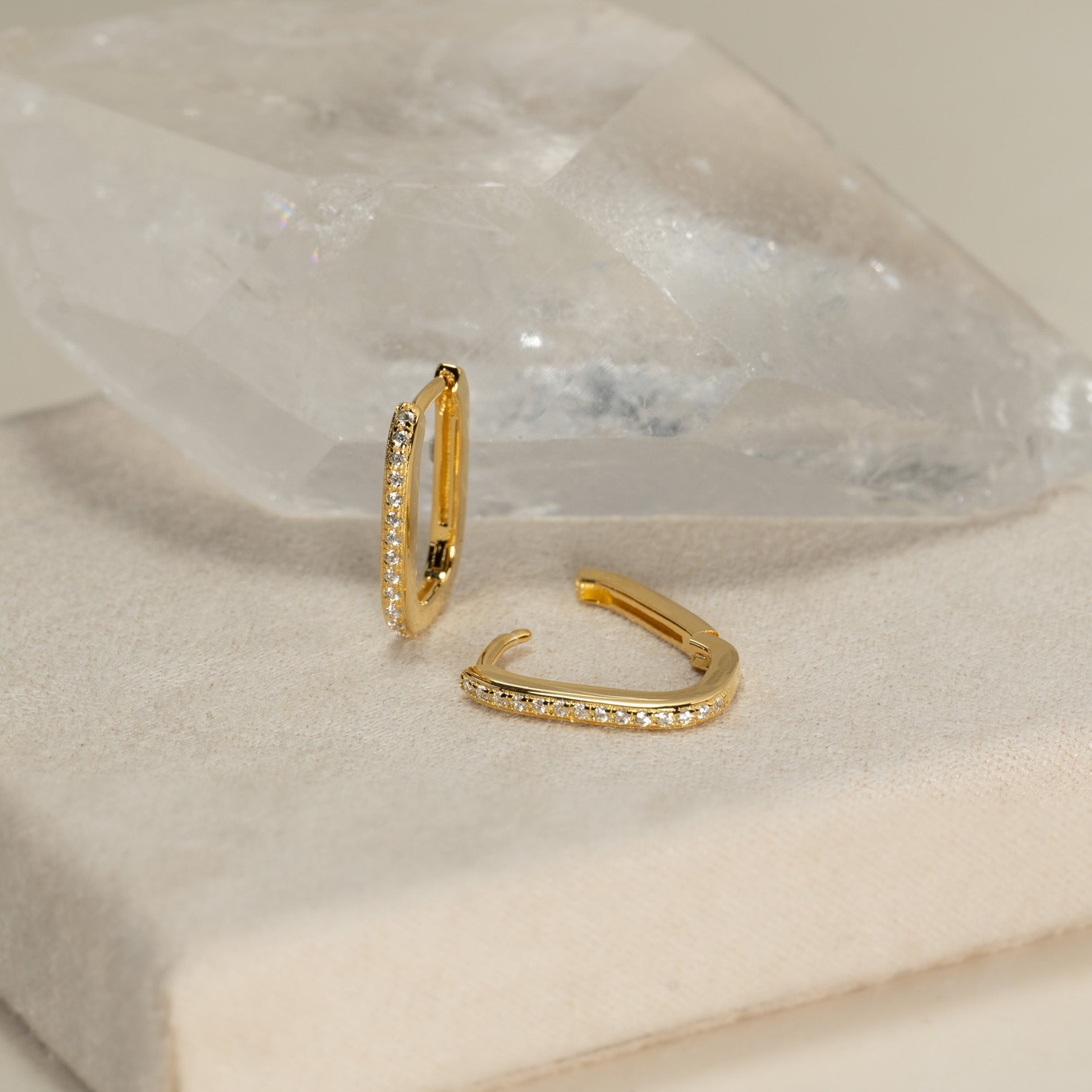 Ovale huggieøreringer i 100% resirkulert 18 karat forgylt sølv med kubiske zirkoniasten. Øreringene har et moderne uttrykk, og kan lett sette sammen med andre øreringer - de er også perfekte til hveragsantrekket.