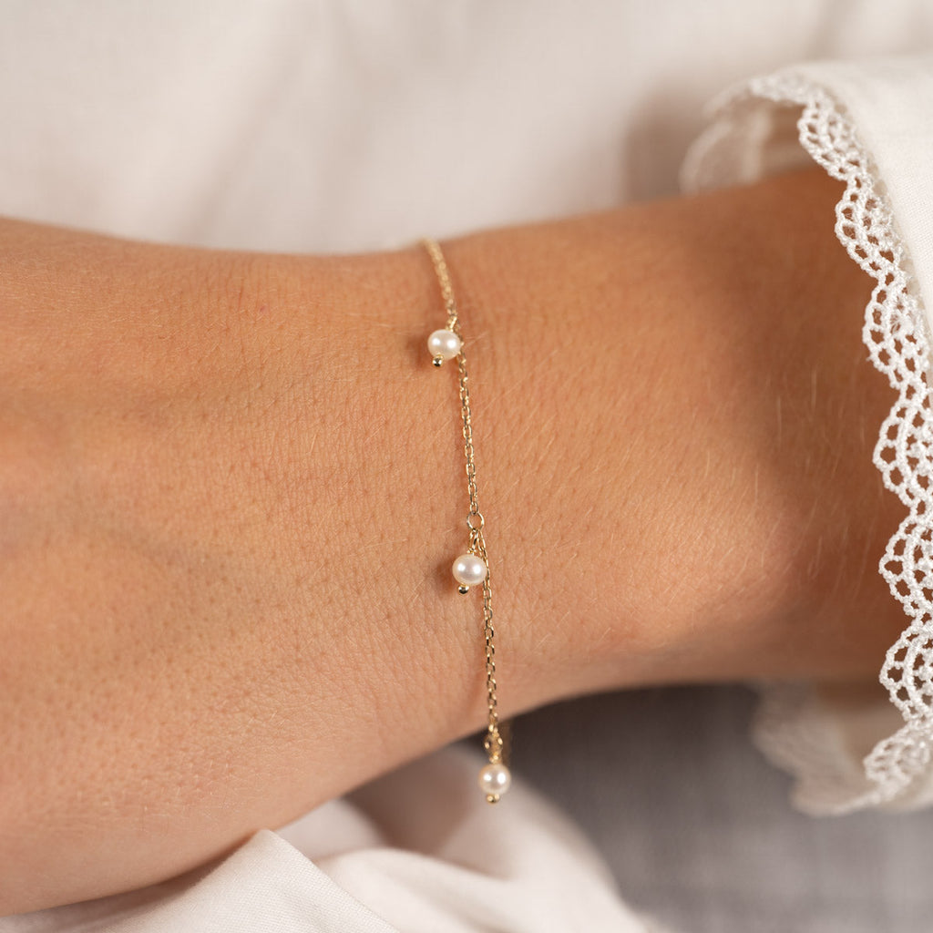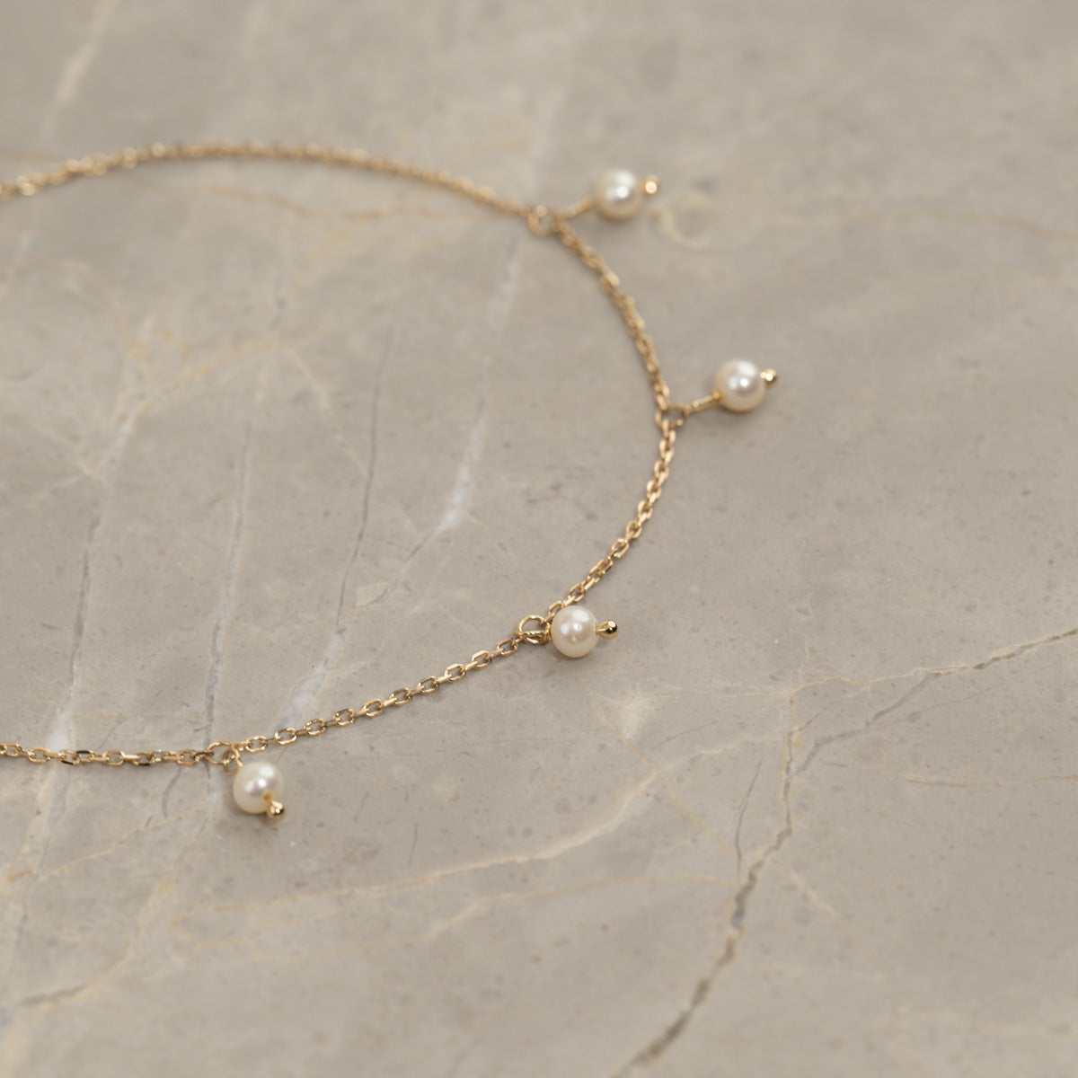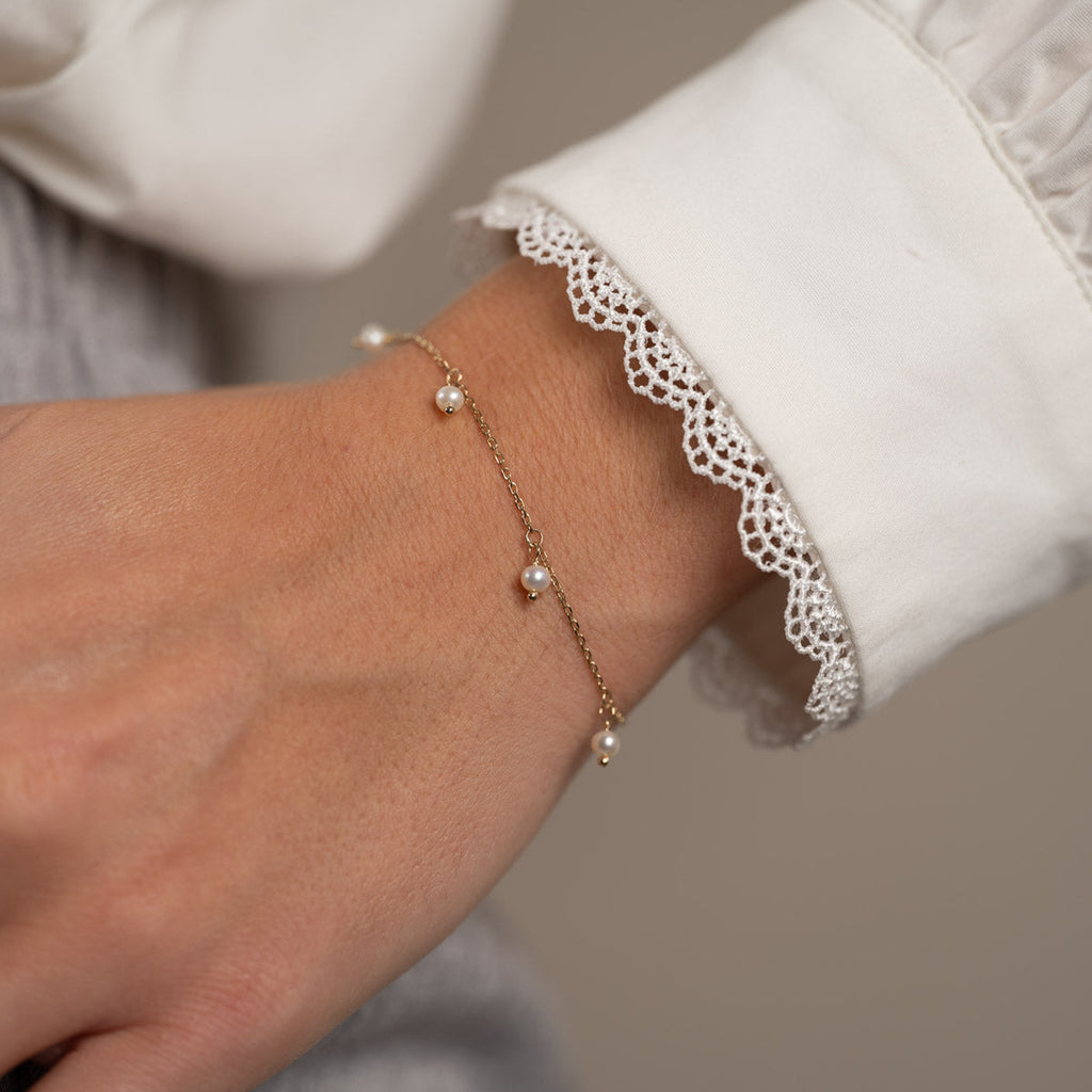 Dette armbånd er laget i 100% resirkulert 9 karat massivt gull. Armbåndet er utformet som et ankerkjede med 5 små anheng, hver med en 2,5-3mm hvit ferskvannsperle. Armbåndet har et elegant og feminint uttrykk som er perfekt å kombinere med andre armbånd - eller bæres alene for et renere uttrykk.
