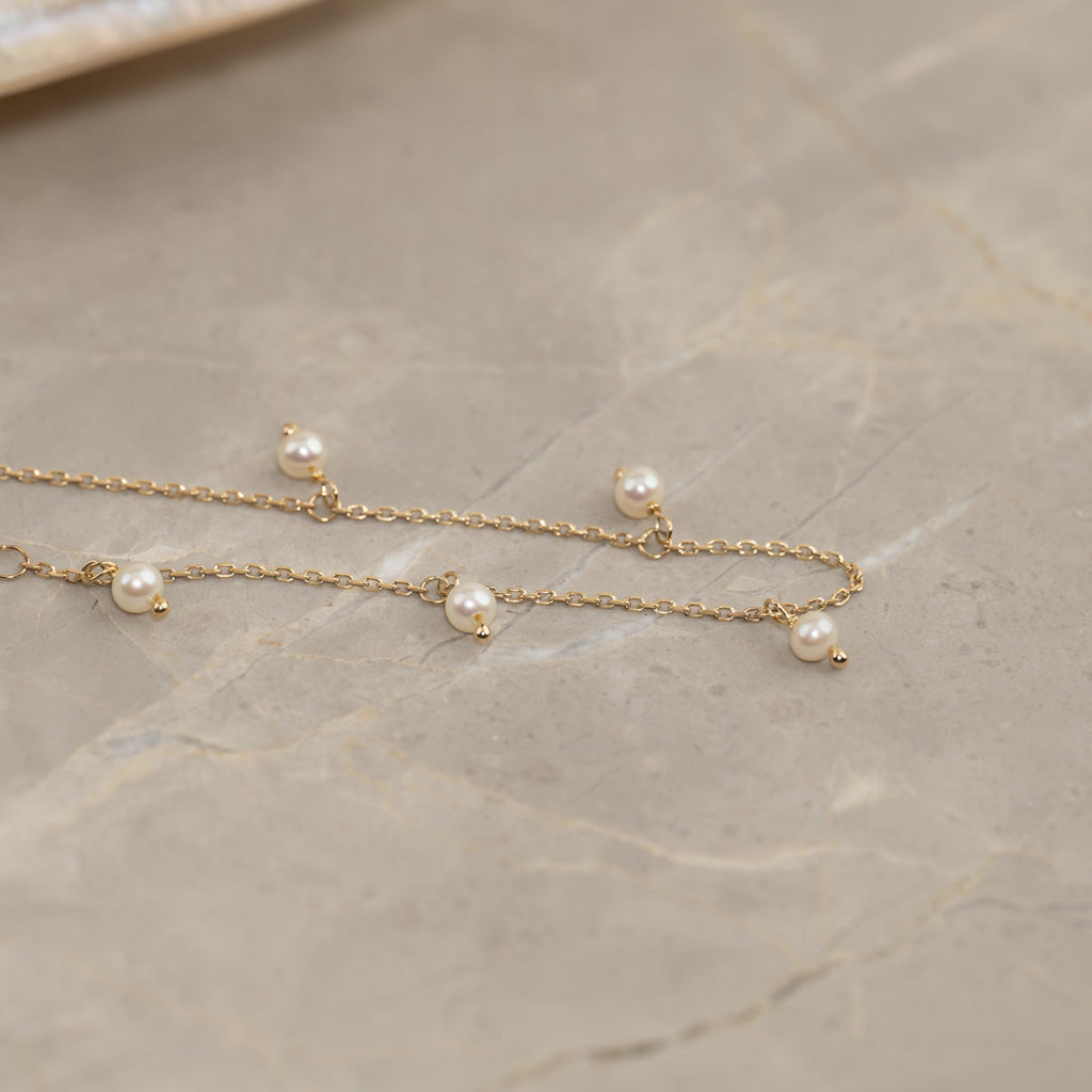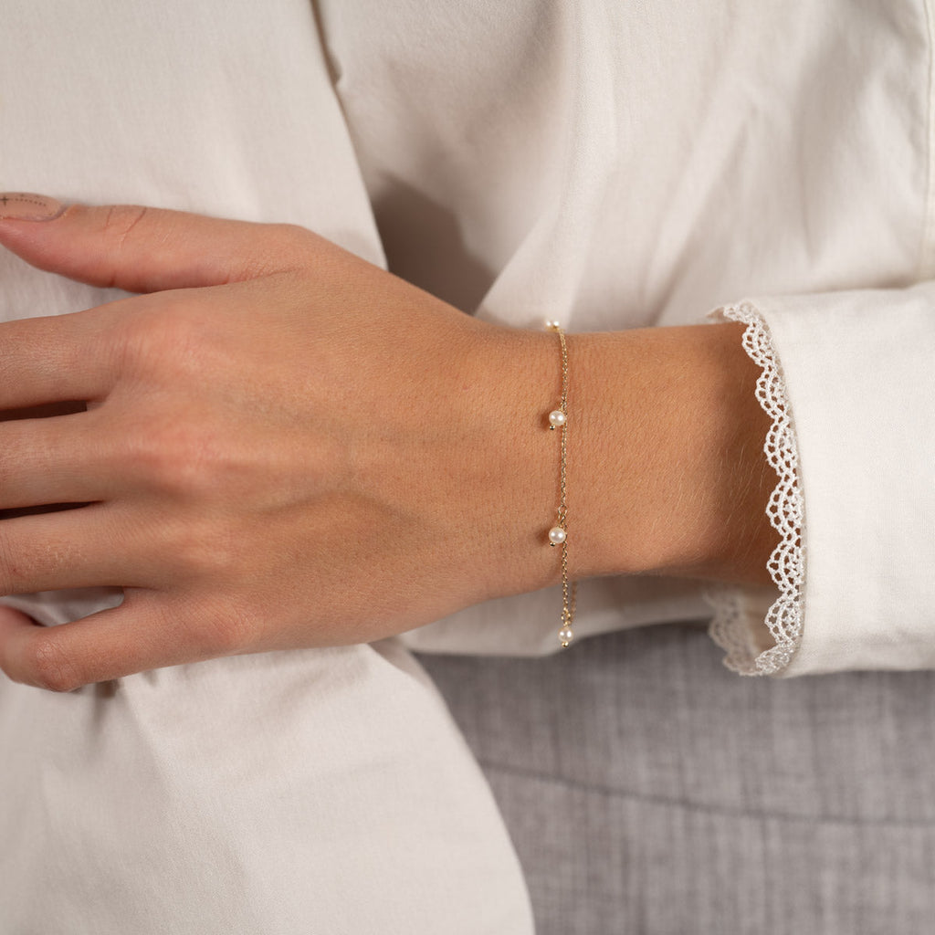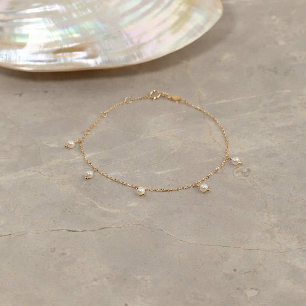 Dette armbånd er laget i 100% resirkulert 9 karat massivt gull. Armbåndet er utformet som et ankerkjede med 5 små anheng, hver med en 2,5-3mm hvit ferskvannsperle. Armbåndet har et elegant og feminint uttrykk som er perfekt å kombinere med andre armbånd - eller bæres alene for et renere uttrykk.