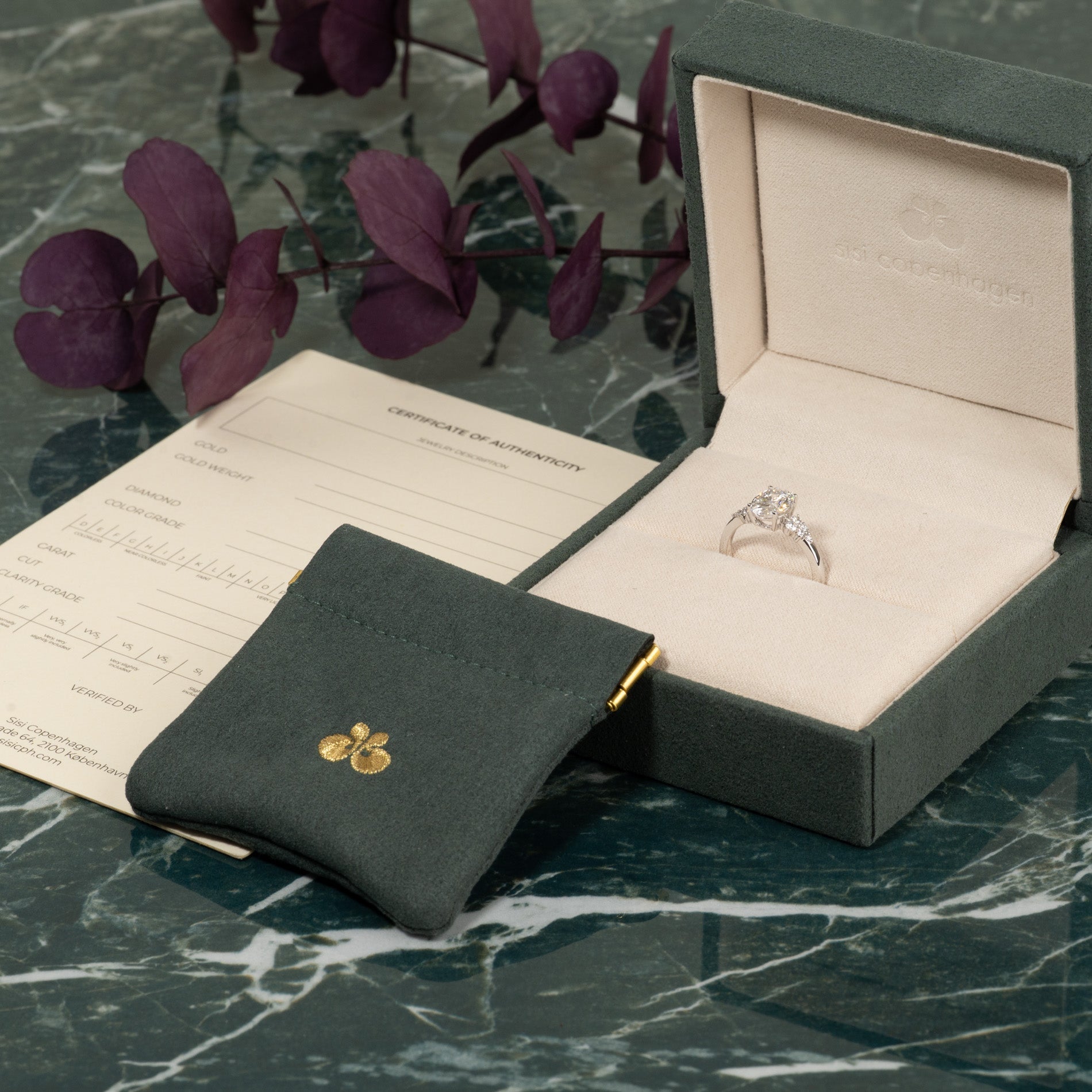 Smykket kommer i vores eksklusive Diamond Collection boks med et flot smykkeskrin, et sertifikat og en pouch. Esken kommer med gavebånd og er også perfekt, hvis smykket skal gis som gave. Diamanten kommer med IGI-sertifikat.