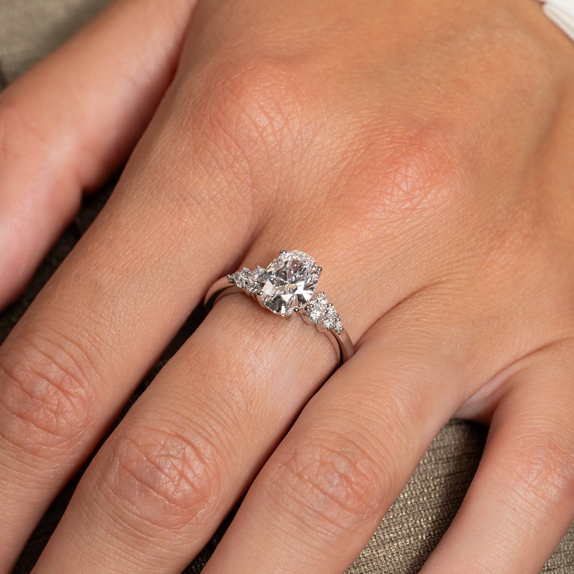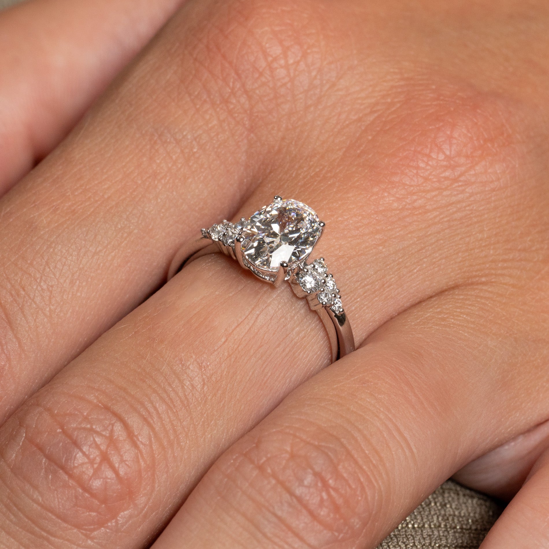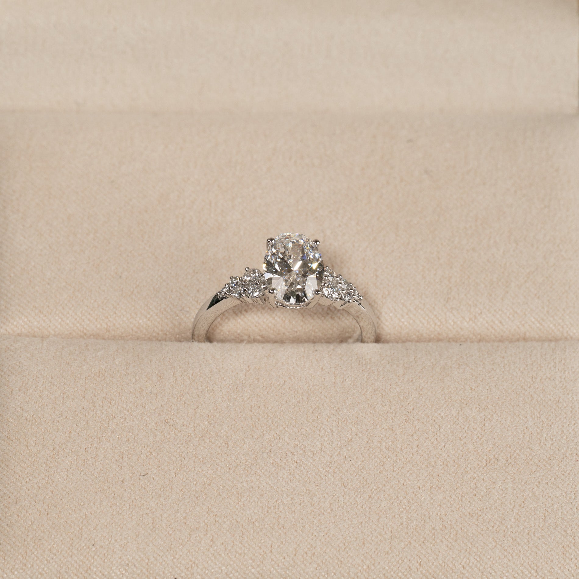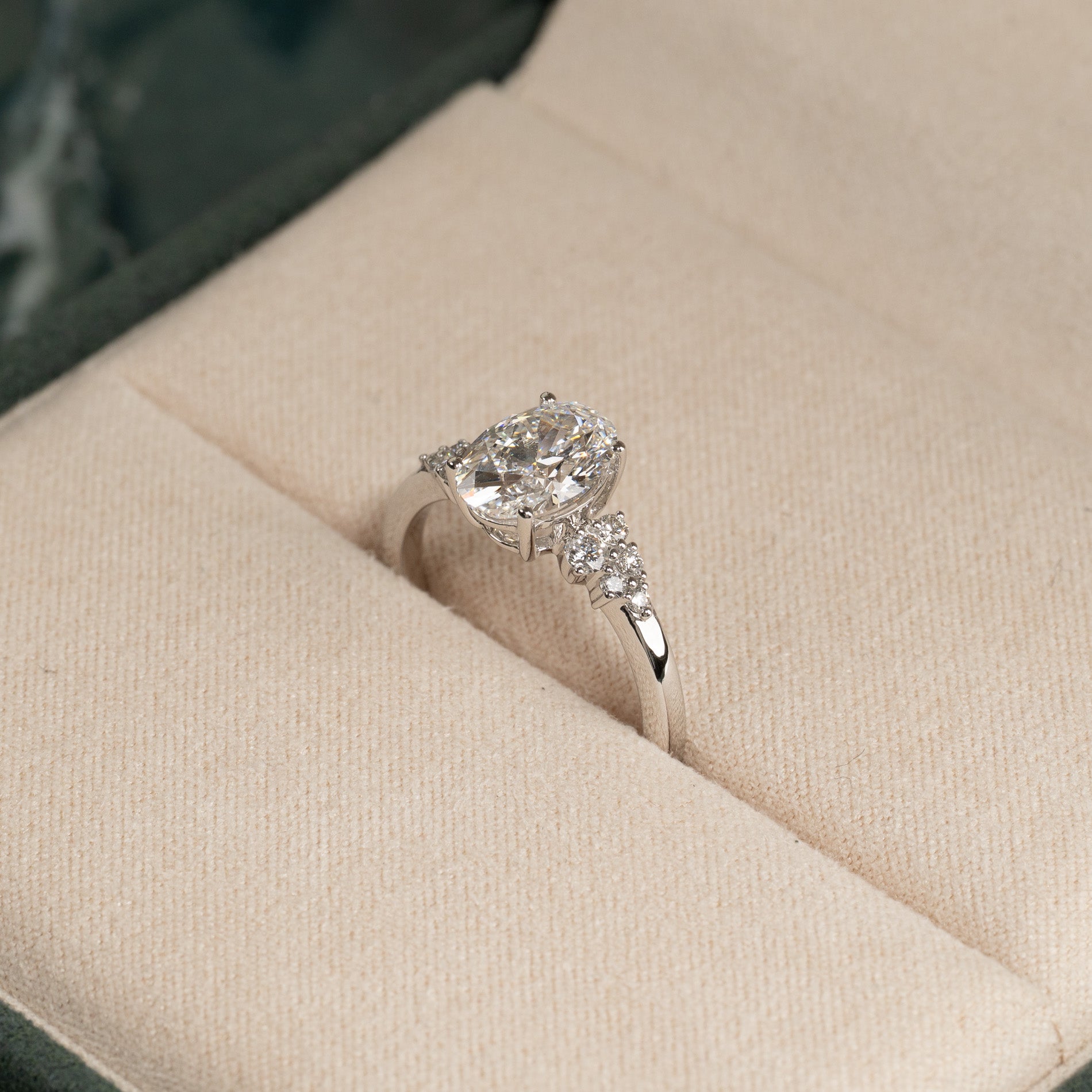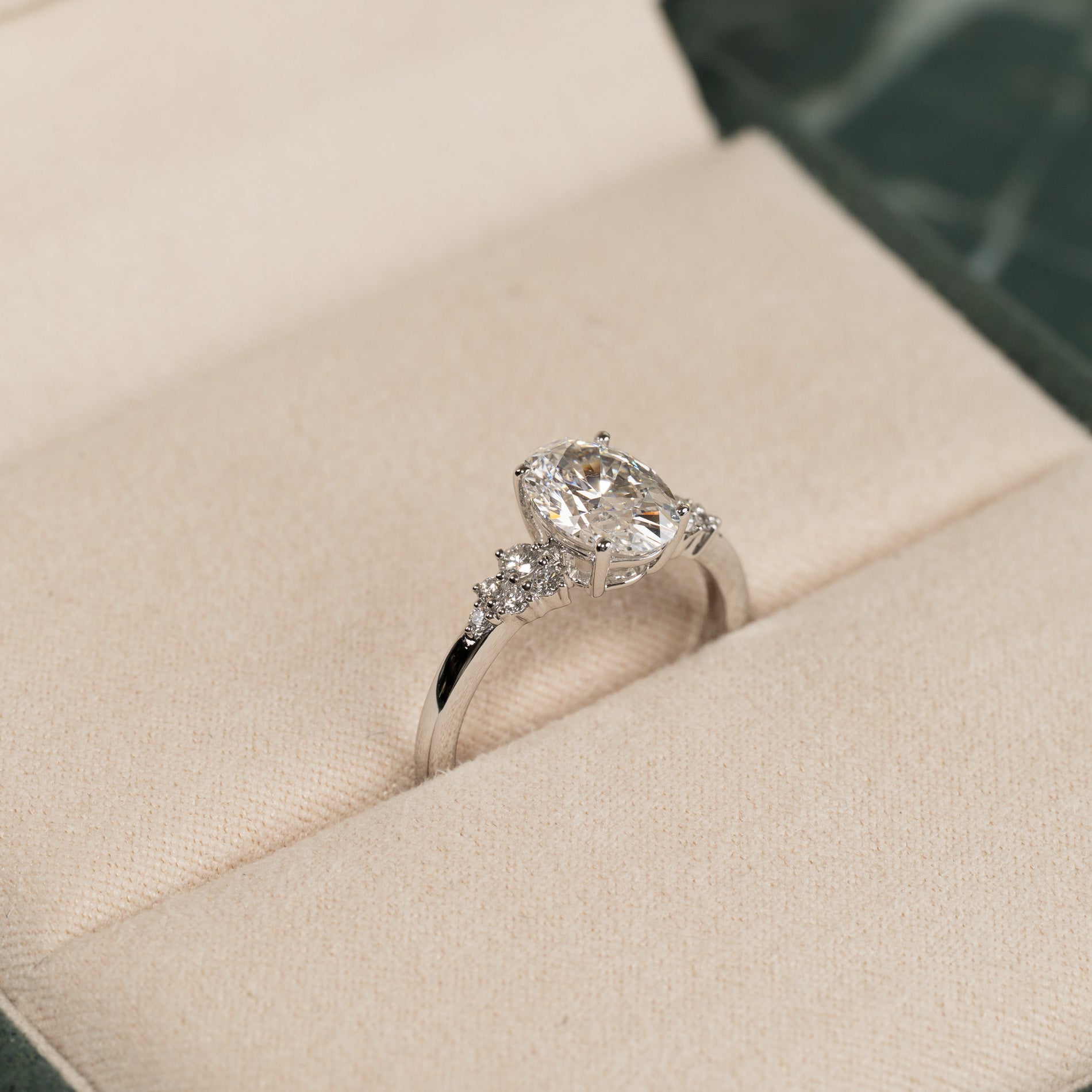 Oval klyngering i 14 karat hvitt gull med 1,69 ct. oval lab-grown midtstein og delikate sidestein