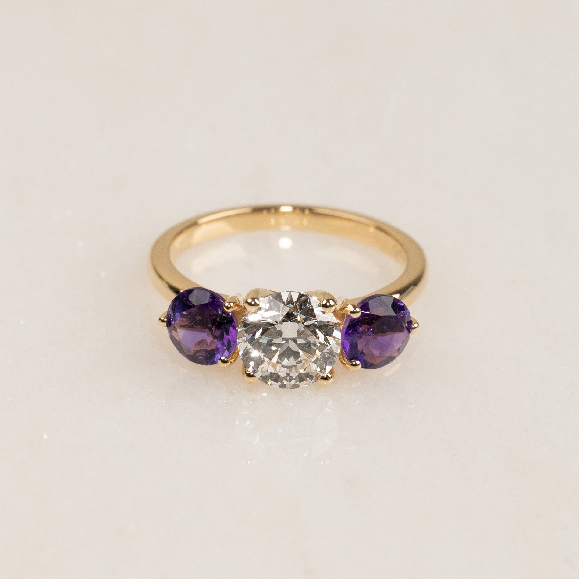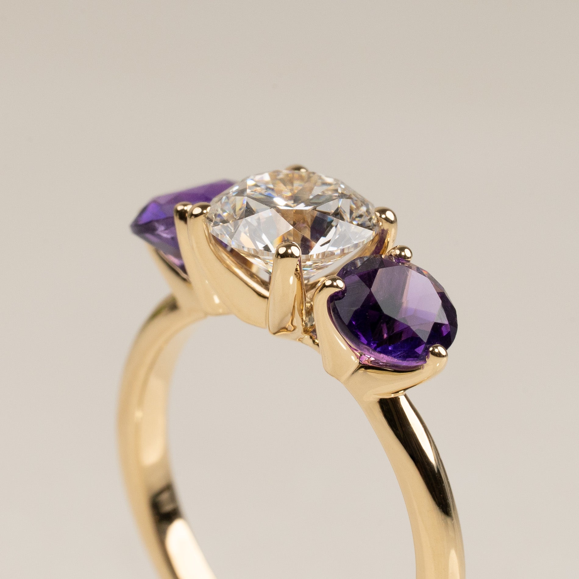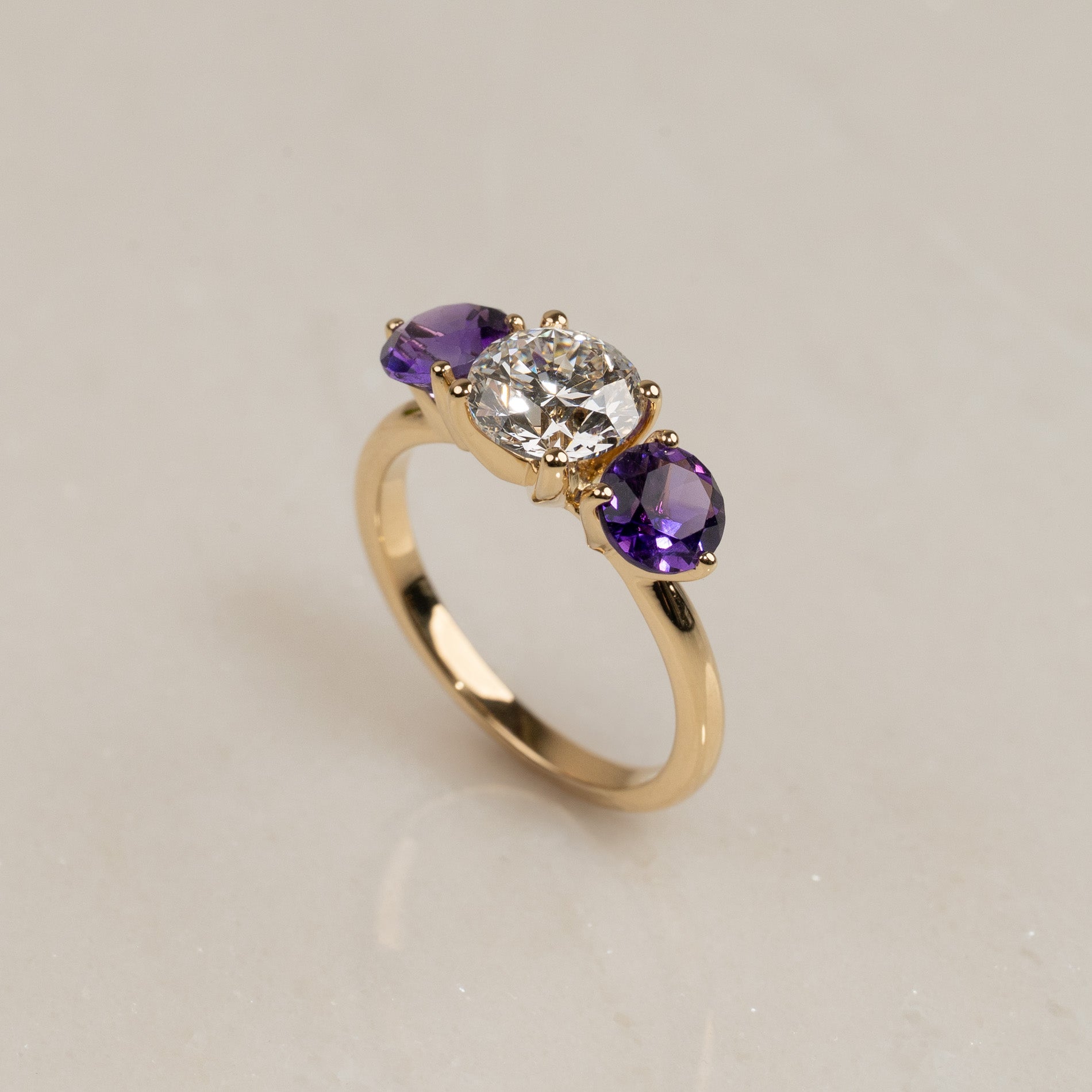 Ringen er laget i 18 kt. massivt gull med et vakkert fargespill og et elegant uttrykk. Den funklende midtdiamanten på 1,5 ct er innrammet av to dype, lilla ametyster som gir designet både dybde og karakter. Samspillet mellom den klare diamanten, de fargerike ametystene og det varme gullet skaper en ring som fremstår både personlig og sofistikert.