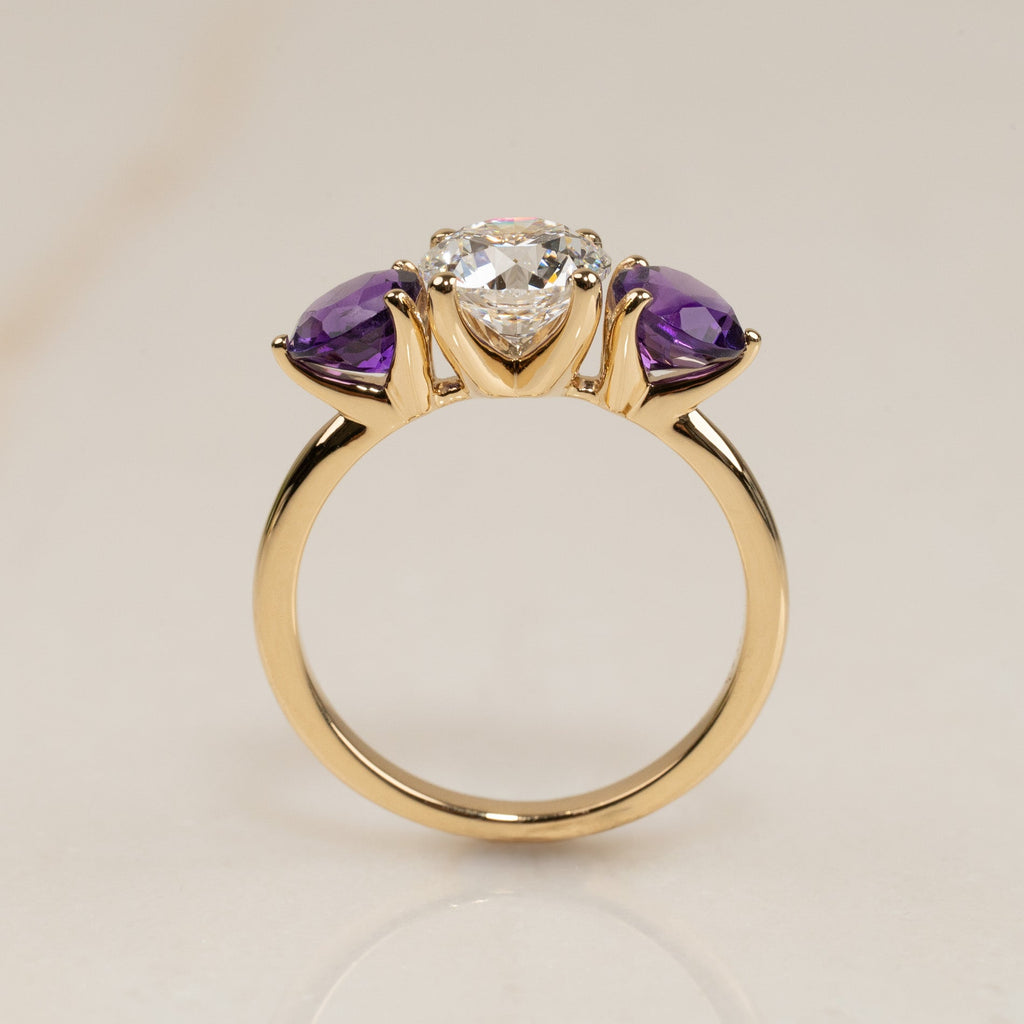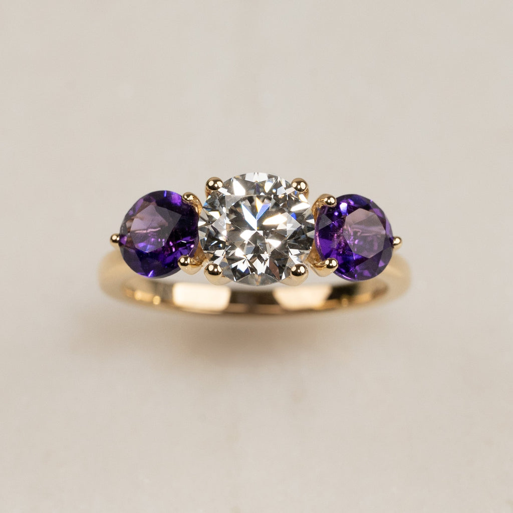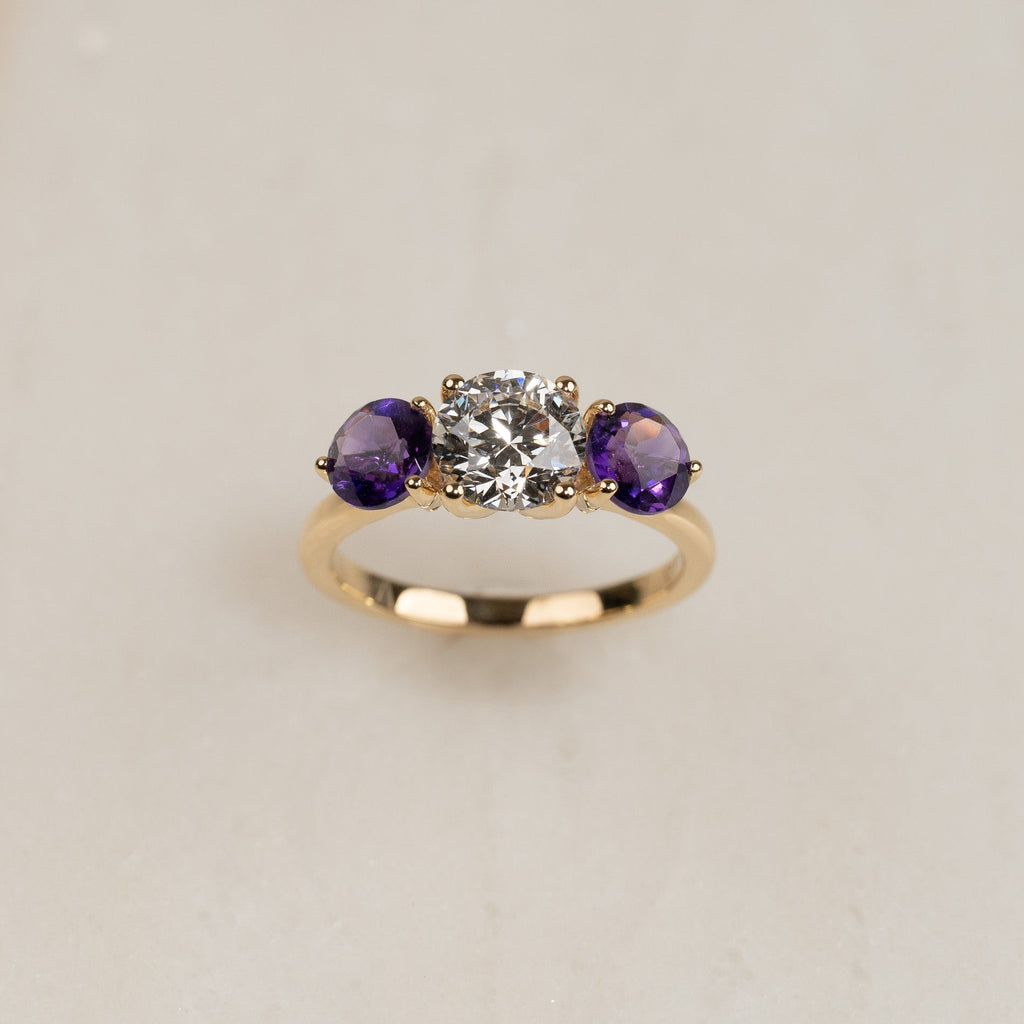 Ringen er laget i 18 kt. massivt gull med et vakkert fargespill og et elegant uttrykk. Den funklende midtdiamanten på 1,5 ct er innrammet av to dype, lilla ametyster som gir designet både dybde og karakter. Samspillet mellom den klare diamanten, de fargerike ametystene og det varme gullet skaper en ring som fremstår både personlig og sofistikert.