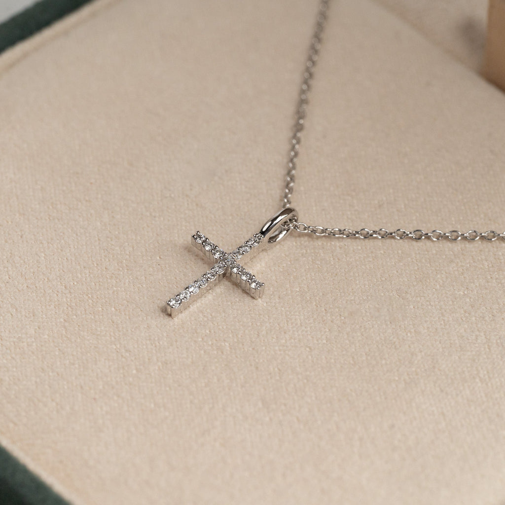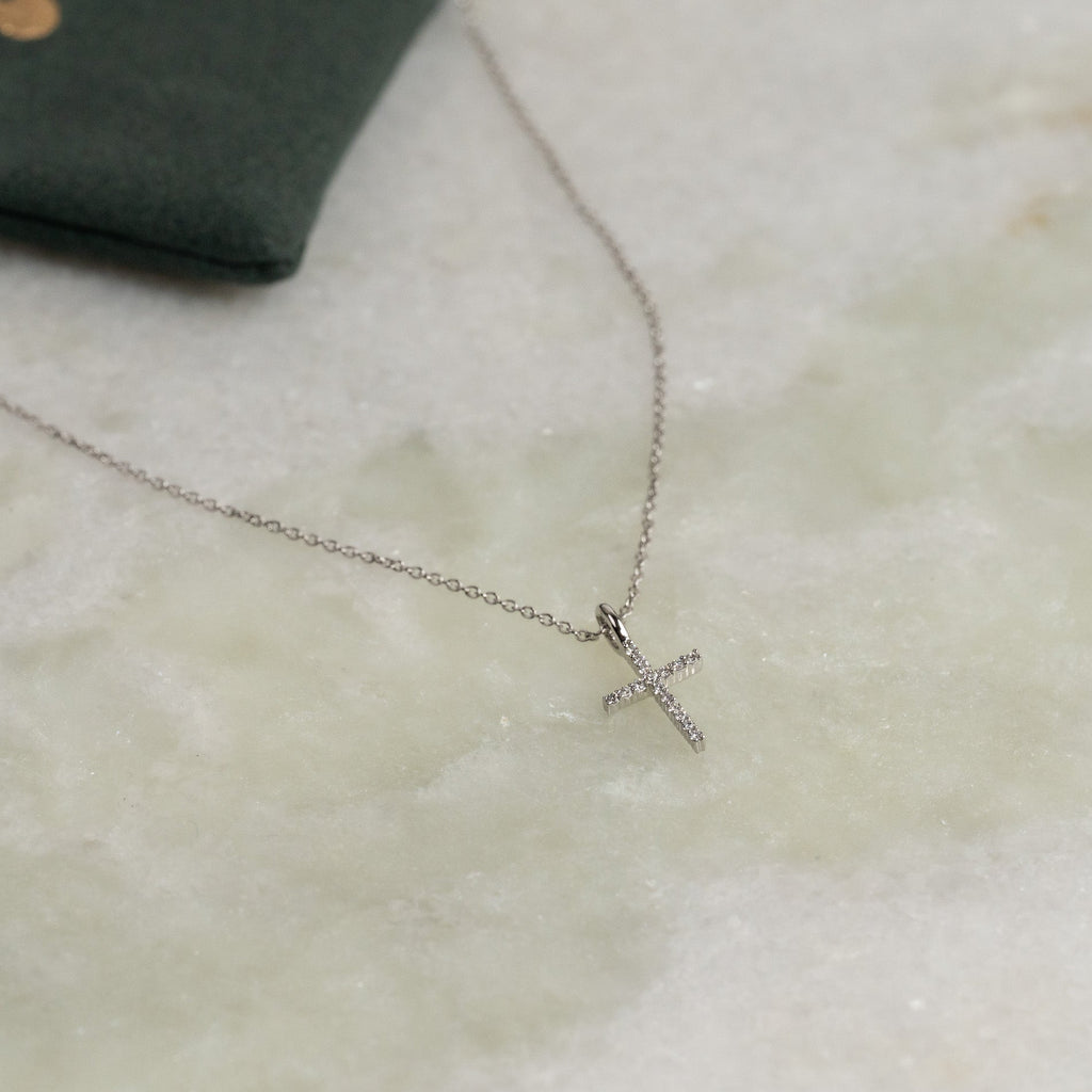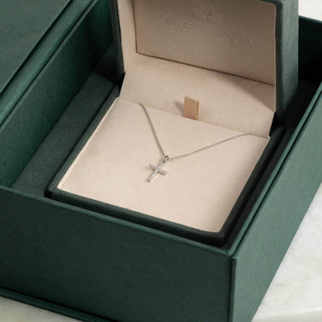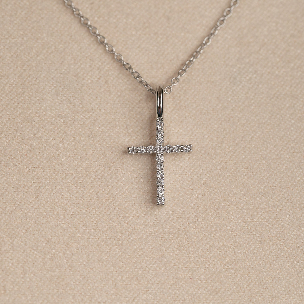Klassisk korsanheng i 14 kt massivt hvitt gull med laboratoriedyrkede diamanter på totalt 0,08 ct.