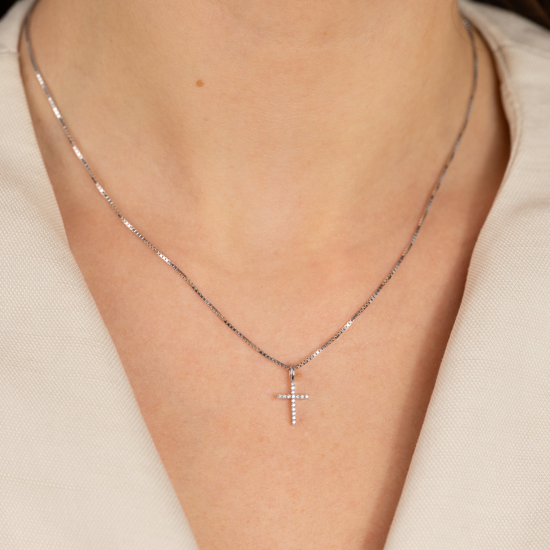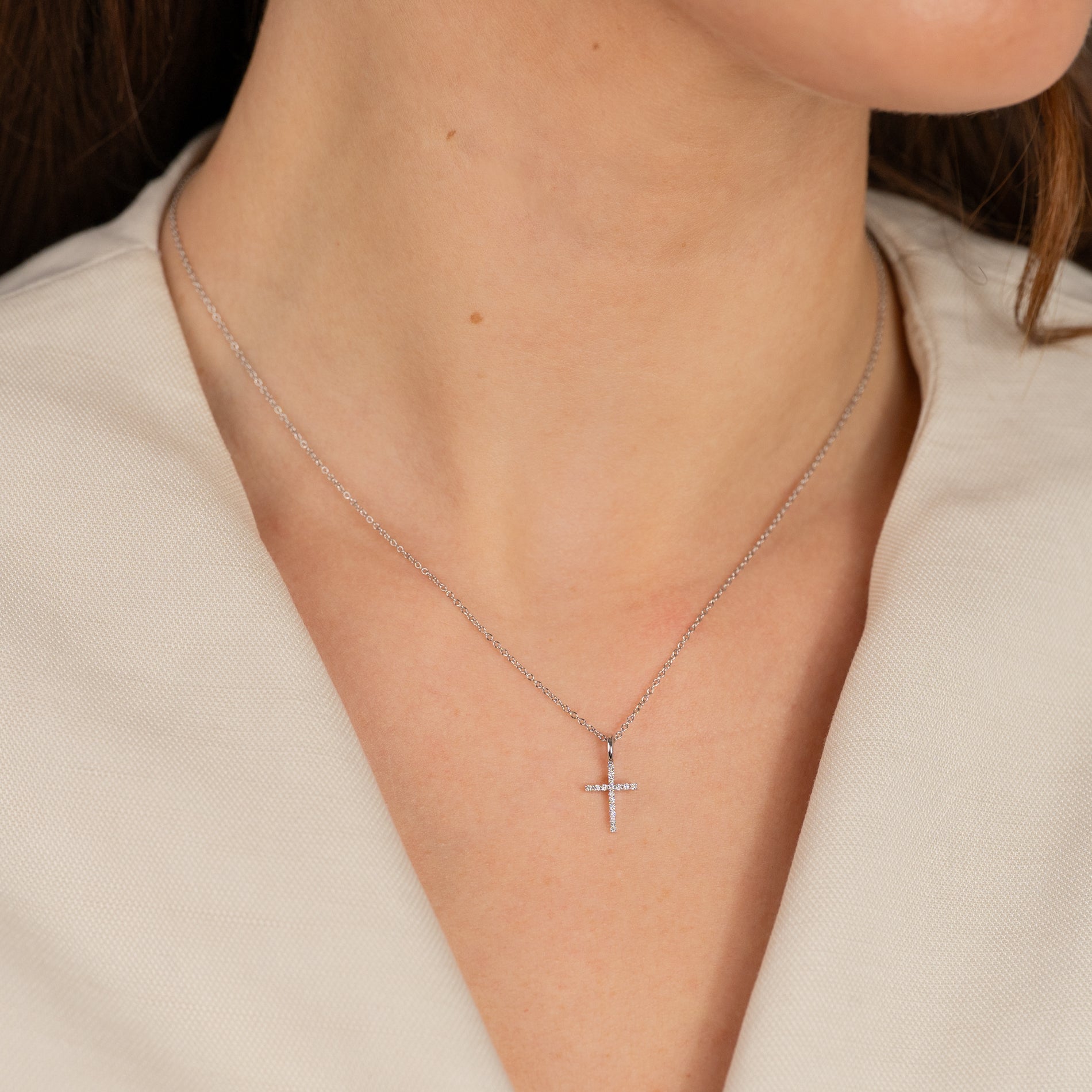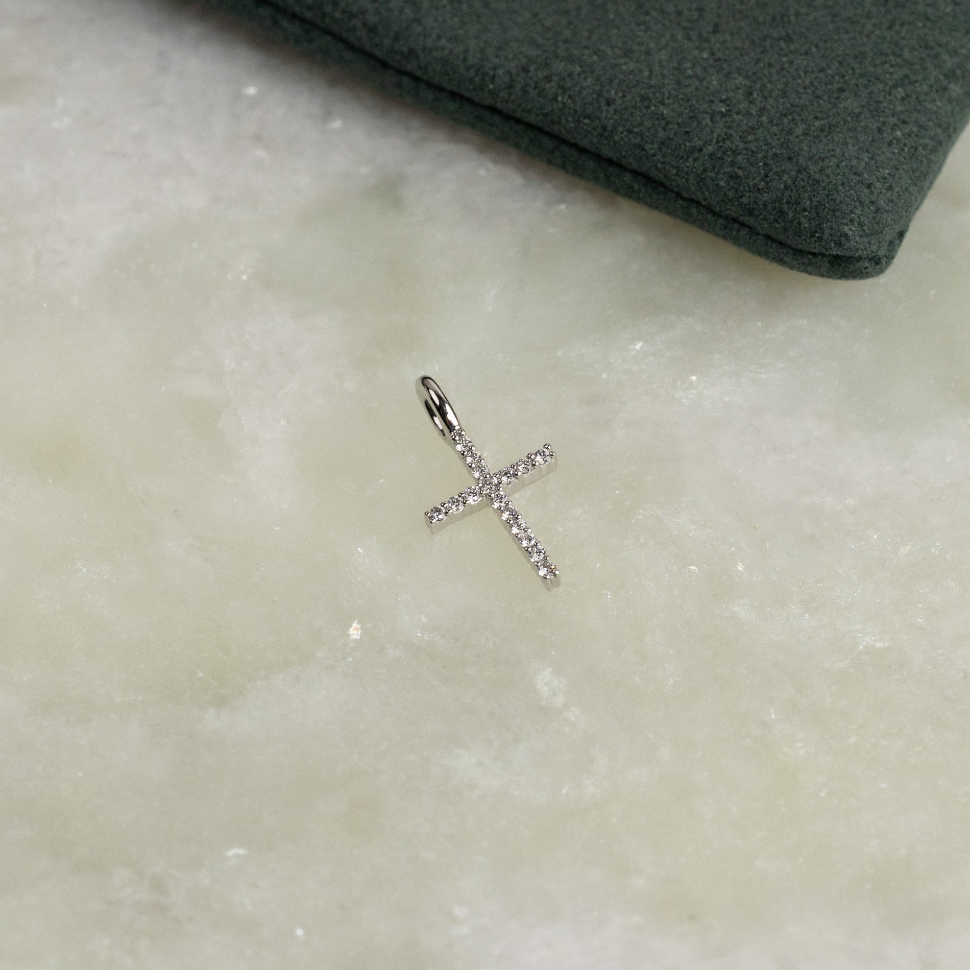Klassisk korsanheng i 14 kt massivt hvitt gull med laboratoriedyrkede diamanter på totalt 0,08 ct.