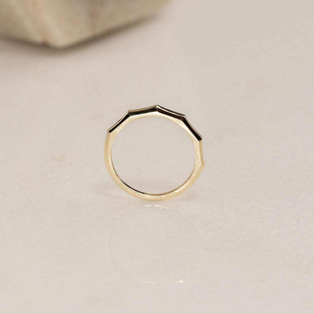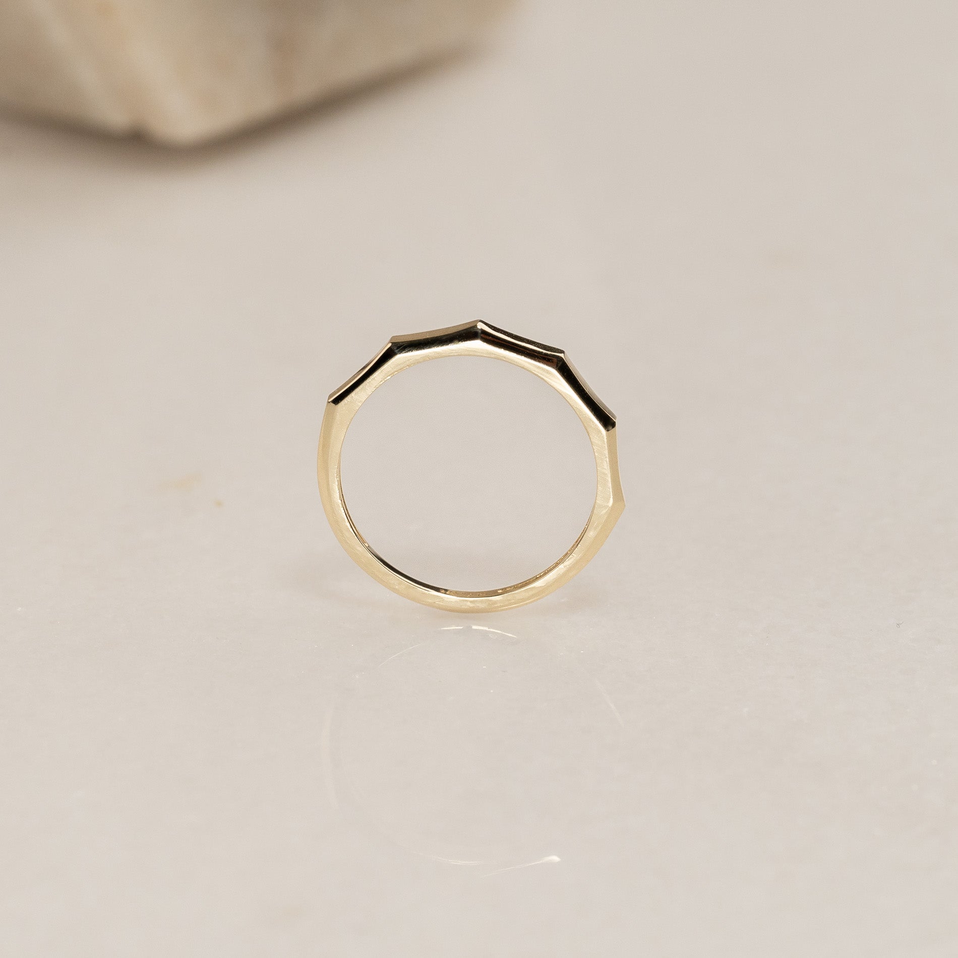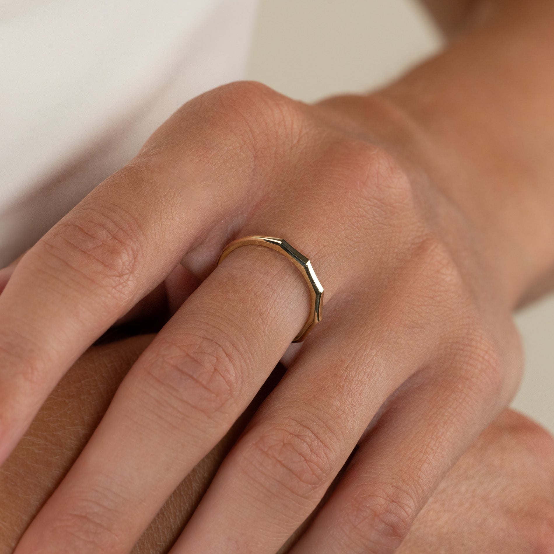 Ringen er laget i 100% resirkulert 9 karat massivt gull. Den har en kantete overside med fem like flater, som sammen er den øvre halvdelen av ringen.