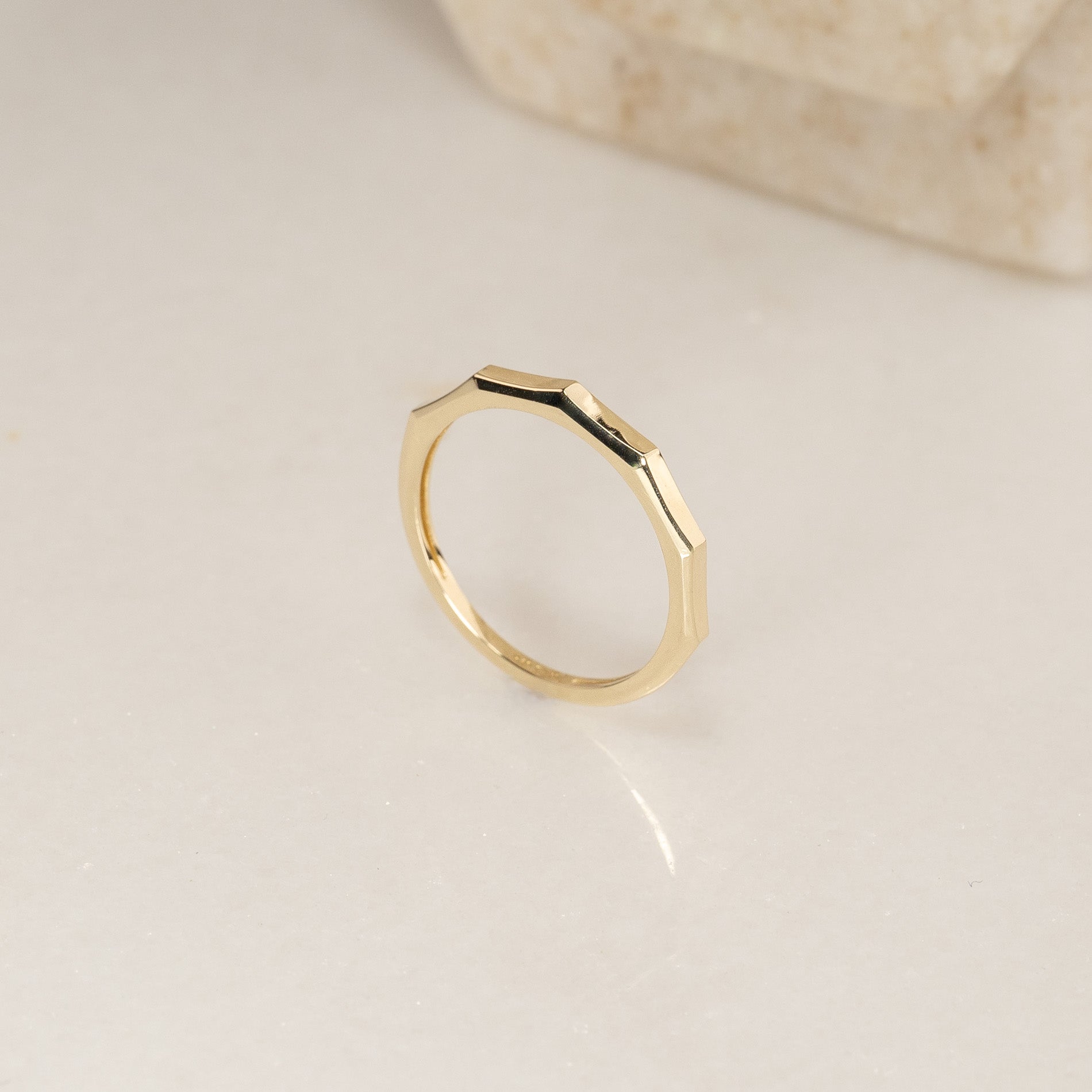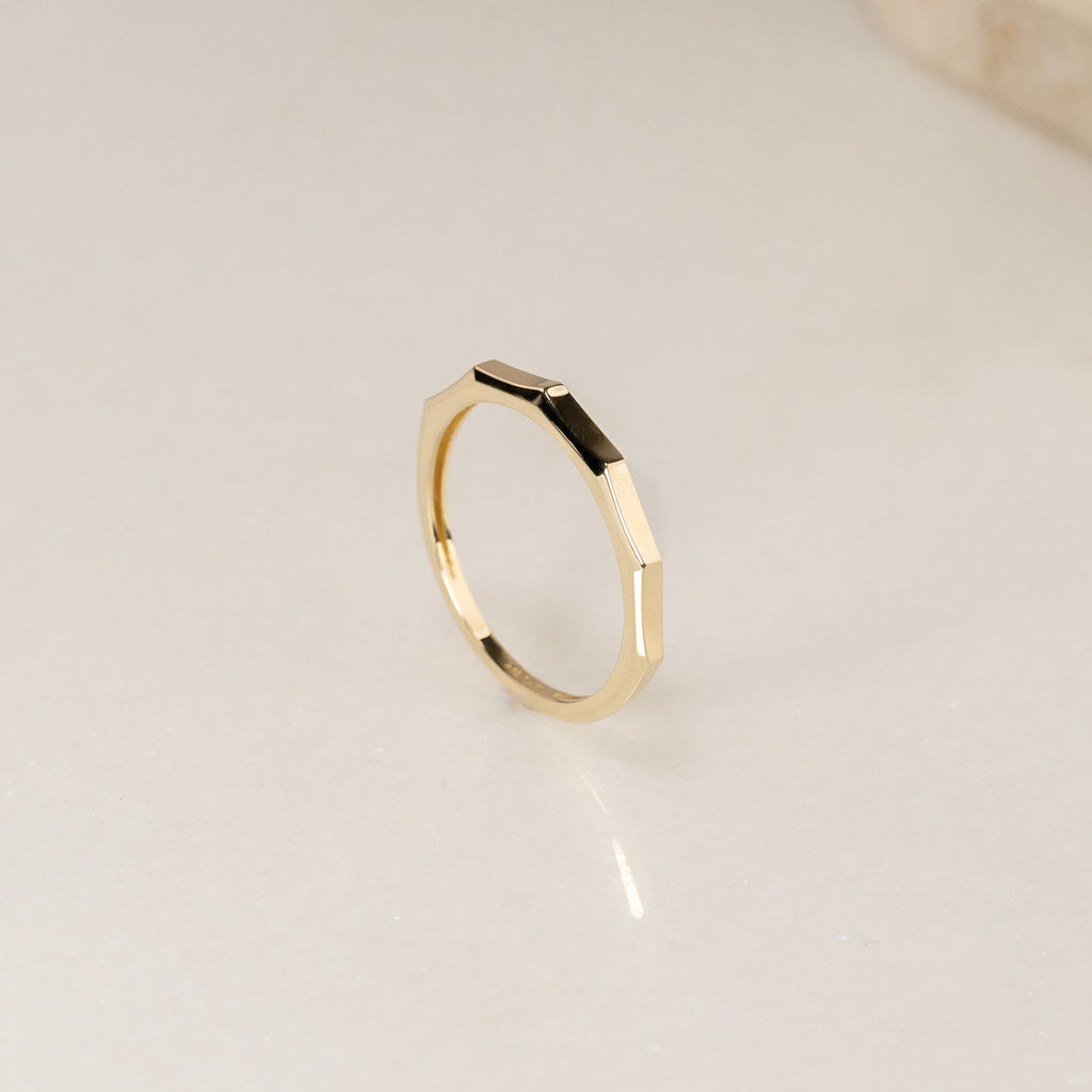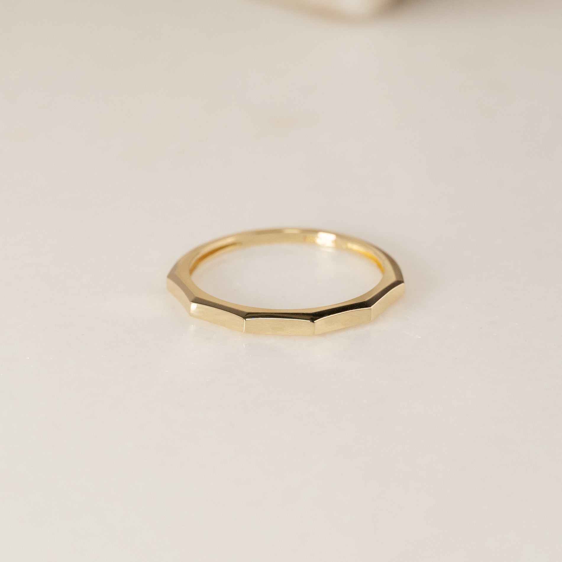 Ringen er laget i 100% resirkulert 9 karat massivt gull. Den har en kantete overside med fem like flater, som sammen er den øvre halvdelen av ringen.