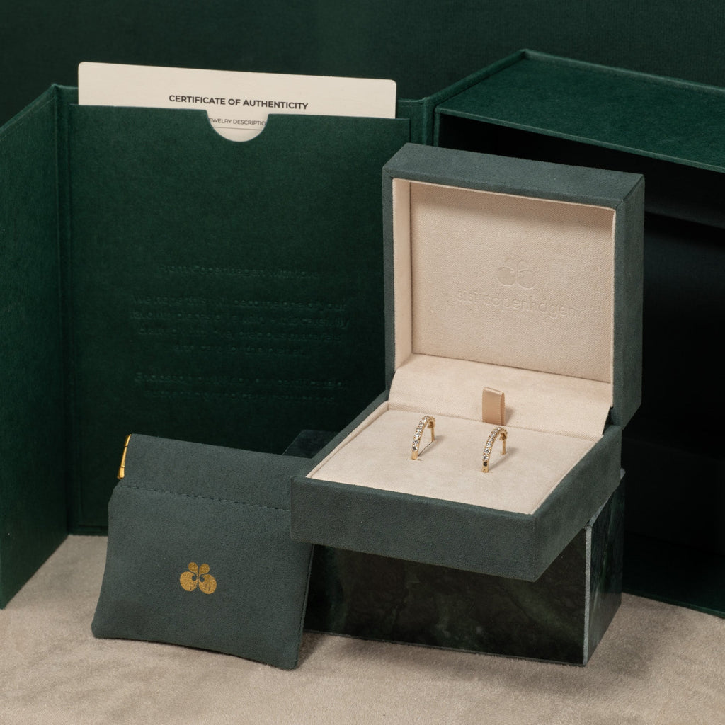 Smykkene kommer i vår eksklusive Diamond Collection-boks med et lekkert smykkeskrin, sertifikat og pouch. Esken er også perfekt hvis smykket skal gis i gave.
