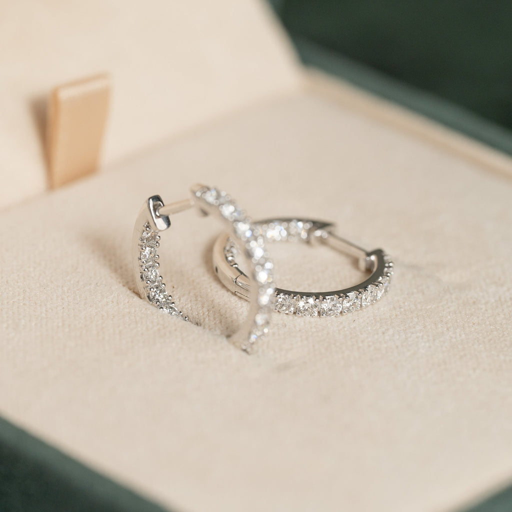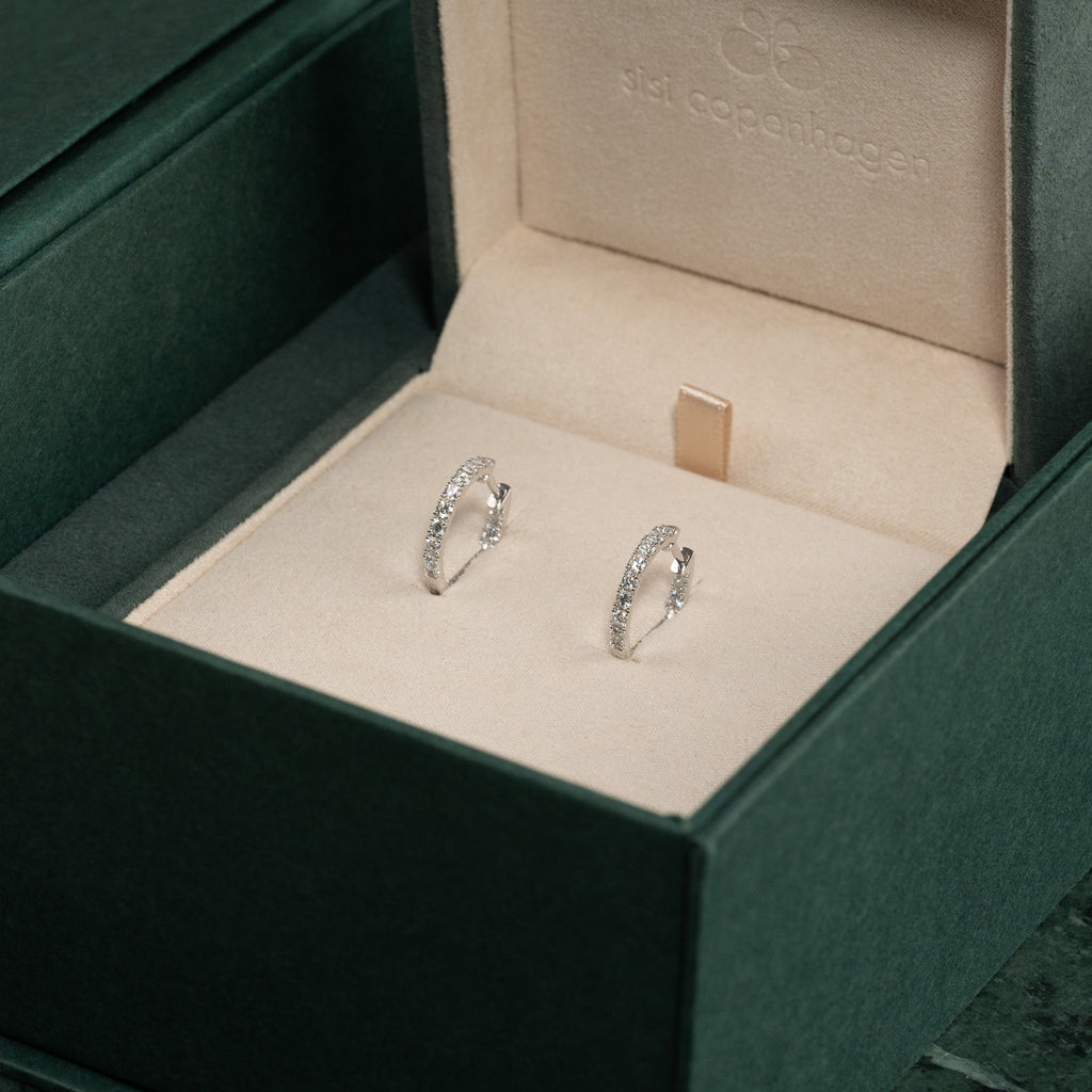 Creoler i 14 karat hvittgull besatt med 0,8 ct. Lab-grown diamanter utvendig og innvendig. Øreringene er moderne, ekstraordinære og utrolig elegante. De er perfekte til festlige begivenheter, eller hvis man ønsker et dekadent hverdags smykke som skiller seg ut. De måler ca. 17 mm i diameter.