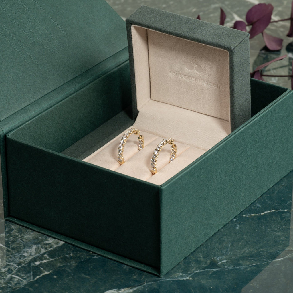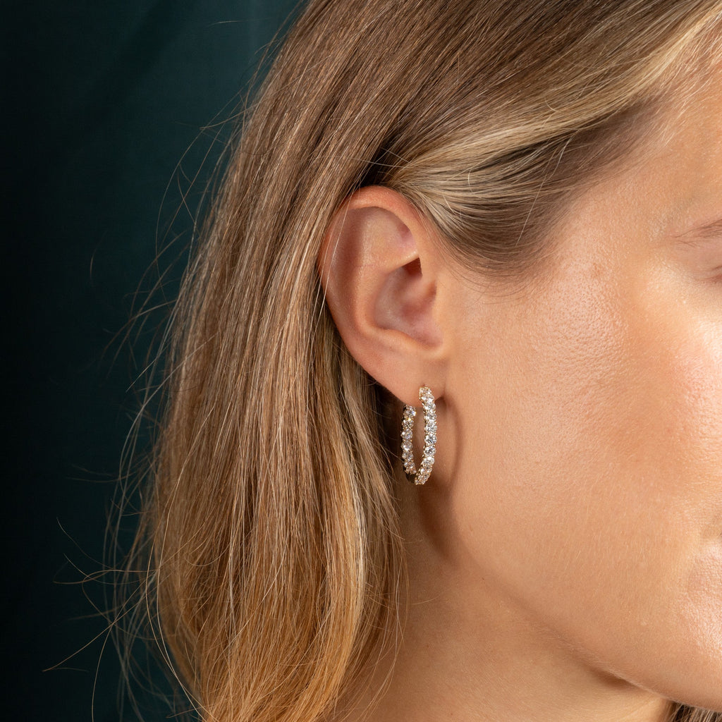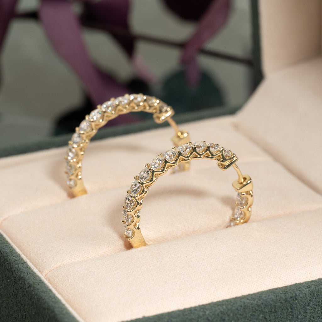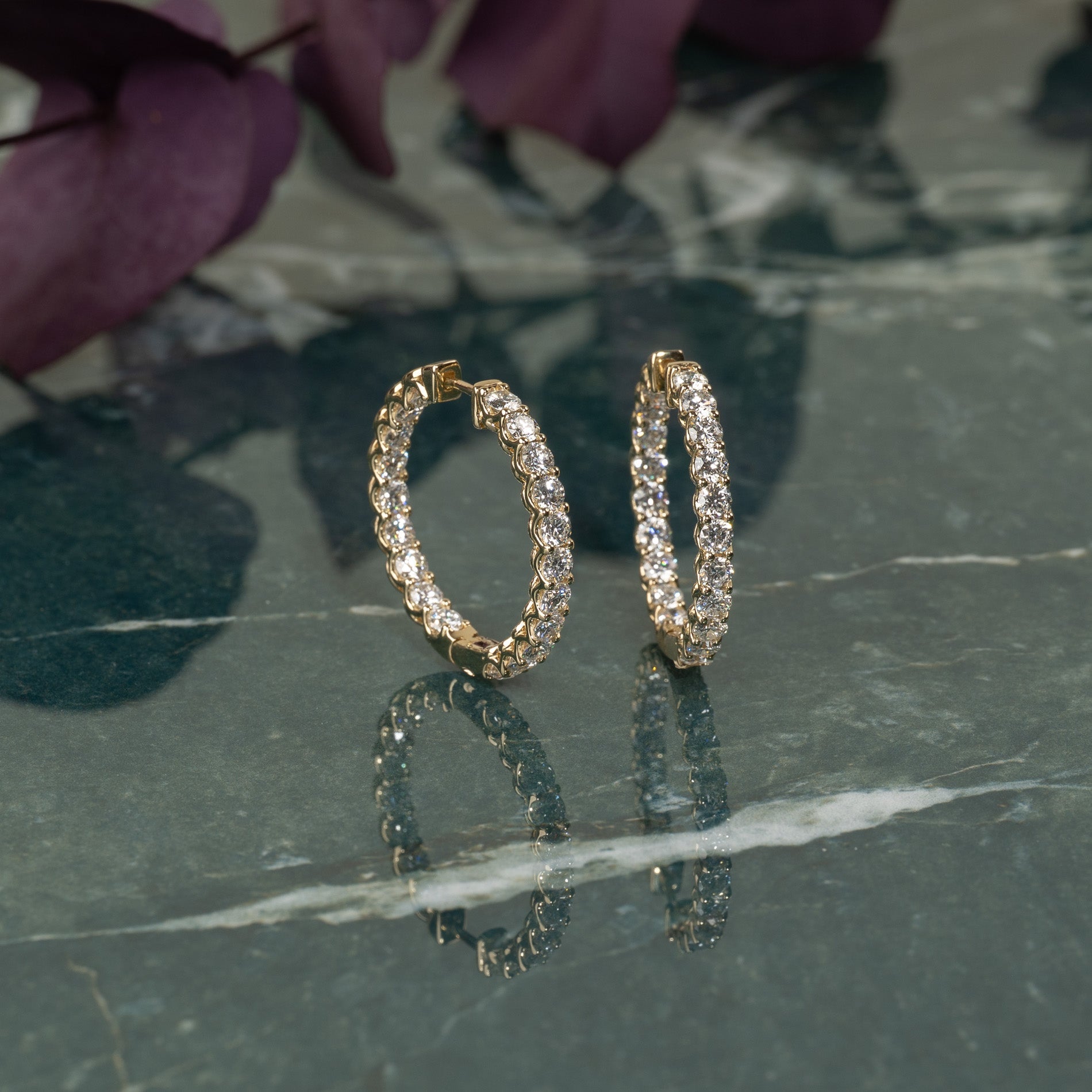 Kreolske øredobber i 14 karat gull med 4 carat lab-grown diamanter på utsiden og innsiden. Øredobbene er tidløse, ekstraordinære og utrolig elegante. De er perfekte til festlige anledninger eller hvis du ønsker et dekadent smykke til hverdagsbruk som skiller seg ut.