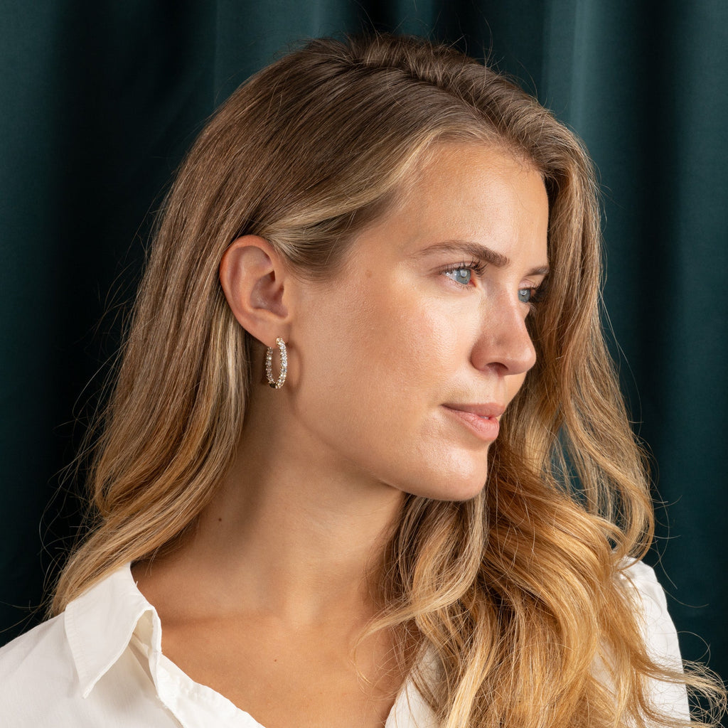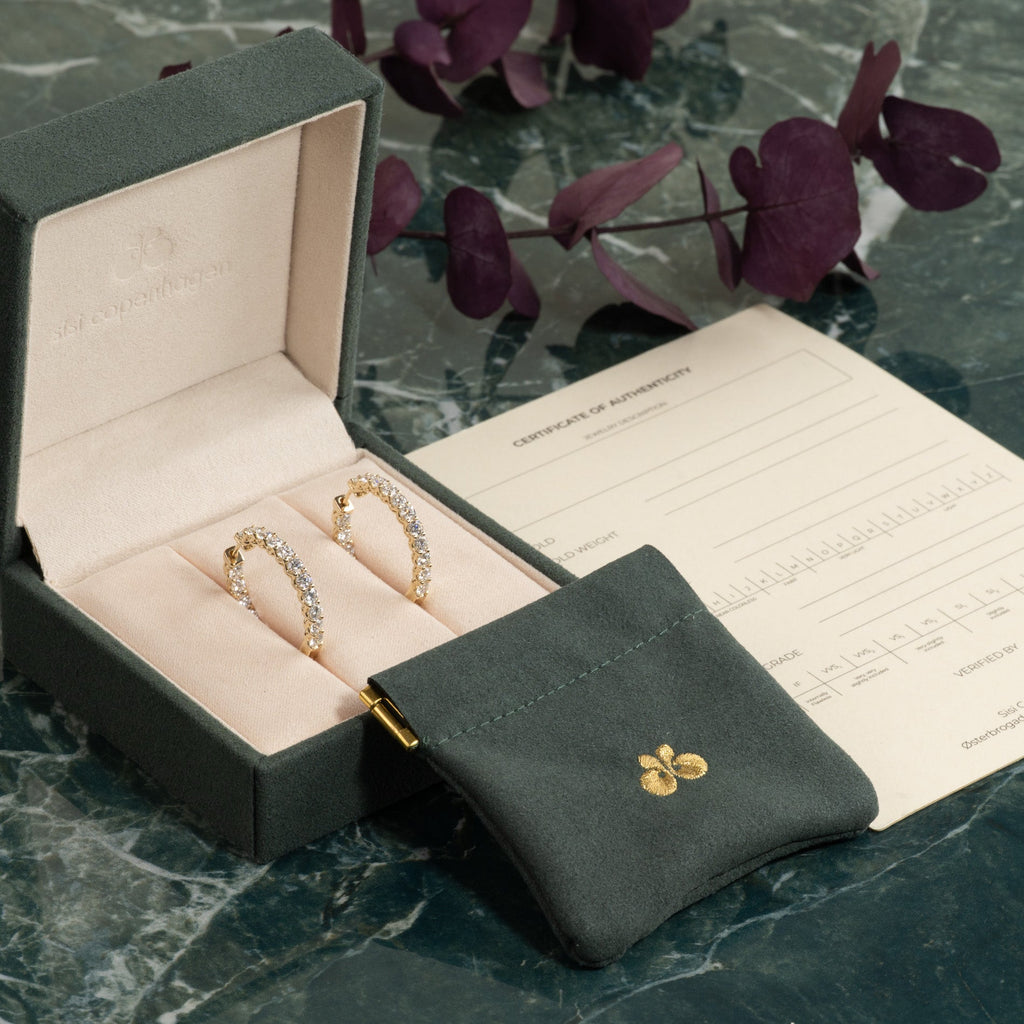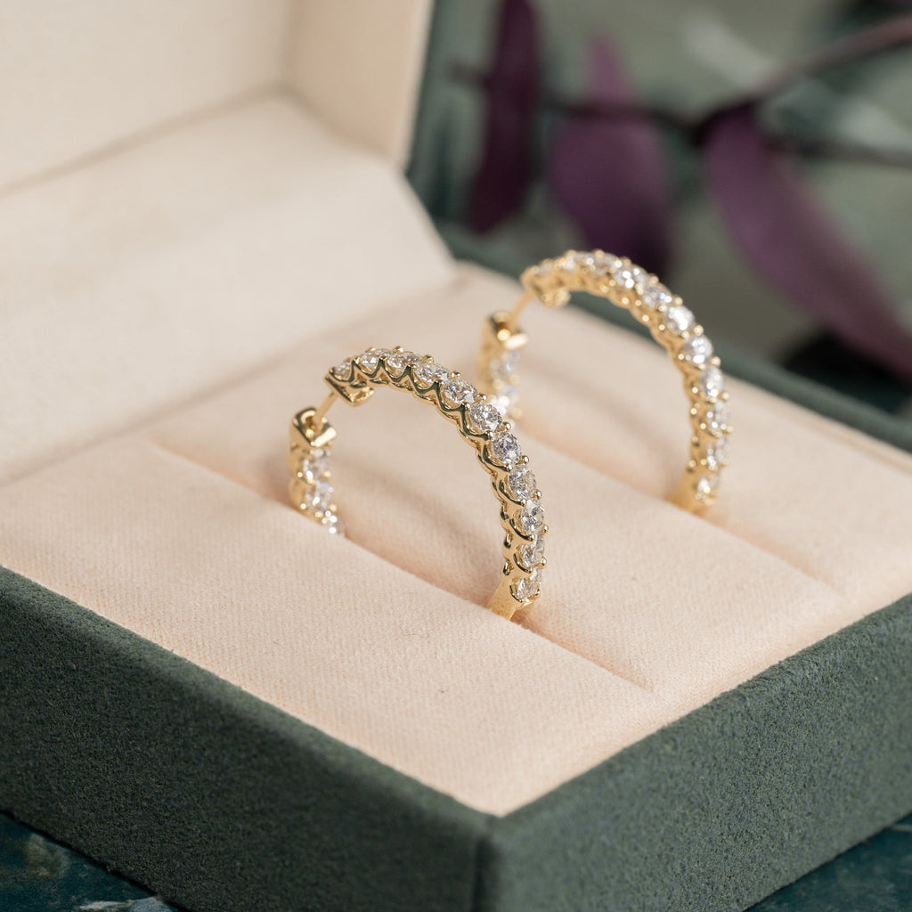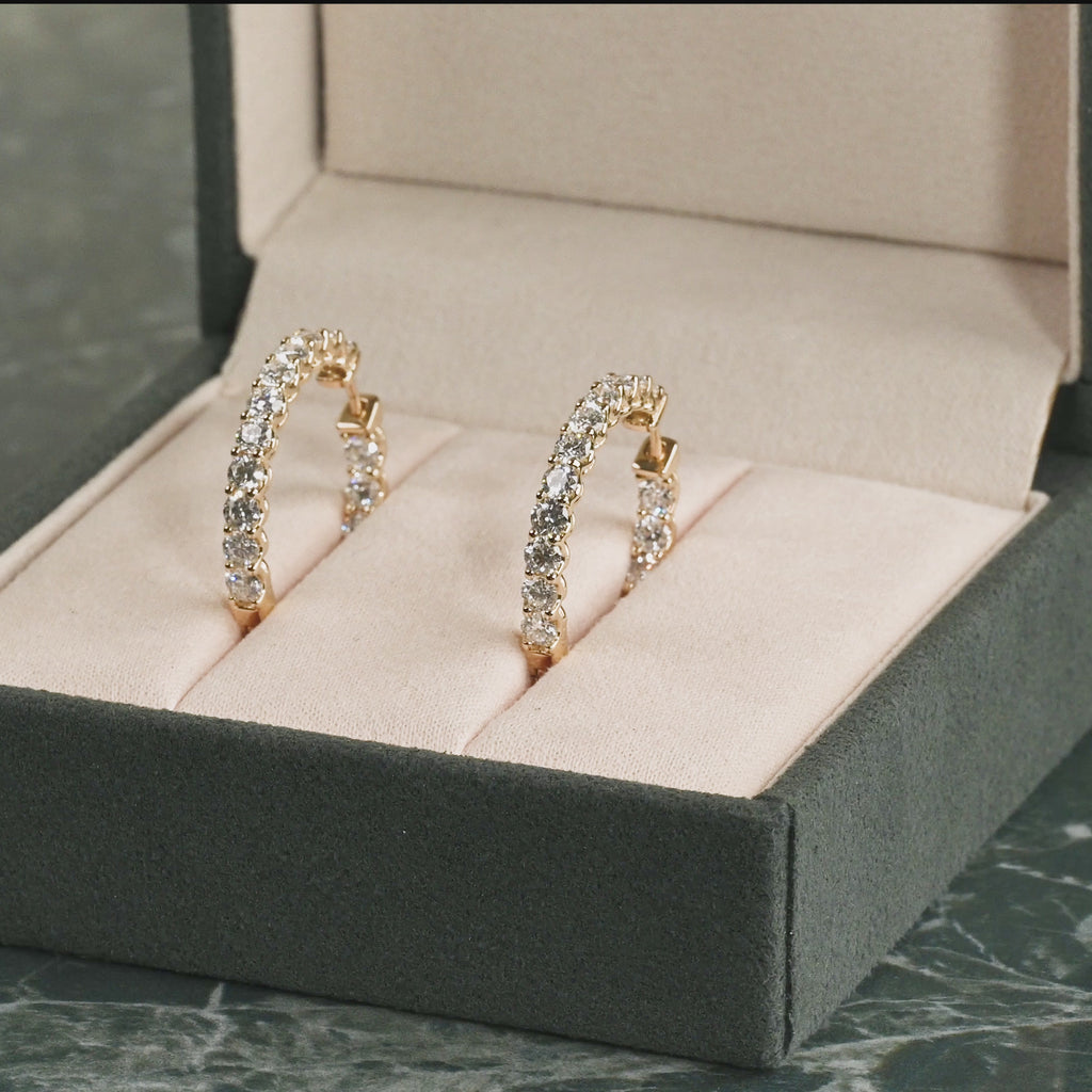 Kreolske øredobber i 14 karat gull med 4 carat lab-grown diamanter på utsiden og innsiden. Øredobbene er tidløse, ekstraordinære og utrolig elegante. De er perfekte til festlige anledninger eller hvis du ønsker et dekadent smykke til hverdagsbruk som skiller seg ut.