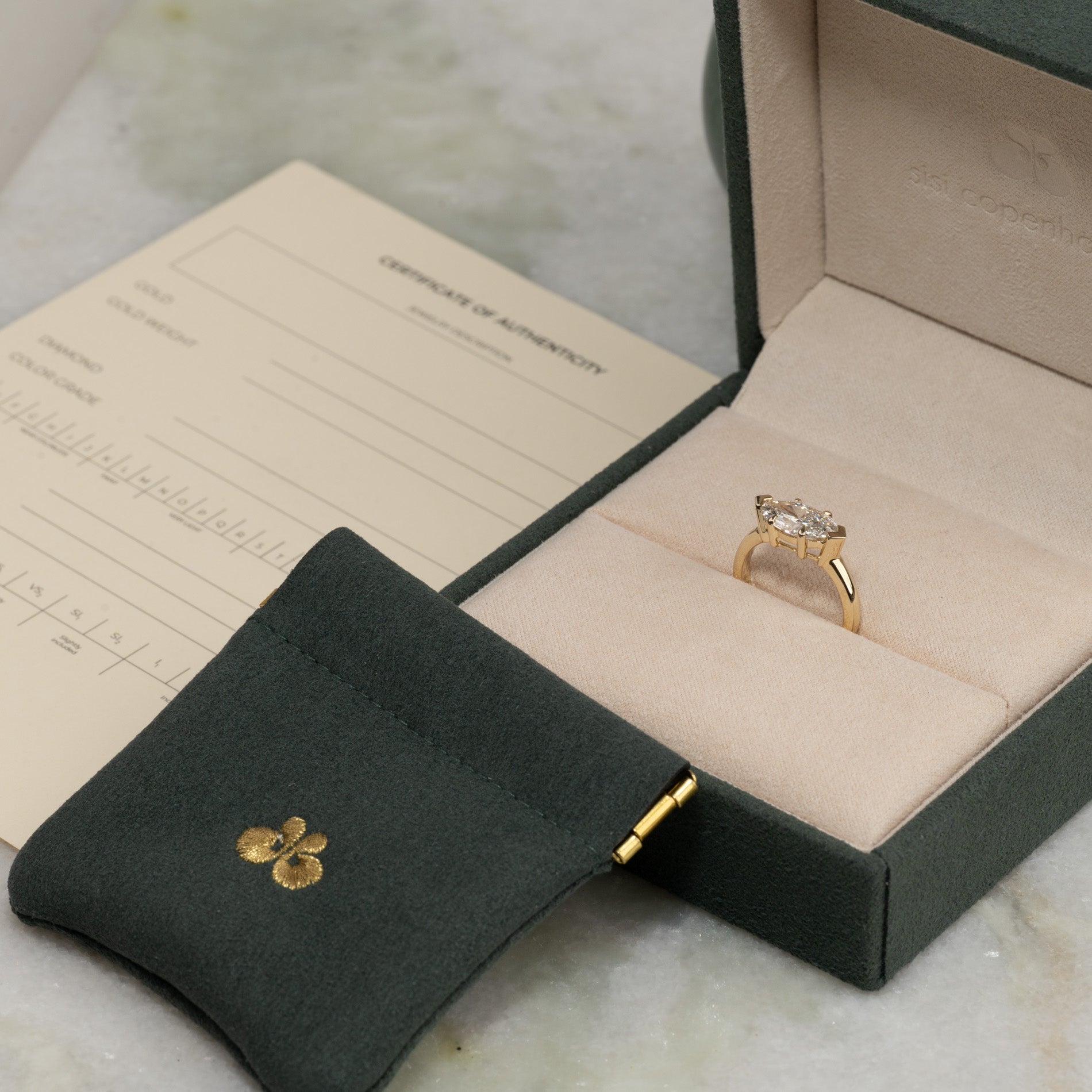 Når du mottar smykket, vil det være i vår gaveeske, bundet med et vakkert matchende silkebånd, klar til å gis som gave. Inne i esken finner du en smykkeboks, en pose og et ekthetsbevis.