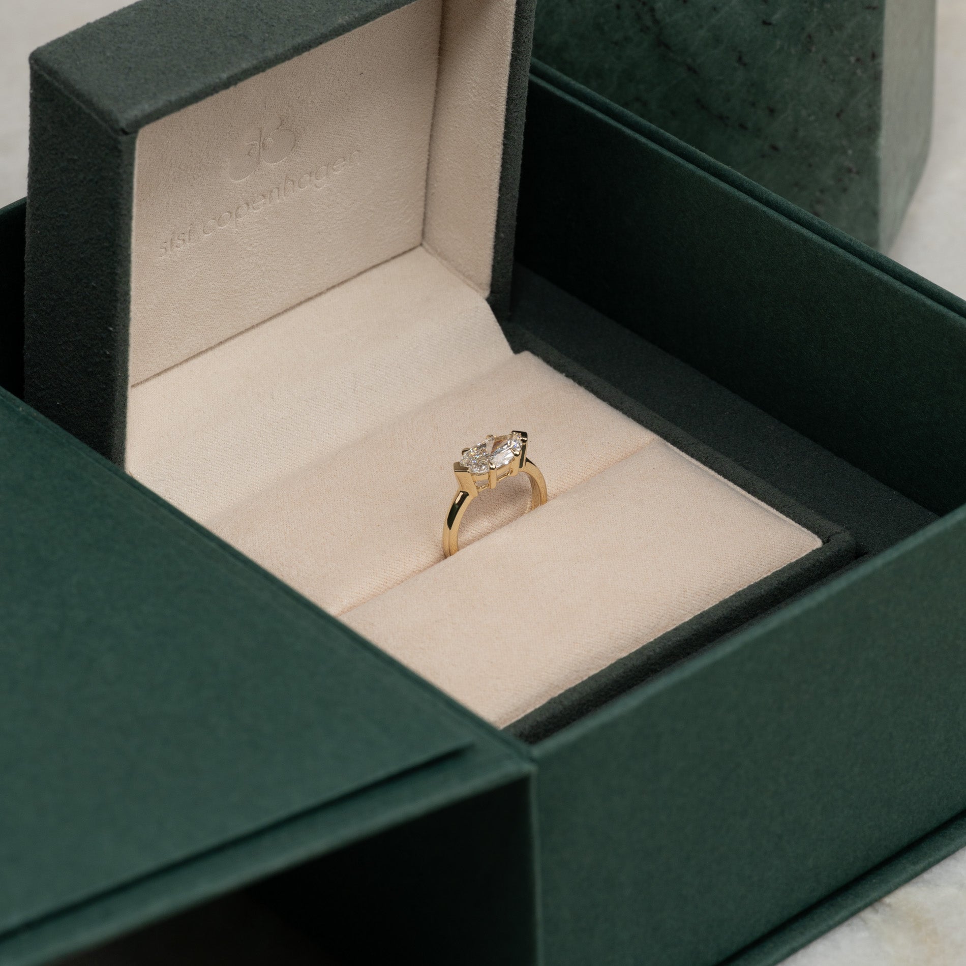 Smykket er pent og sikkert plassert i en smykkeboks som er trukket med vegansk semsket skinn.