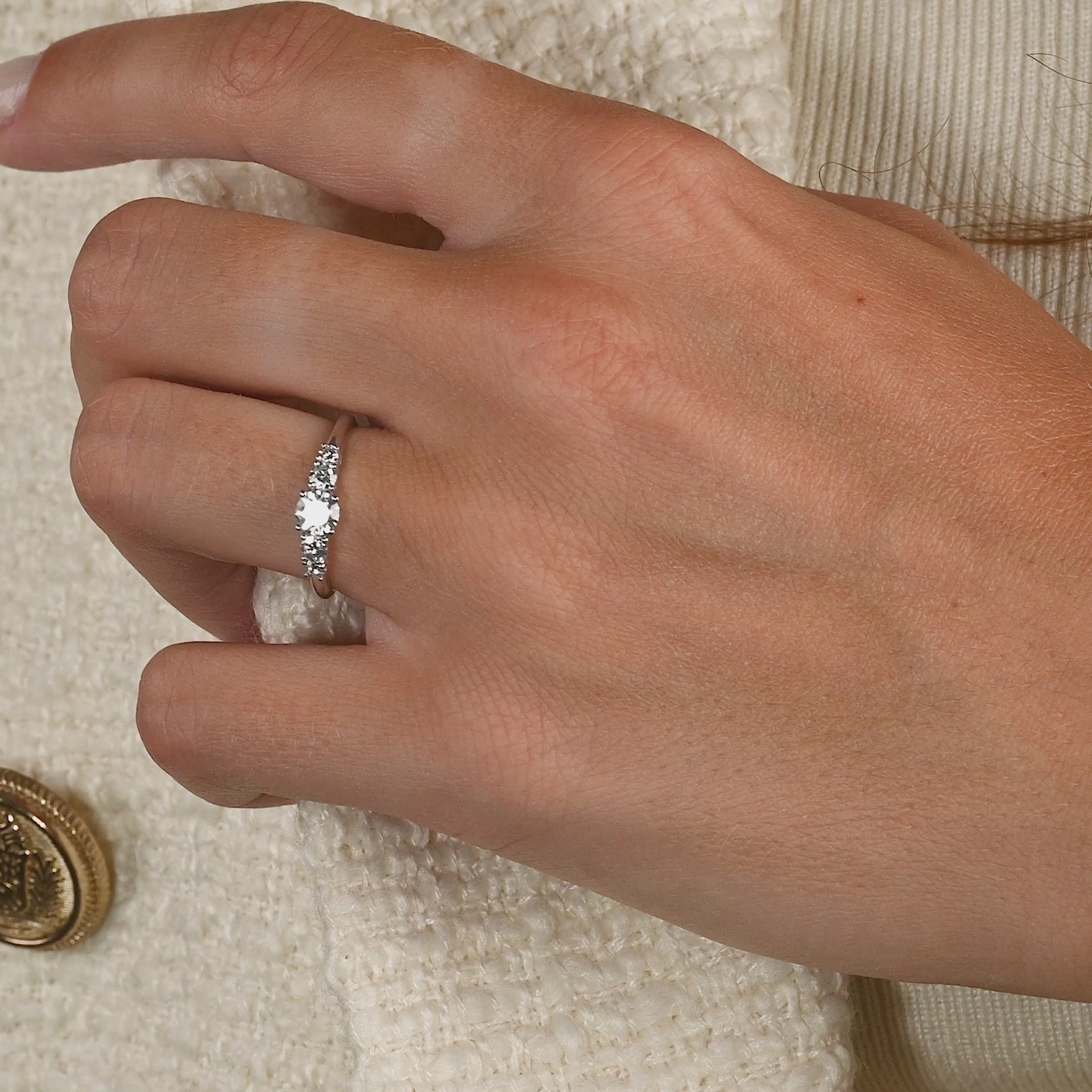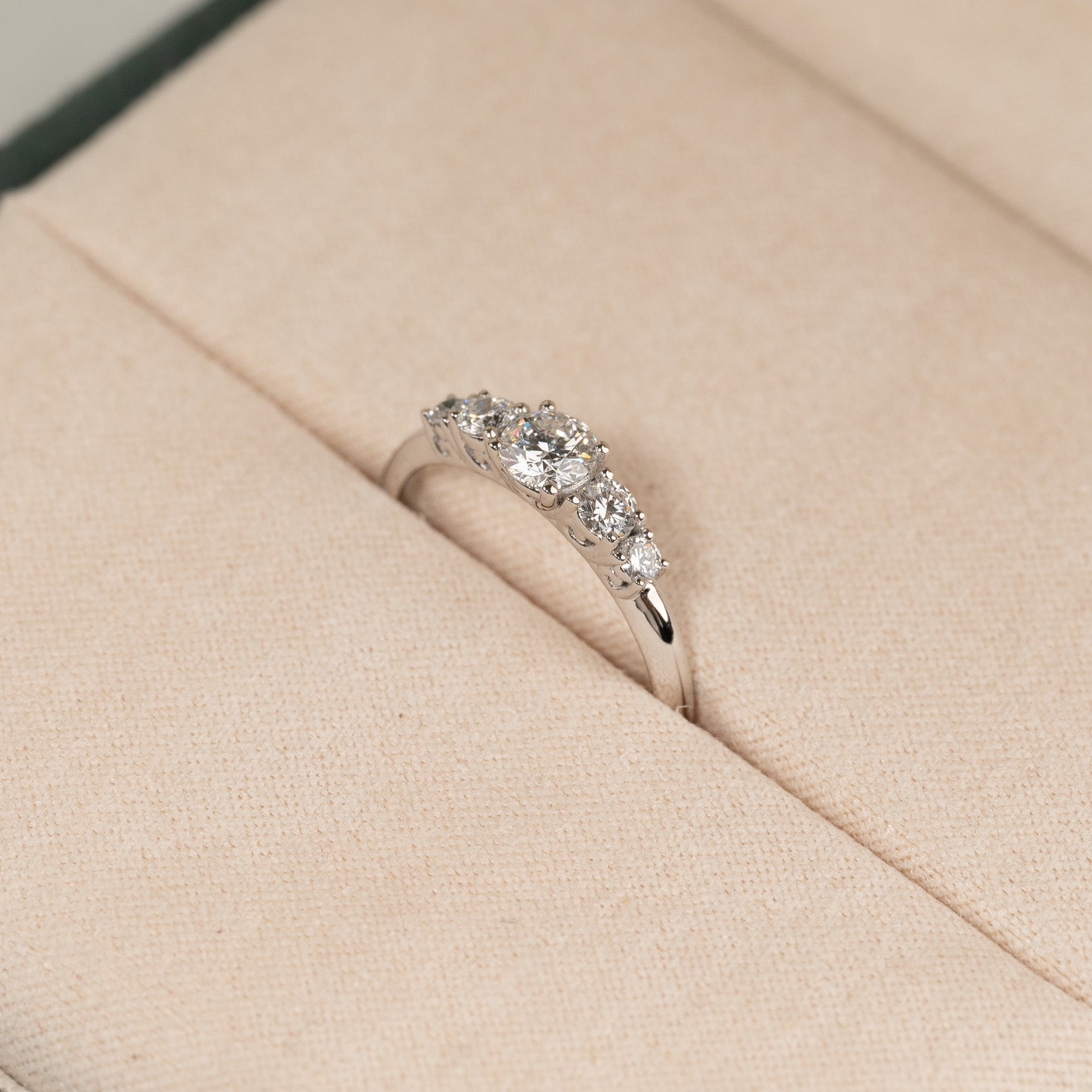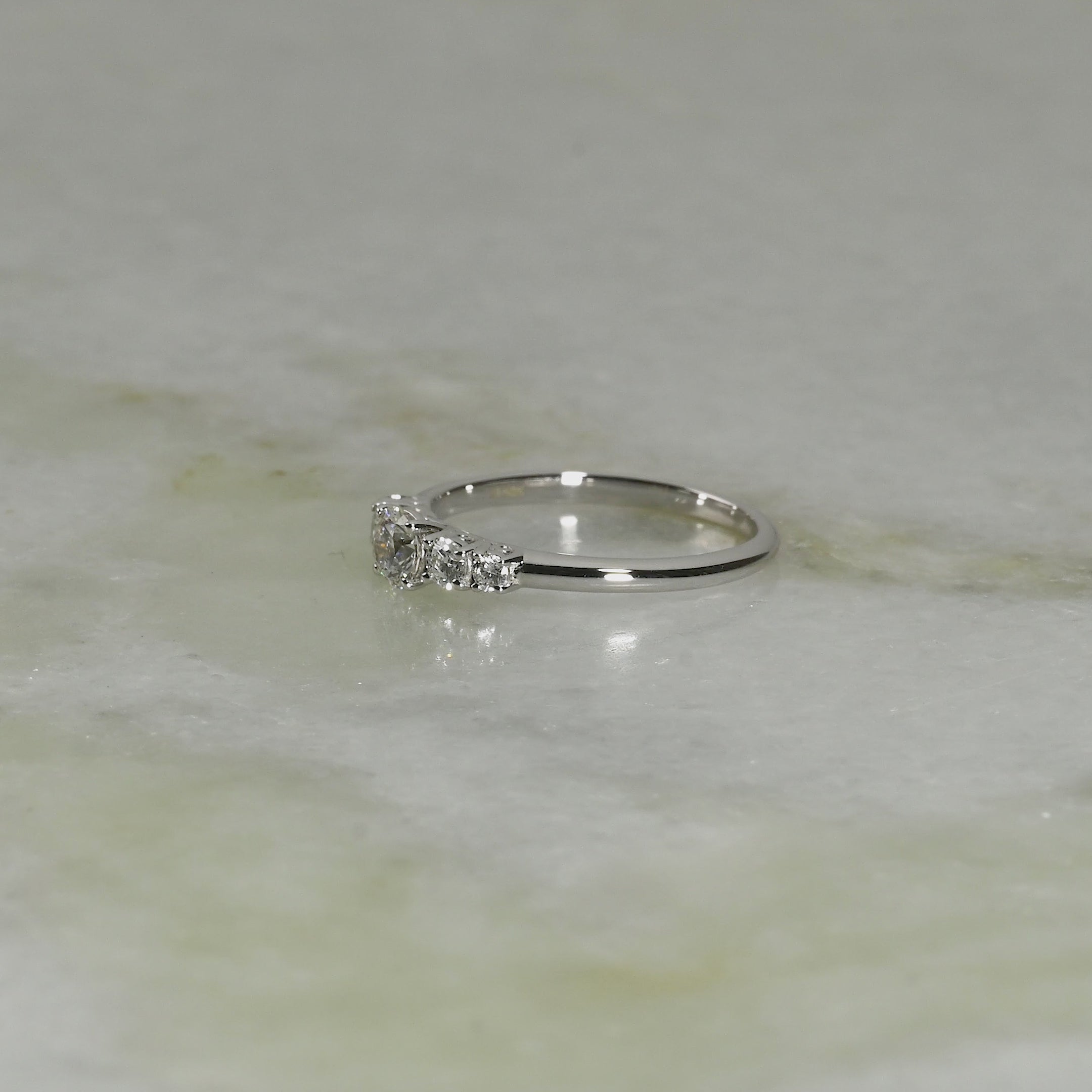 Ringen er laget i 14 karat massivt hvitt gull med fem lab-grown diamanter med en total vekt på 0,5 ct. Diamantene har fargen E/F River og klarhet VVS. Smykket er laget med omhu; diamantene er blant annet produsert ved hjelp av solenergi, og gullet er 100% sertifisert resirkulert.