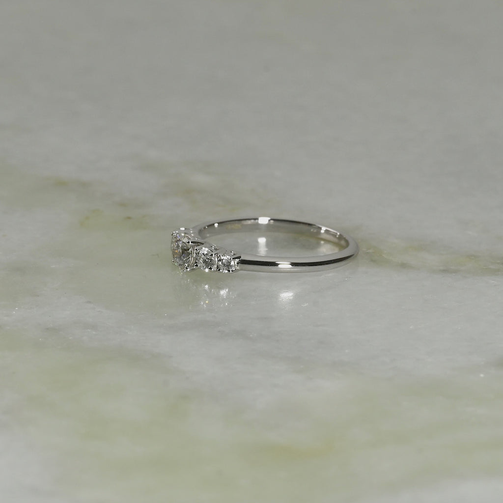 Ring i 14 karat hvitt gull med fem lab-grown diamanter. Senterstenen er på 0,3 ct., og totalt måler de fem runde, briljantene 0,5 ct.