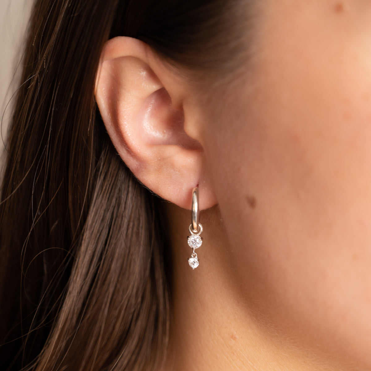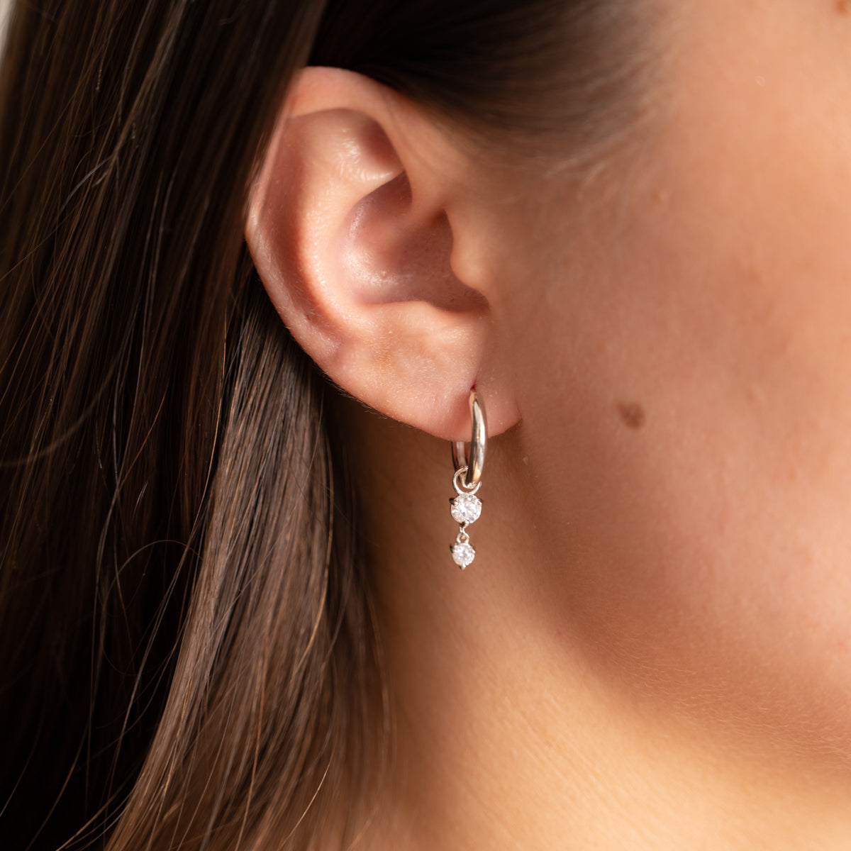 Små creoler i 100% resirkulert 925 sterlingsølv med anheng med to zirkoniastein. Våre øreringer i Elenor er tidløse klassikere som aldri går av moten. Anhenget kan enkelt tas av creolen hvis du vil style øreringene litt ned, og den fungerer dermed som 2-i-1!