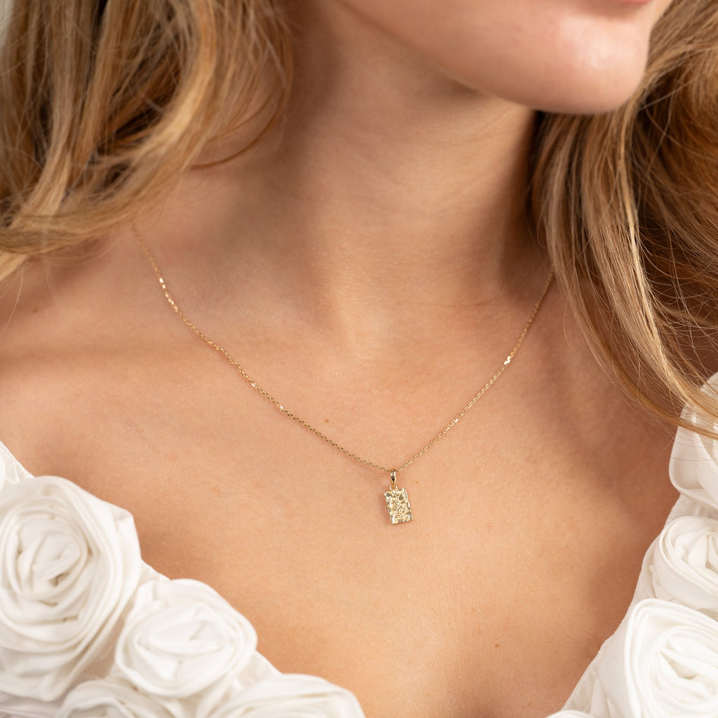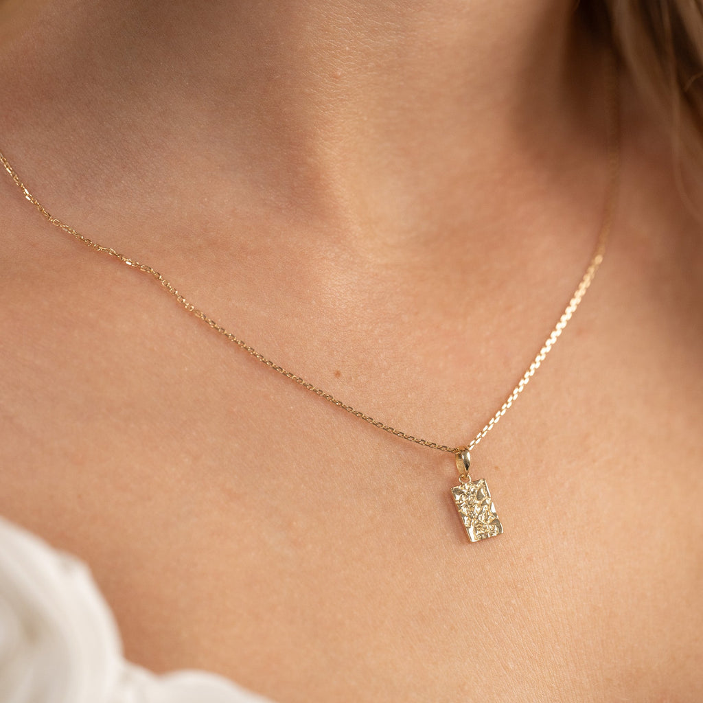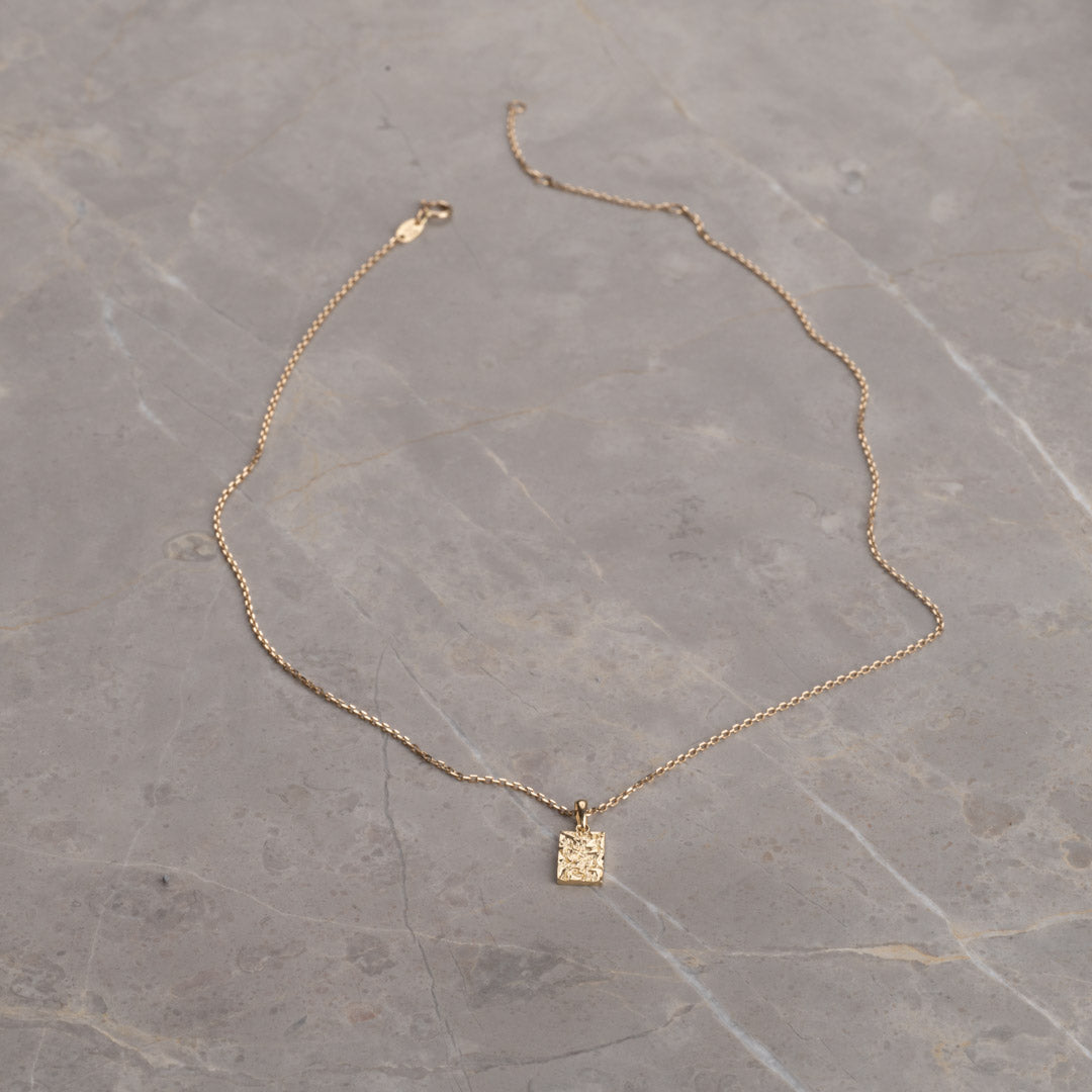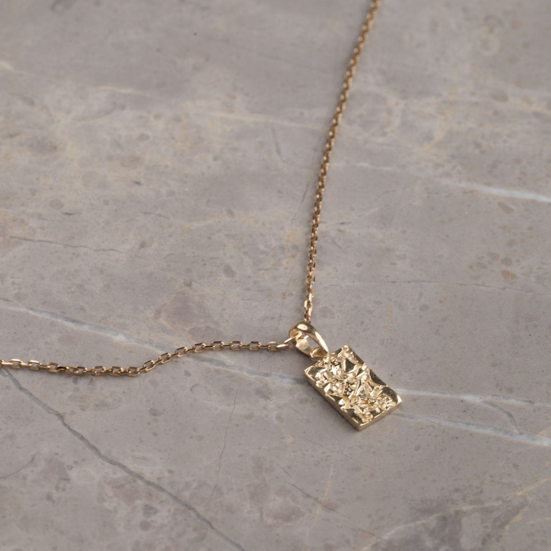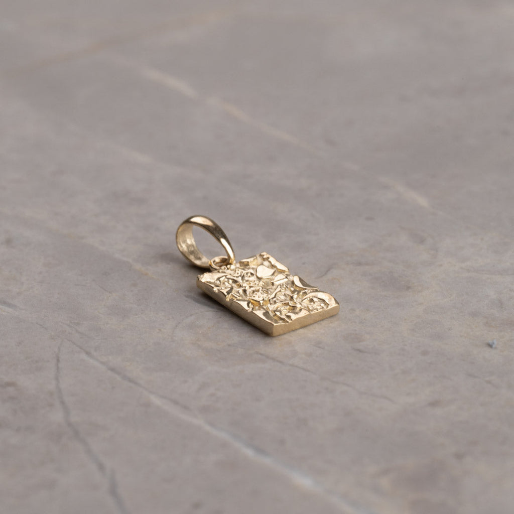 Anheng i massivt gull i utformet som et rektangel. Overflaten på anhenget er støpt, noe som gir en fin og lett rå struktur. Selve anhenget måler 6,5x10mm (uten hempen).