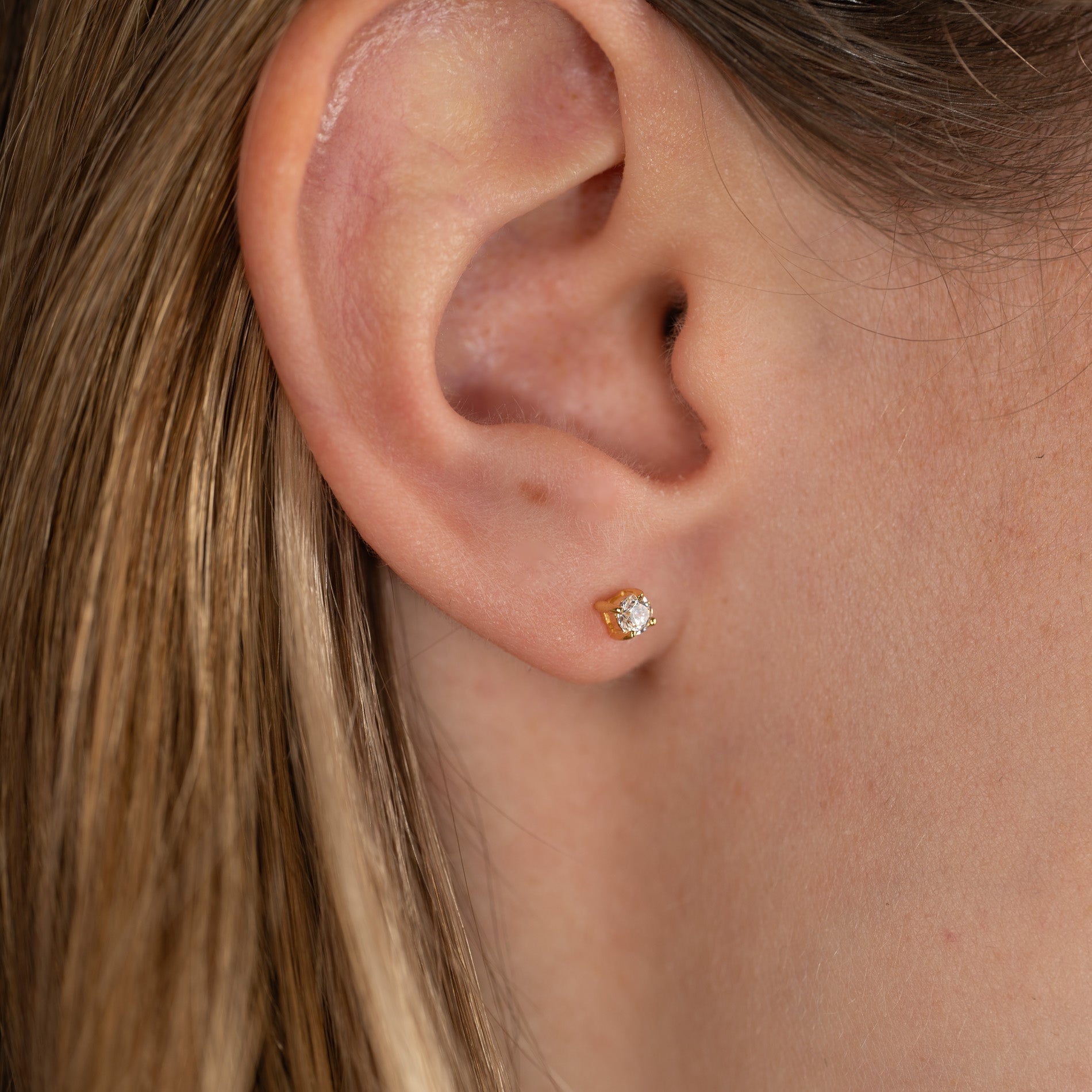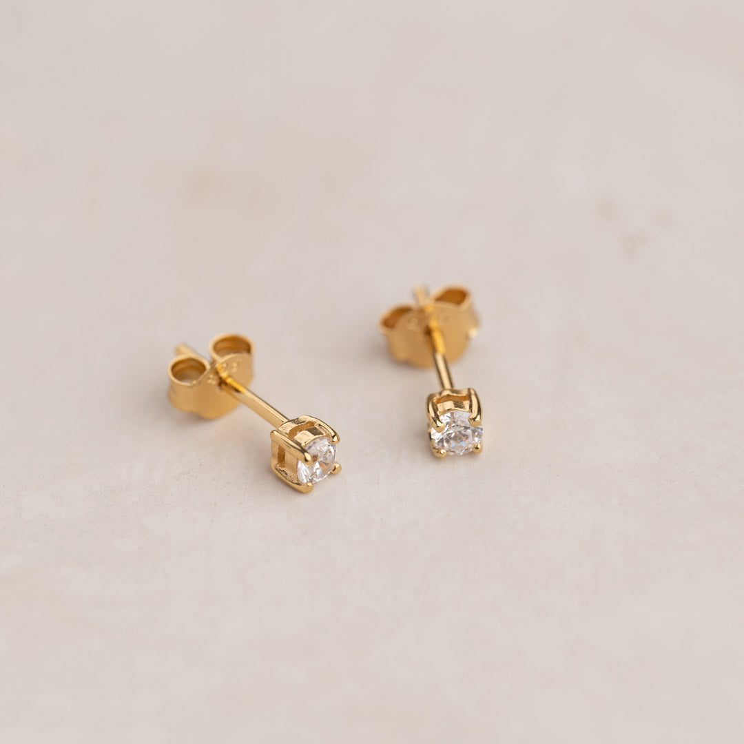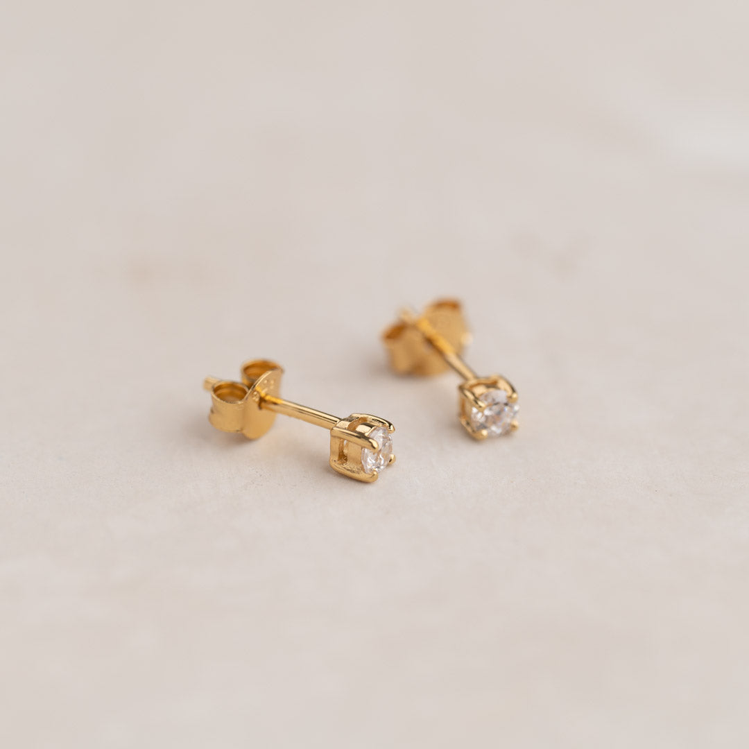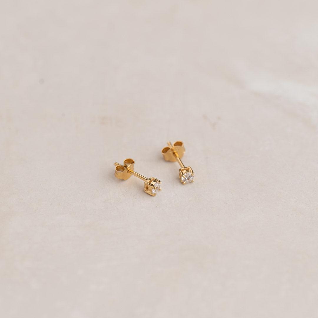 Våre øreringer Ena er laget av 100% resirkulert 18 karat forgylt sterlingsølv besatt med klare kubiske zirkoniastener. Stenene er brilliantslipte og har en diameter på 3mm - og sitter i en klassisk omfatning med fire griper.