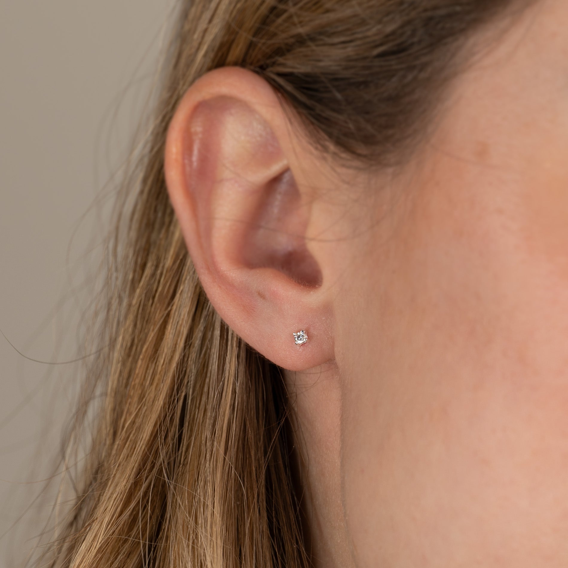 Våre øreringer Ena er laget av 100% resirkulert sterlingsølv besatt med klare kubiske zirkoniastener. Stenene er brilliantslipte og har en diameter på 2mm - og sitter i en klassisk omfatning med fire griper.