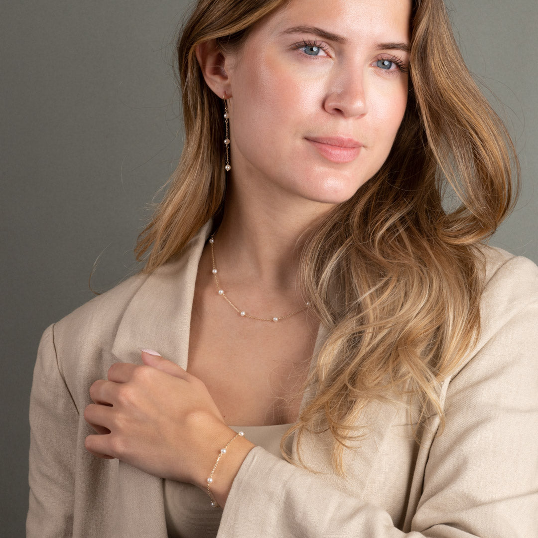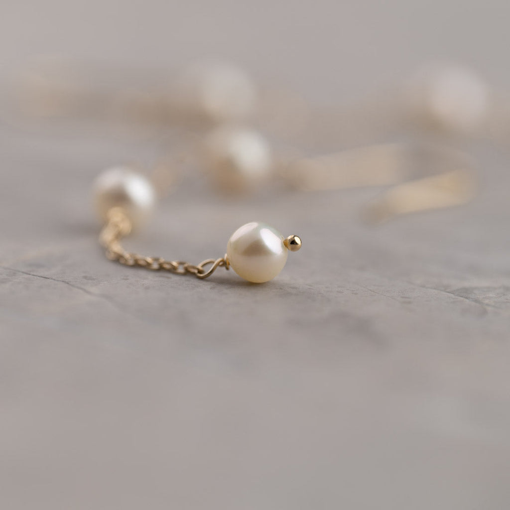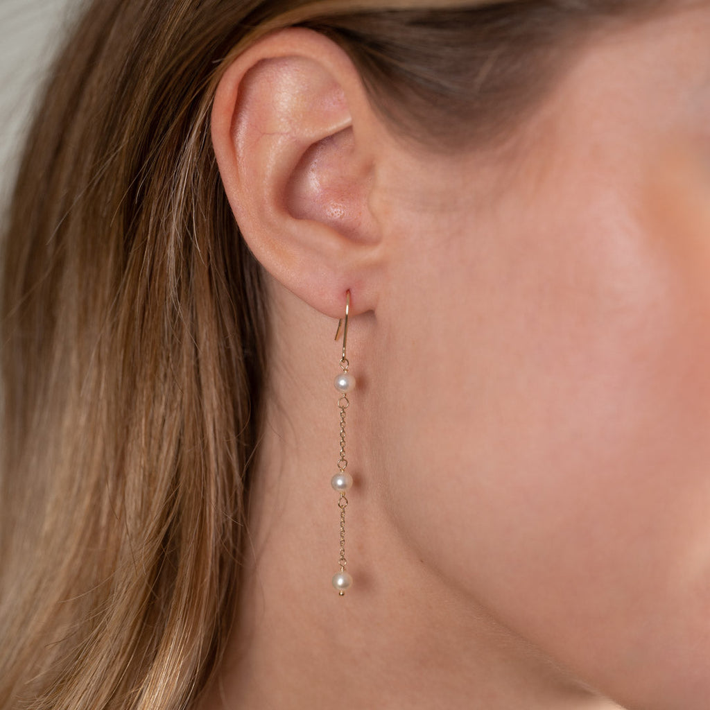 Våre Erica perleøredobber er laget av 100% resirkulert 9 karat massivt gull, med fine hvite ferskvannsperler. De fine øredobbene er designet med en ørekrok med et hengende gullkjede med 3 små perler jevnt fordelt.
