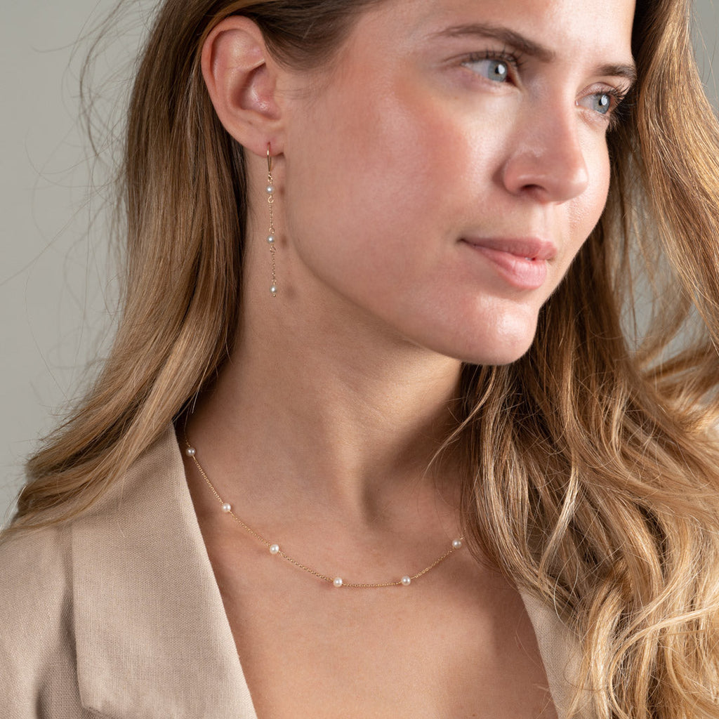 Vår Erica gull-halskjedet med perler er laget av 100% resirkulert 9 karat massivt gull, med fine hvite ferskvannsperler. Det vakre halskjedet er utformet med et gullkjede og 8 små perler jevnt fordelt rundt halsen.