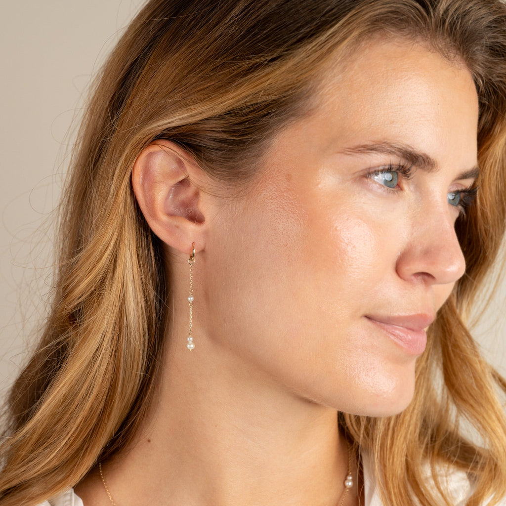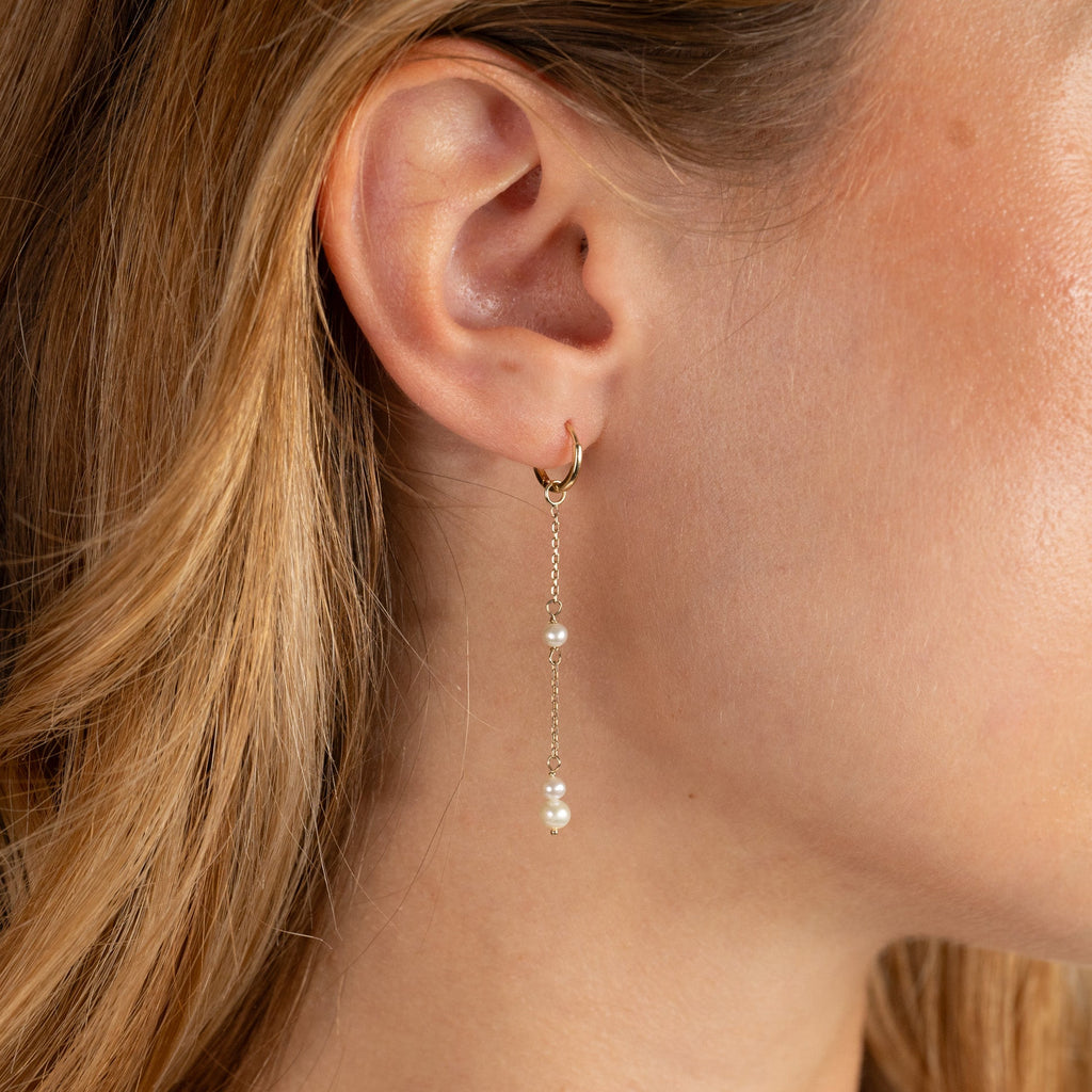 Øreringer i 100% resirkulert 9 karat massivt gull med små, runde hvite ferskvannsperler.