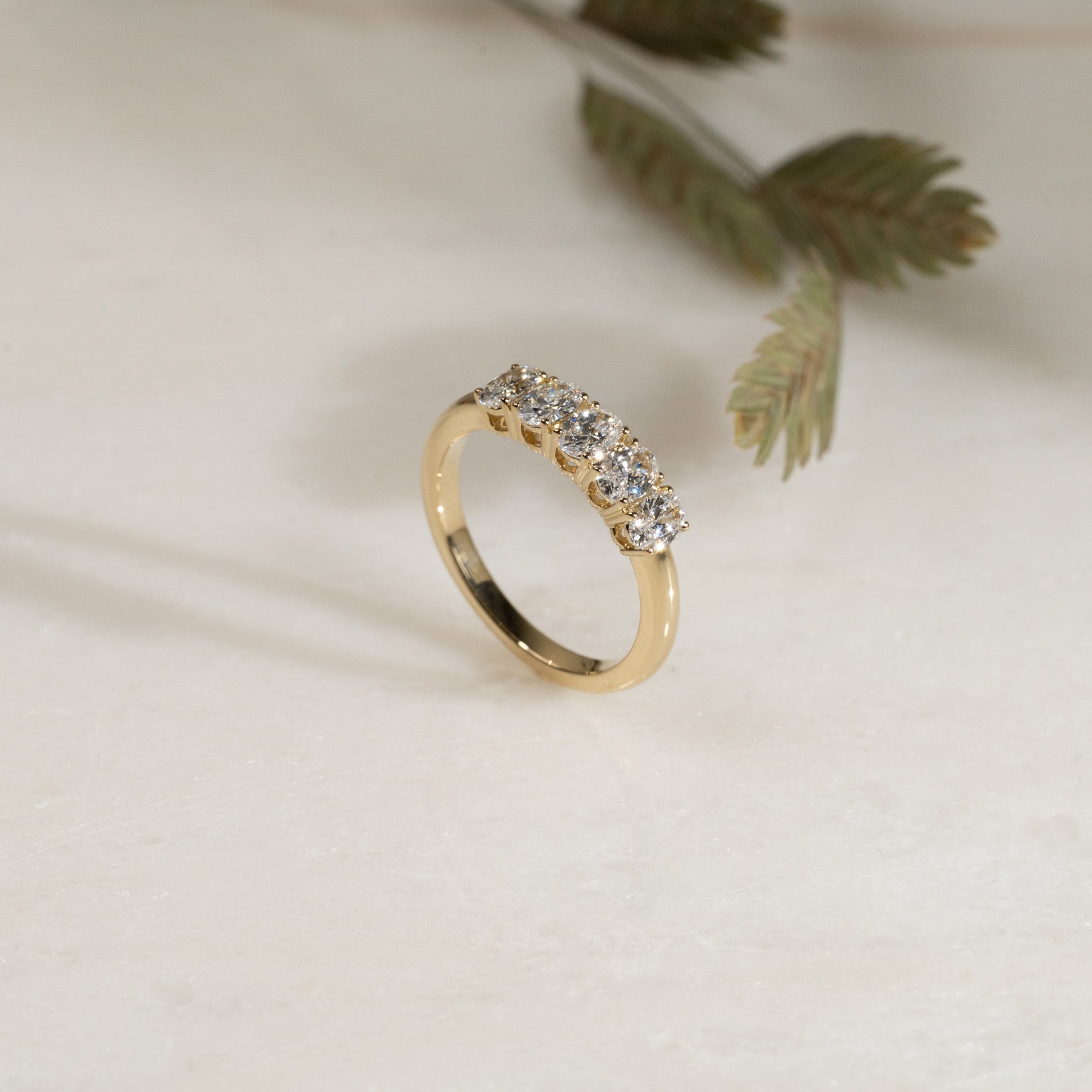 Femsteinsring i 14 karat hvitt gull eller gull med 5 ovale lab-grown diamanter.