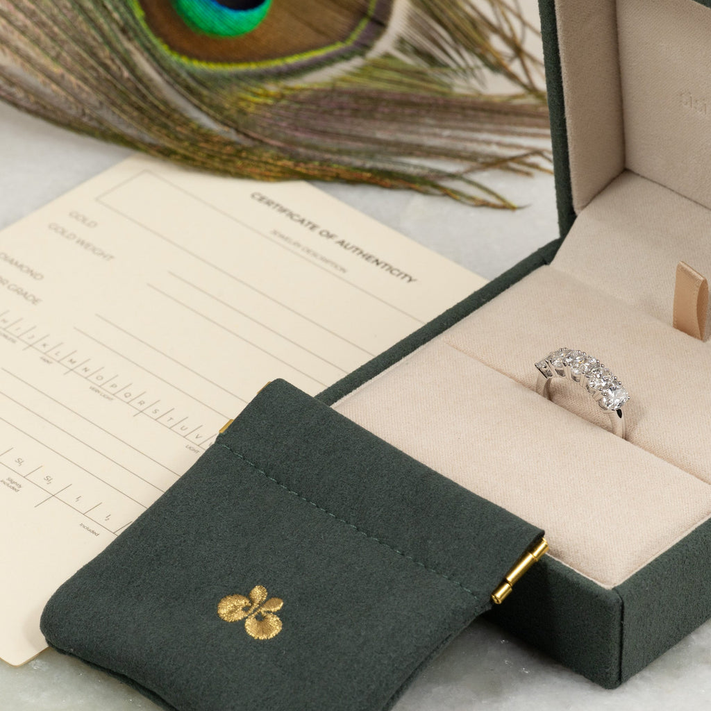 Når du mottar smykket, vil det være i vår gaveeske, bundet med et vakkert matchende silkebånd, klar til å gis som gave. Inne i esken finner du en smykkeboks, en pose og et ekthetsbevis.