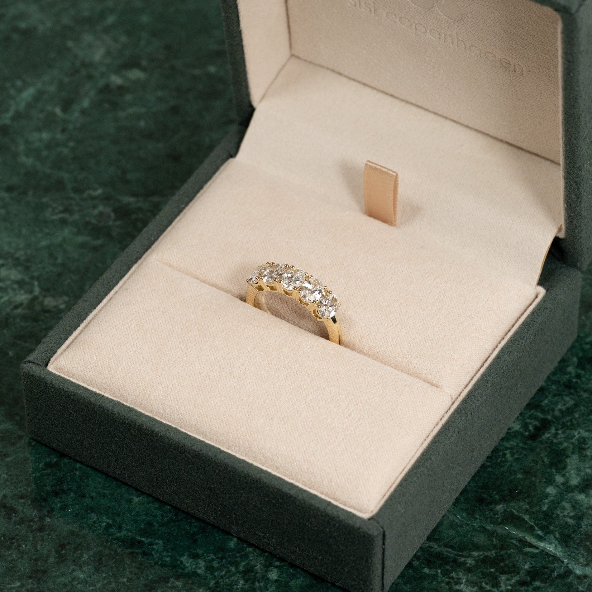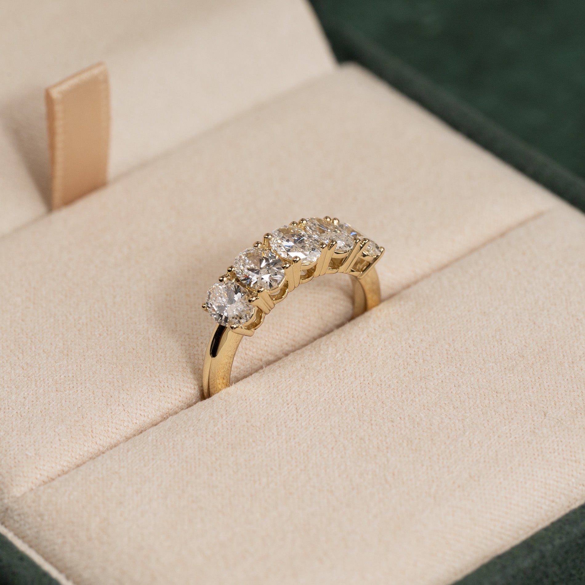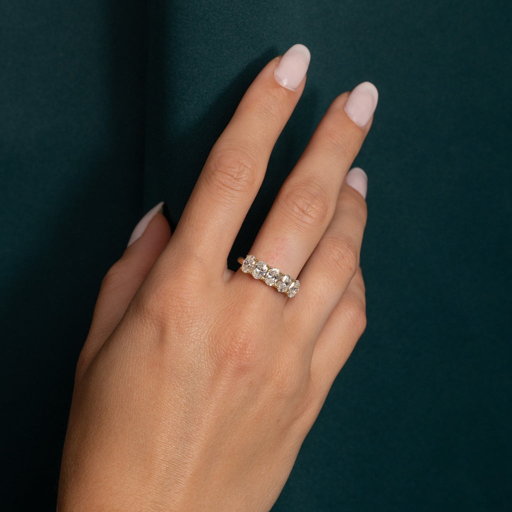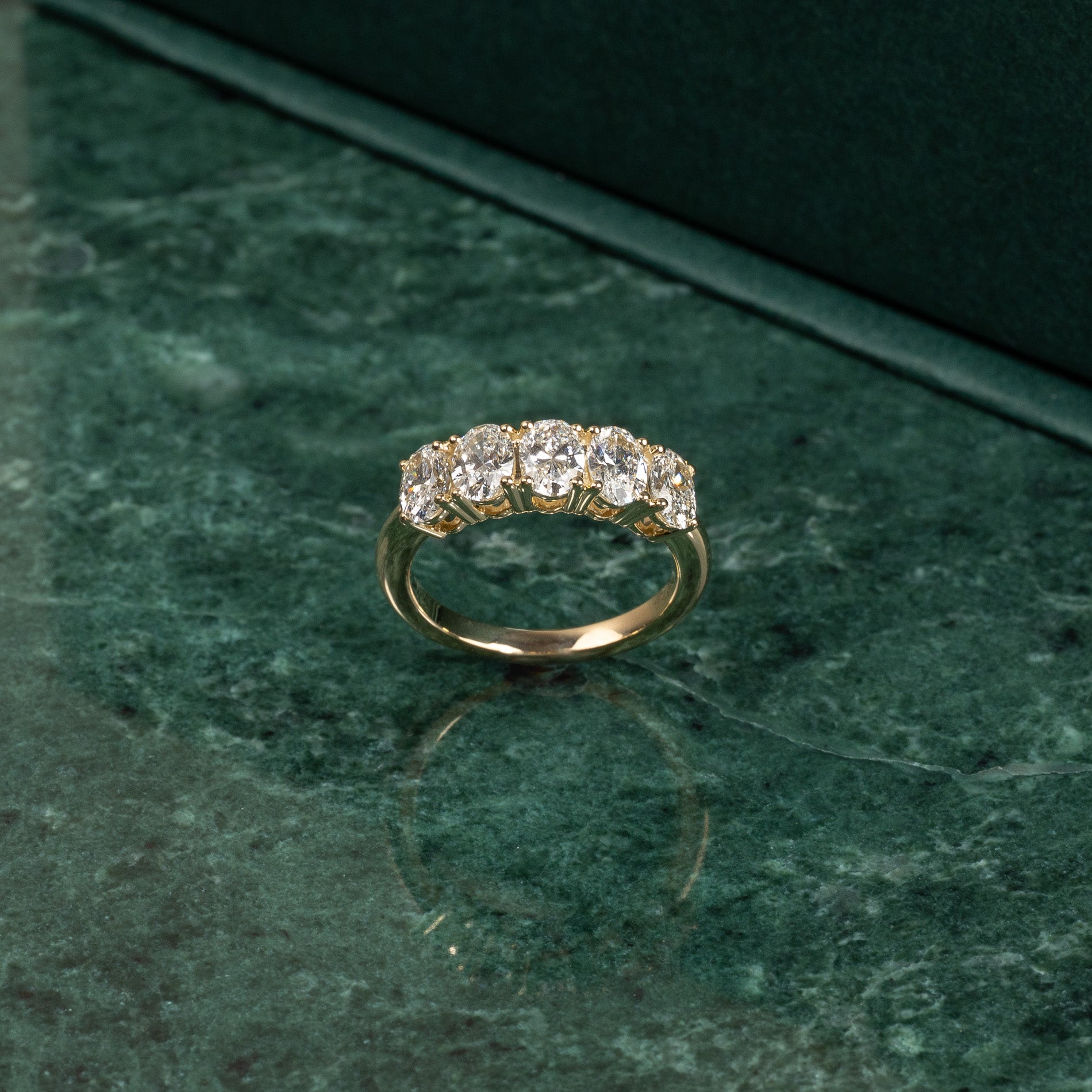 Femsteinsring i 14 karat gull med 5 ovale lab-grown diamanter på 0,4 karat hver, med en samlet vekt på 2 carat.